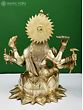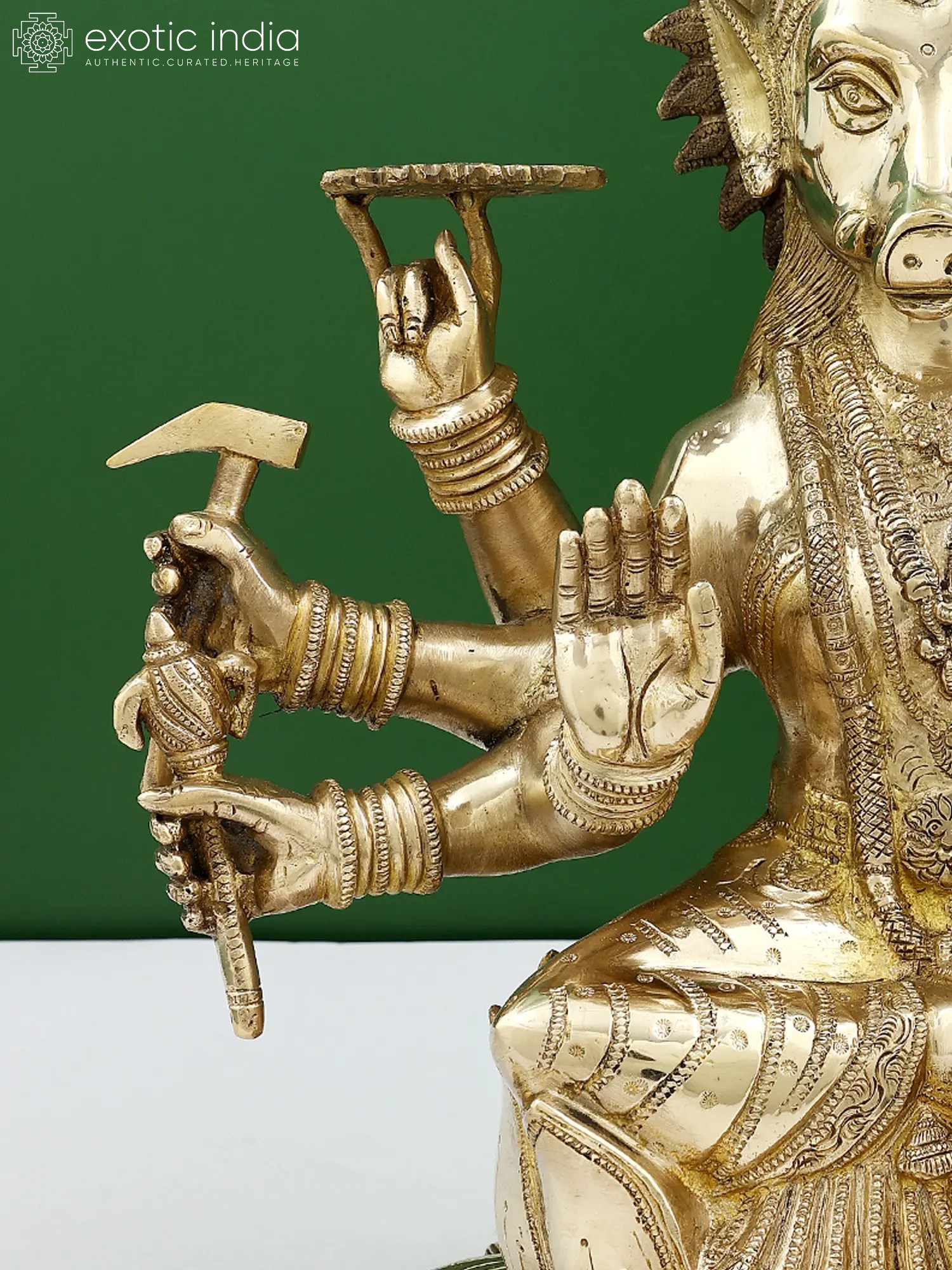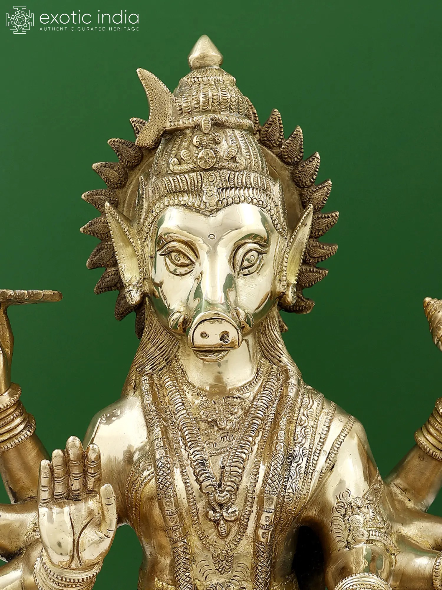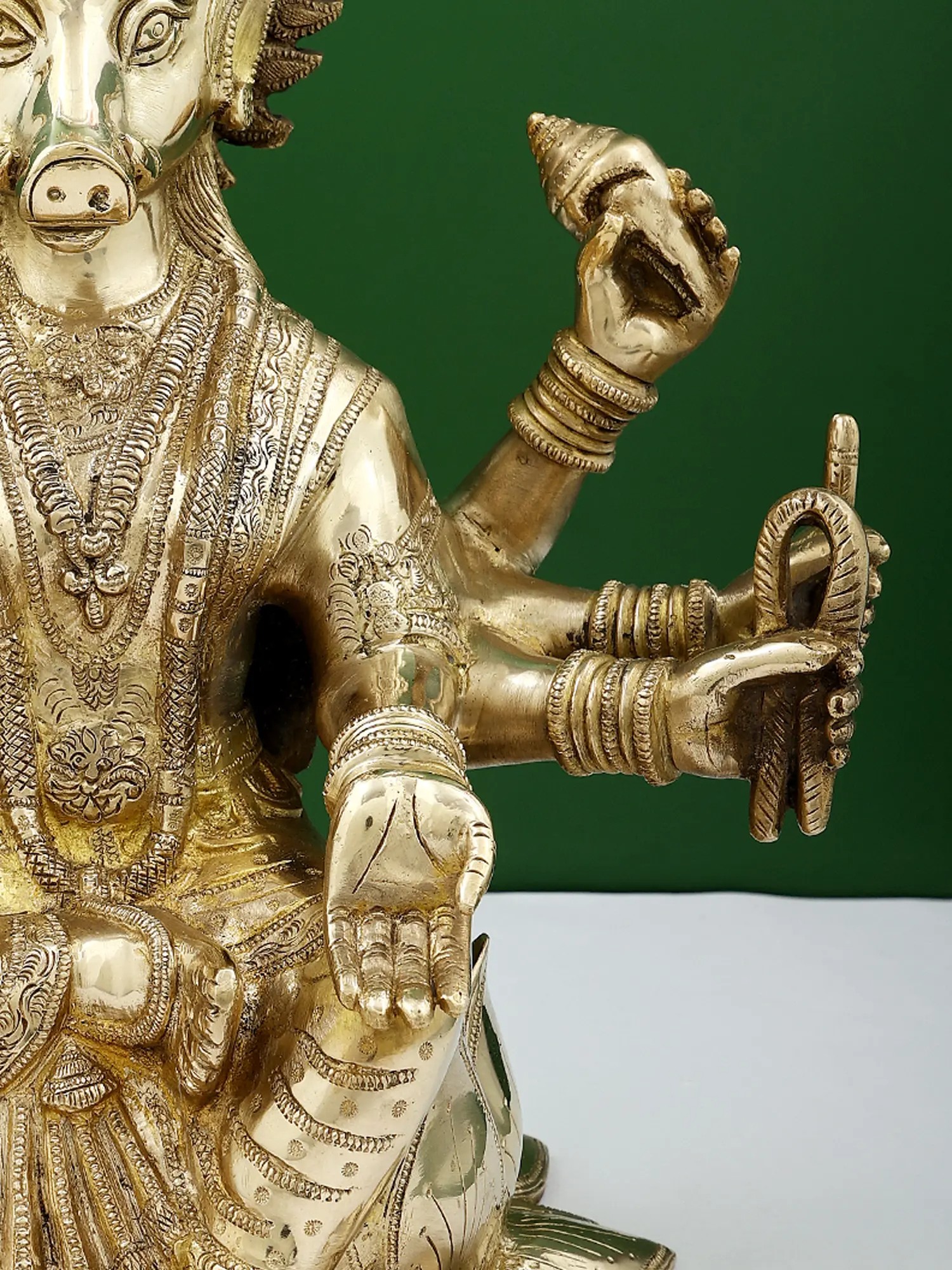 Despite the porcine face, Devi Varahi is no less in terms of symmetry of feature and the compassion of Her bearing. An engraved crown, a sun-like halo. Vaishnavite implements in Her many hands, especially the discus in the posteriormost right. A pure brass saptamatrka murti such as this one would be an unusual addition to the home or office temple of the Vaishnavite devotee.