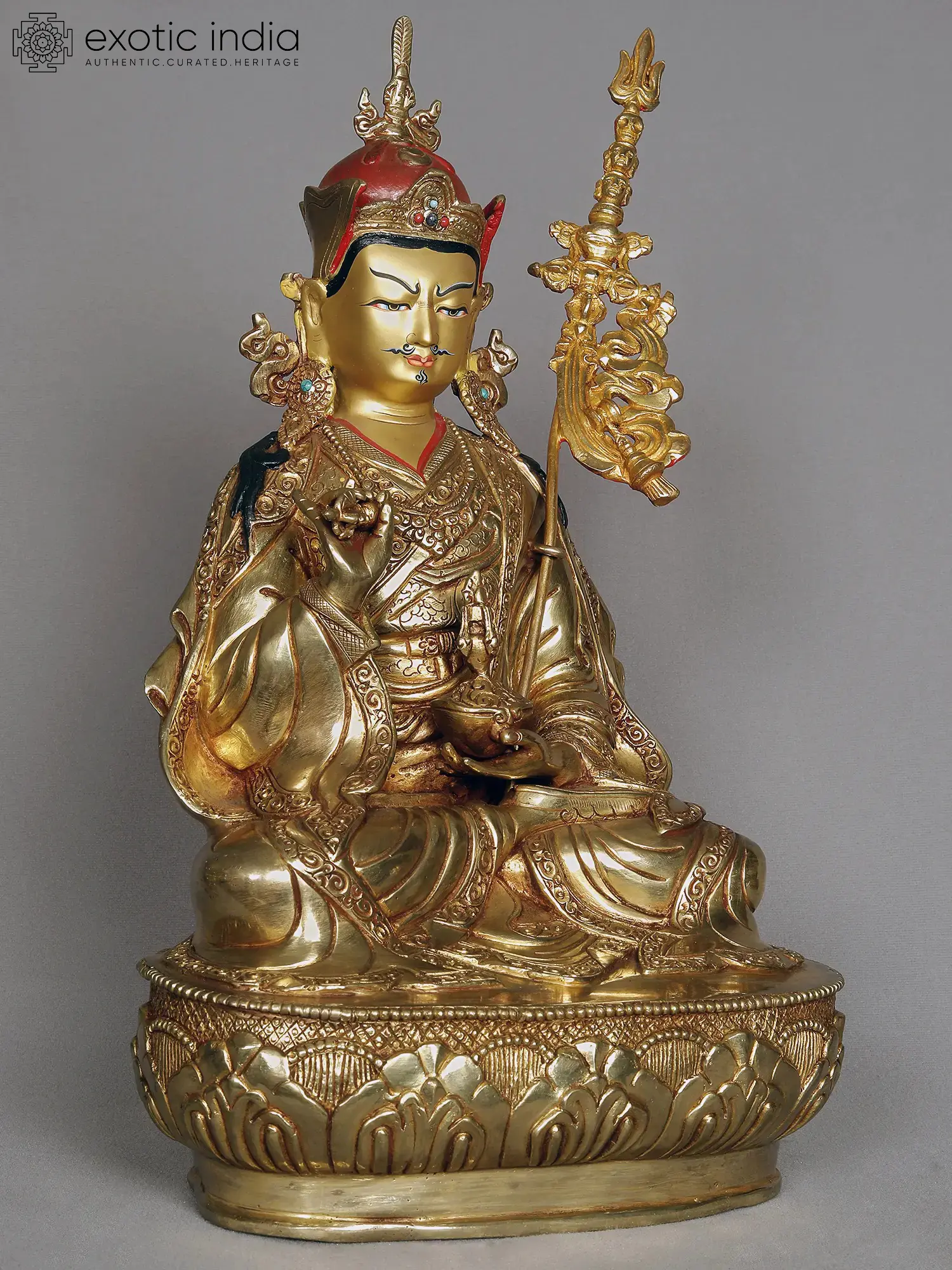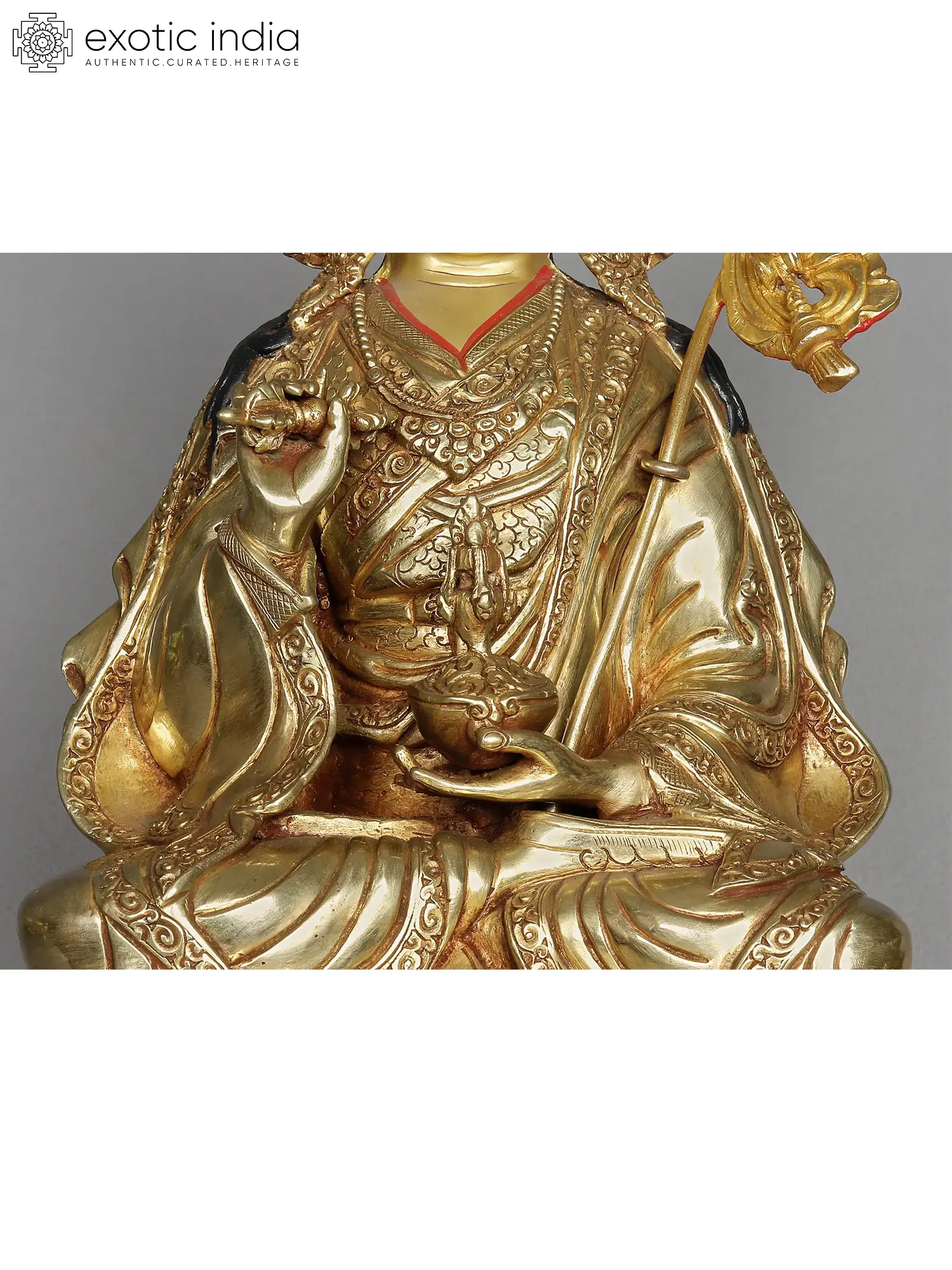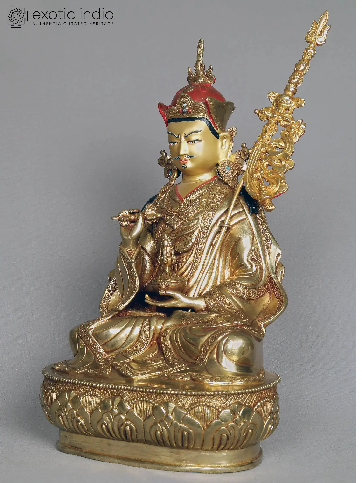 Guru Padmasambhava is considered a precious guru as he taught Vajrayana in Tibet and is credited for introducing Buddhism in Tibet. He is also known as Guru Rinpoche. Guru Padmasambhava radiates an aura of profound wisdom and mastery. Seated atop a moon disc, his commanding presence is accentuated by the iconic red lotus hat that graces his golden form, an emblem of his enlightened insight. With an unwavering gaze, he holds the Vajra, a symbol of unyielding spiritual power, in his right hand. His left-hand cradles a skull cup, a vessel of transformation and transcendence, while the Trident rests gracefully upon his left shoulder. Guru Padmasambhava's visage is a testament to his enlightenment — a resplendent golden hue encompasses his being, while his distinctive red hat signifies the Nyingmapa tradition, renowned as the 'red hat sect' of Tibetan Buddhism.