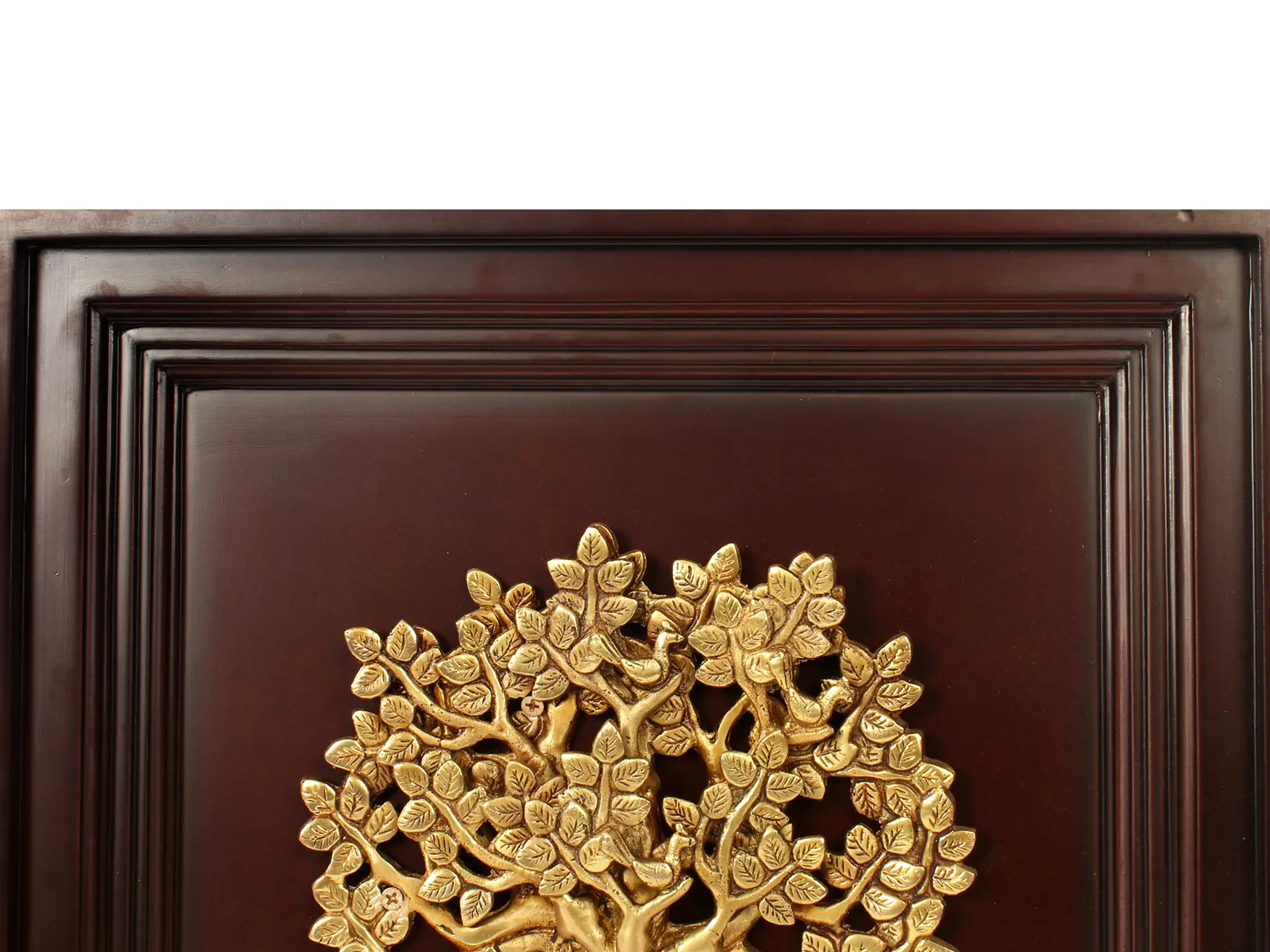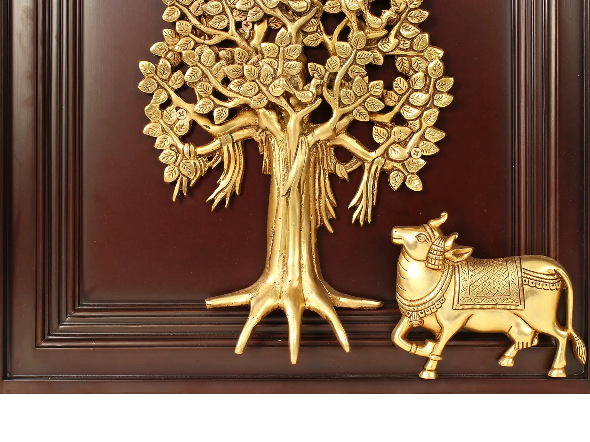 Sculpted from brass, both the Kalpavrksha and Kamadhenu are two-dimensional works, embossed on a solid wood base. Its deep brown colour brings out the brilliant gold colour of pure brass. Despite the minimalism, a great deal of detail has been introduced into the brass sections of the work - the venation of each leaf in Kalpavrksha’s luxuriant canopy, the natural striations down its bark, and the lifelike body language of Kamadhenu.
