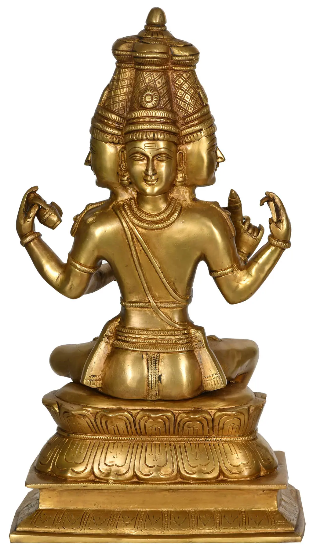 He, who is the creator, his hands adorned not with weapons but symbols of knowledge and creation, Brahma holds the sacred Vedas, a mala representing time, a sruva or shruk symbolizing the means to feed the sacrificial fire, and a kamandalu carrying water, the source of all creation. This handmade statue encapsulates the essence of Brahma's cosmic role. Each of his four mouths is a testament to the creation of the four Vedas, embodying the profound wisdom and creative force of the universe.