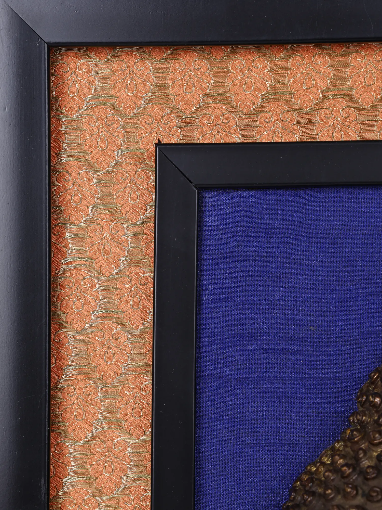 The golden luster of brass is complemented by a silken blue backdrop and contrasted by a soft, peach-toned brocaded piece of cloth, adding a rich detail to the sacred decor.