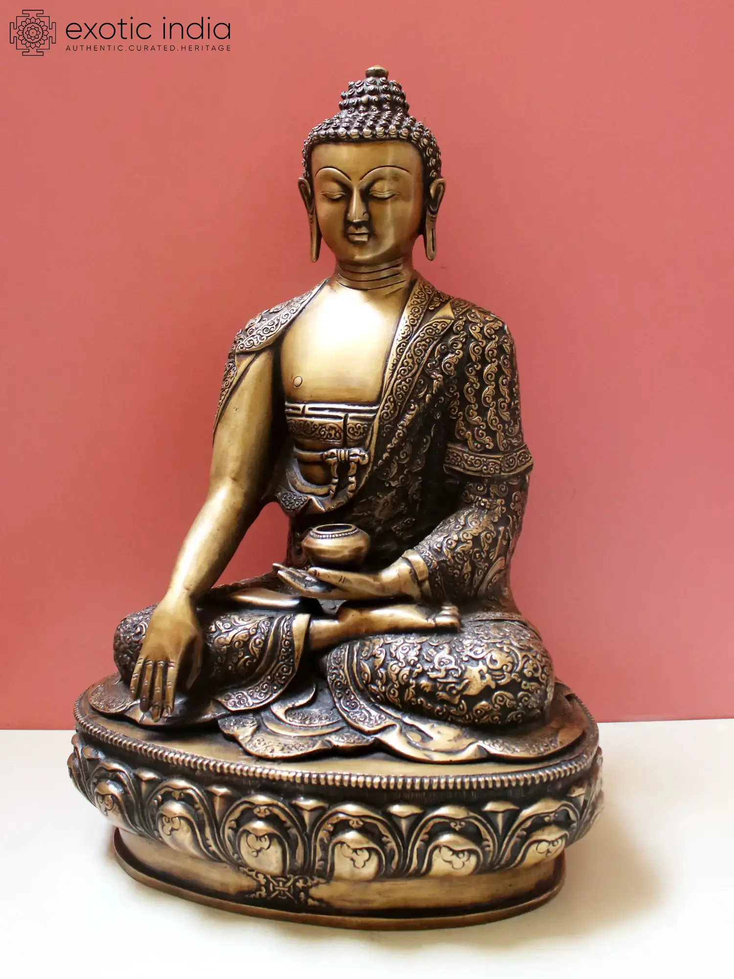 16" Lord Buddha in Bhumisparsha Mudra with Pindapatra (Robes Decorated with Chinese Auspicious Symbols, Dragons, Deer and Garuda) In Brass | Handmade | Made In India
