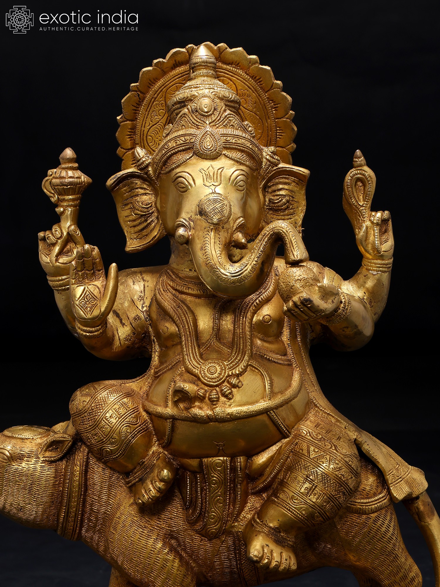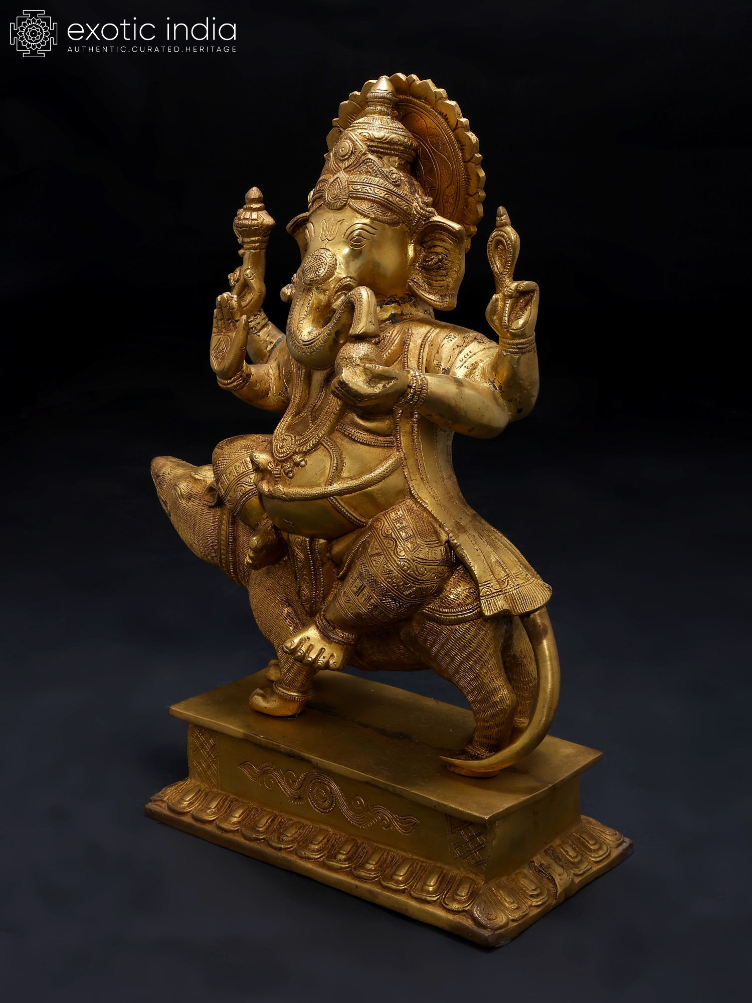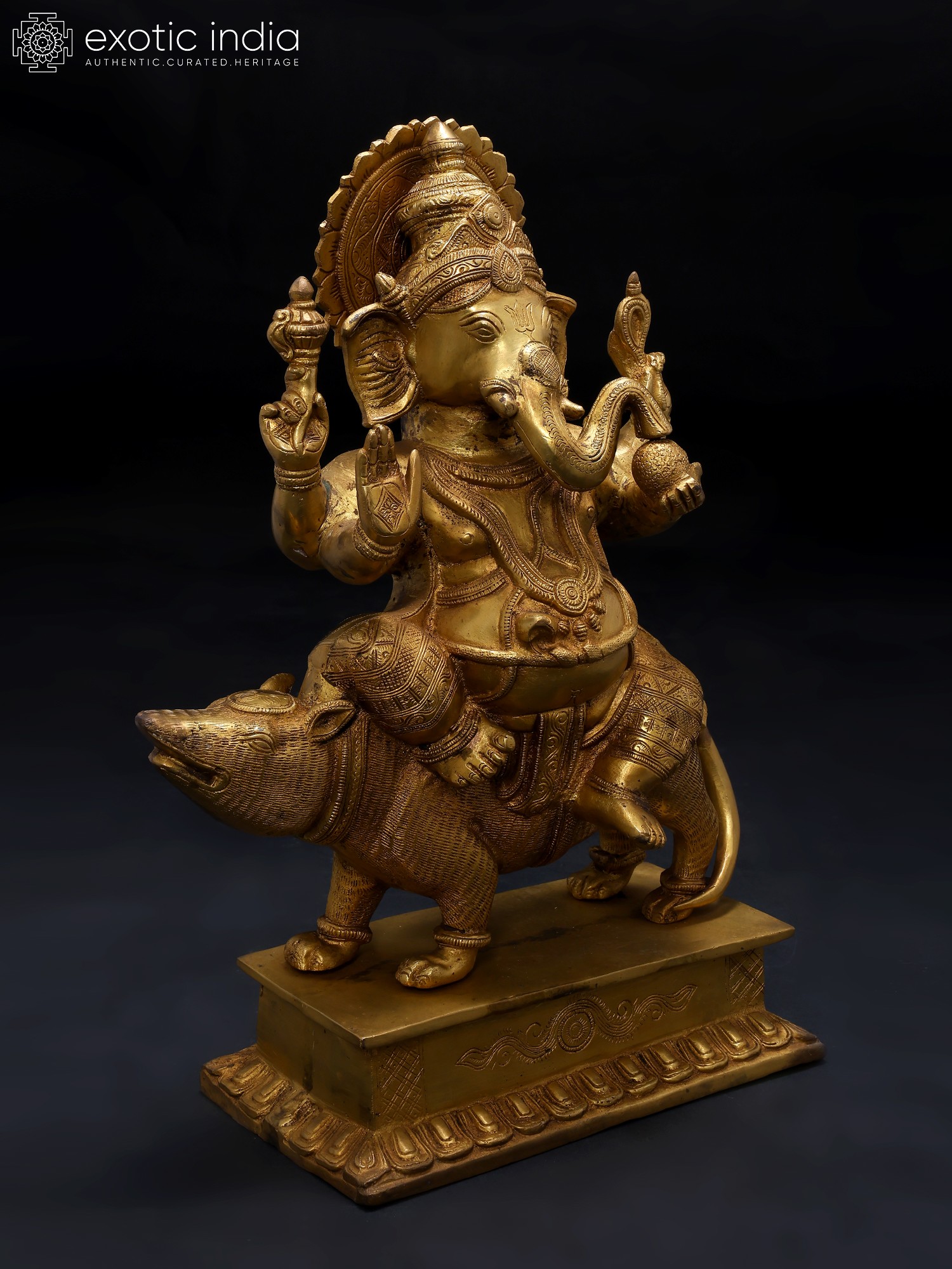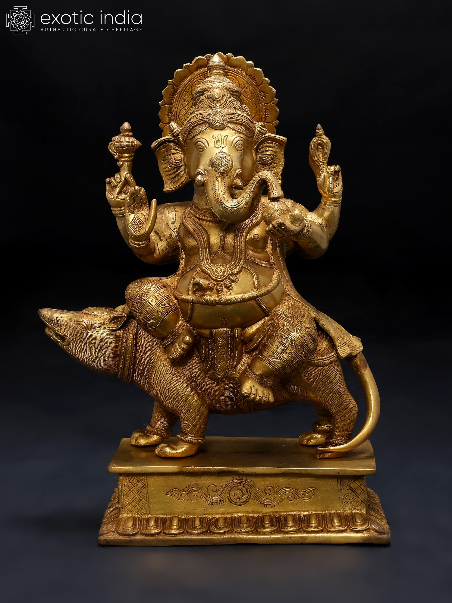 This brilliant four-armed image of Lord Ganesha, seated on his mount mouse, not tiny as it is in most of the sculptures representing Lord Ganesha but more like a bear, large in size modeled propo"