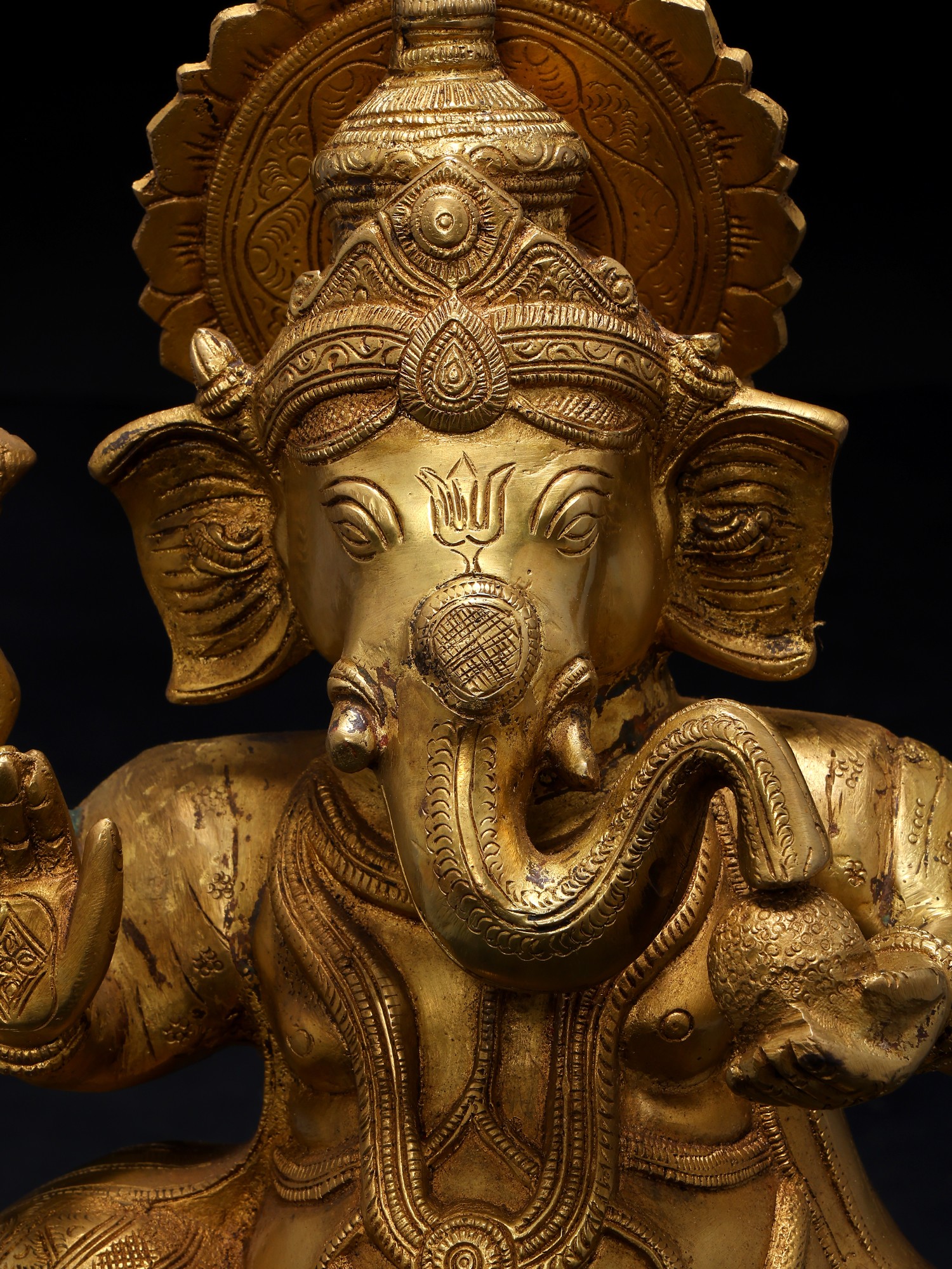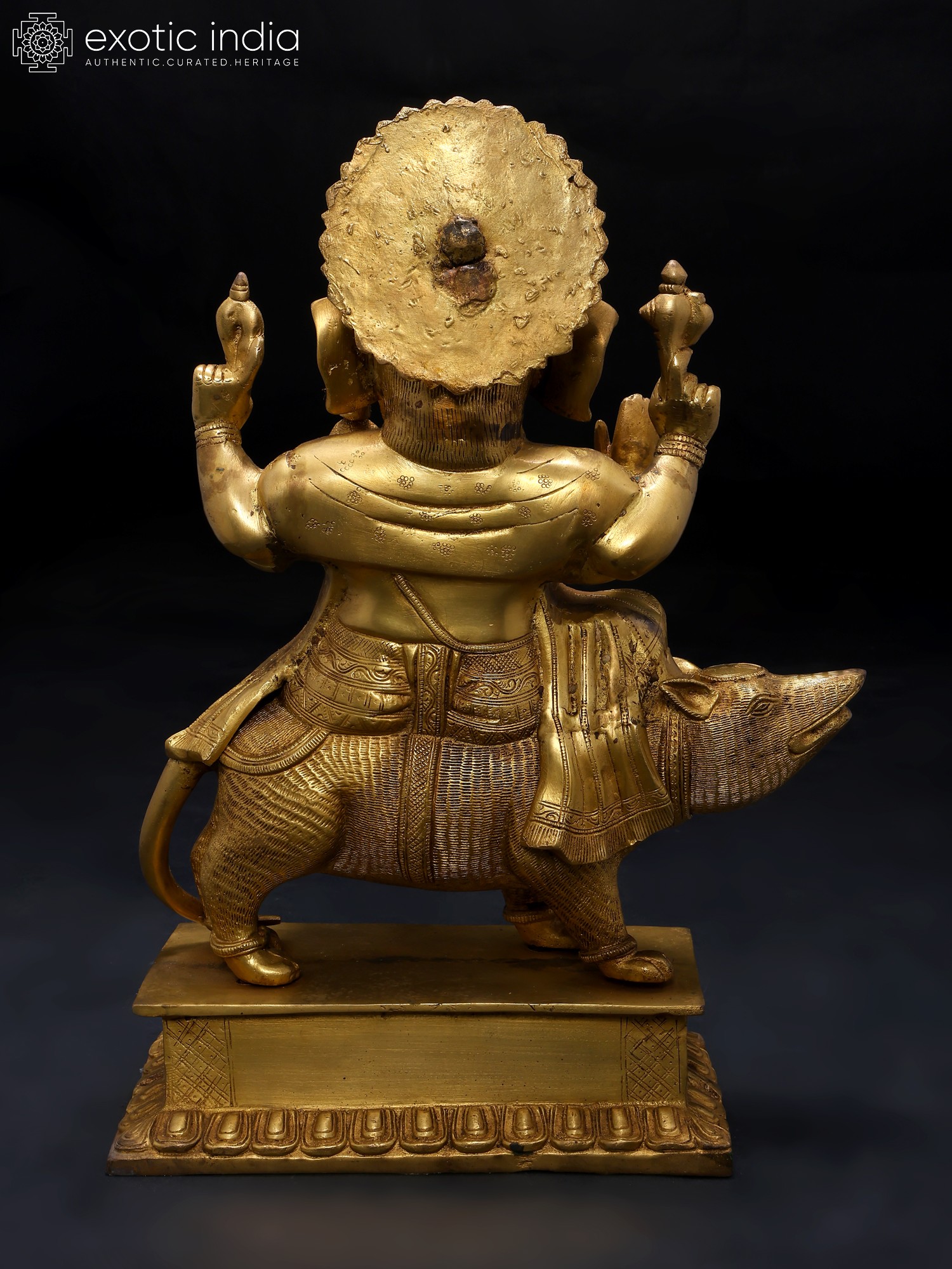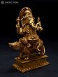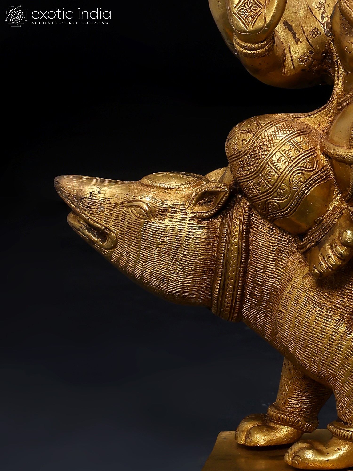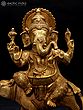This brilliant four-armed image of Lord Ganesha, seated on his mount mouse, not tiny as it is in most of the sculptures representing Lord Ganesha but more like a bear, large in size modeled propo"