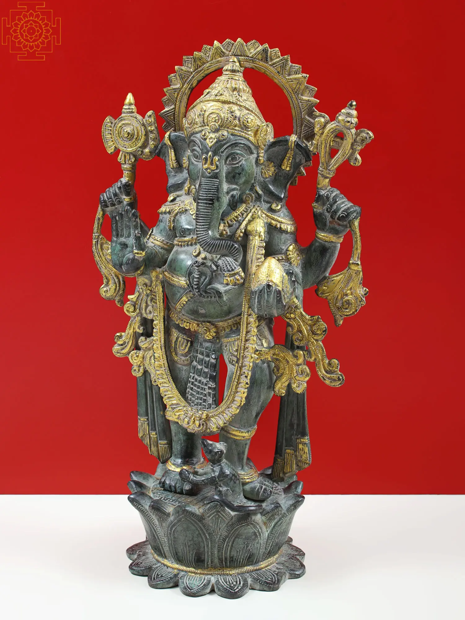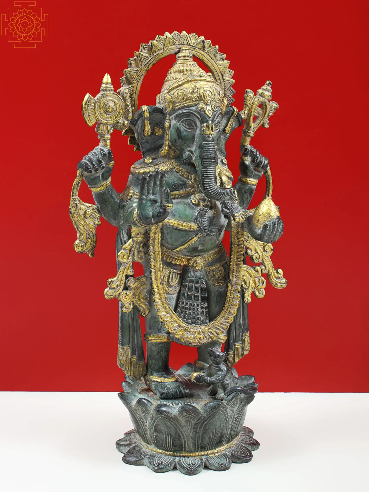 Each element of this statue is rendered with remarkable detail. Lord Ganesha is depicted with his characteristic four arms, each holding significant symbolic objects. The lotus upon which he stands is a potent symbol of purity, enlightenment, and spiritual awakening. It signifies that even amidst the earthly realm, one can rise above worldly attachments and achieve spiritual perfection. The serene expression on his face and the gentle pose of his hands convey a sense of peace and reassurance. The intricate carvings and the contrasting patinas of the brass create a visually stunning piece that is both an artistic masterpiece and a sacred icon. This statue is a perfect addition to any altar, home, or office, radiating positive energy and good fortune.