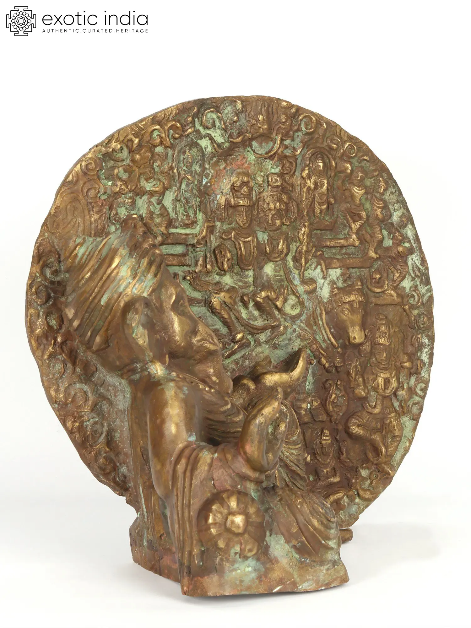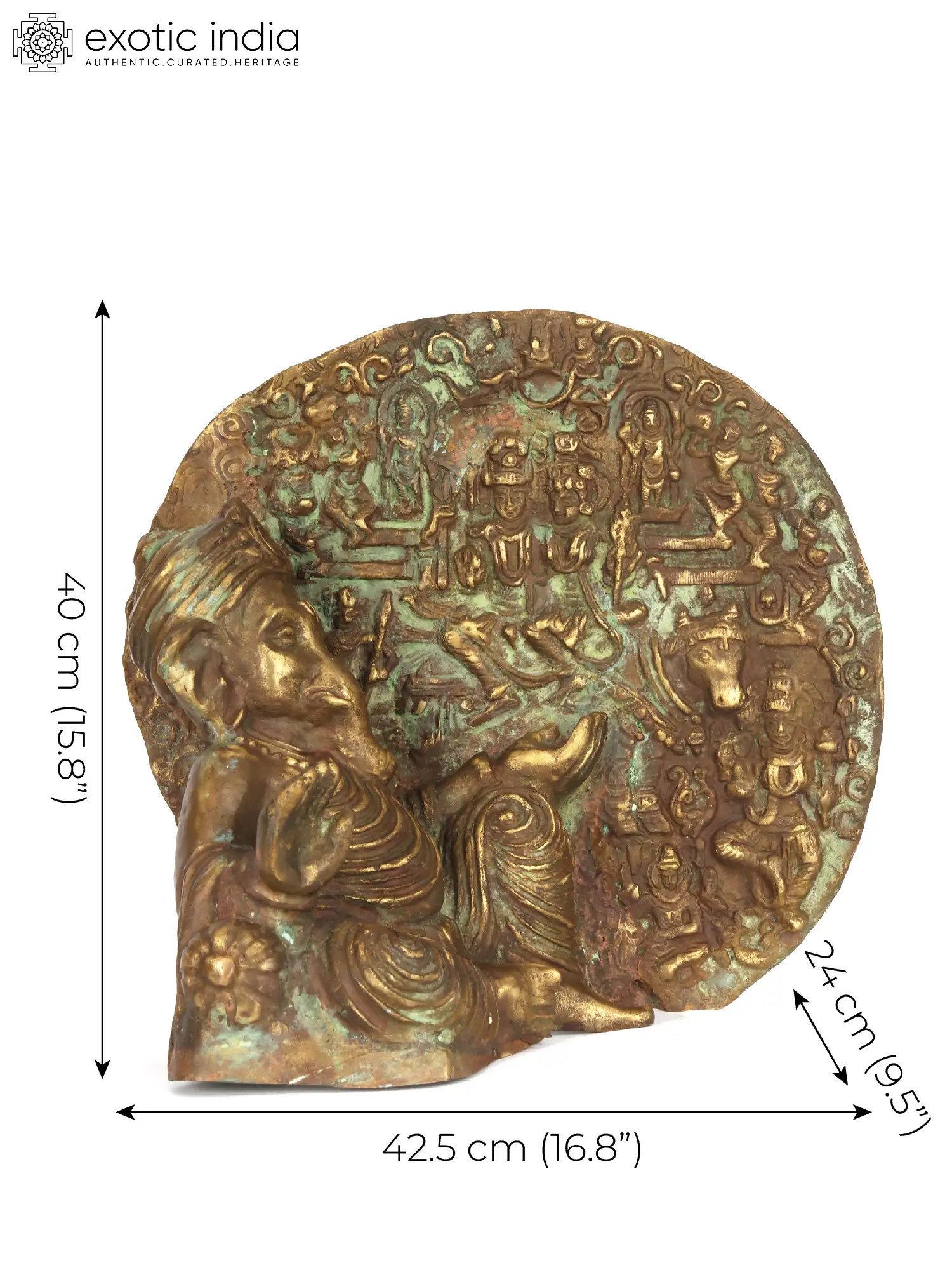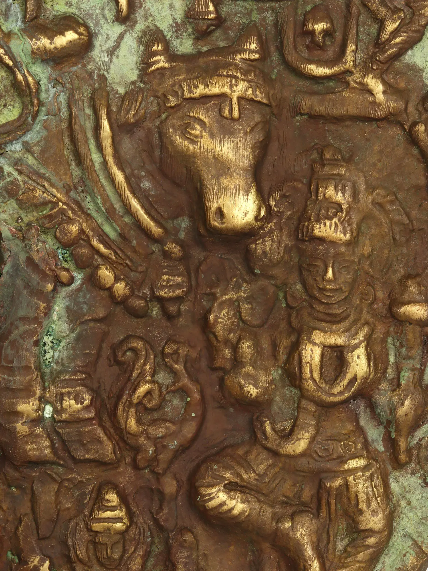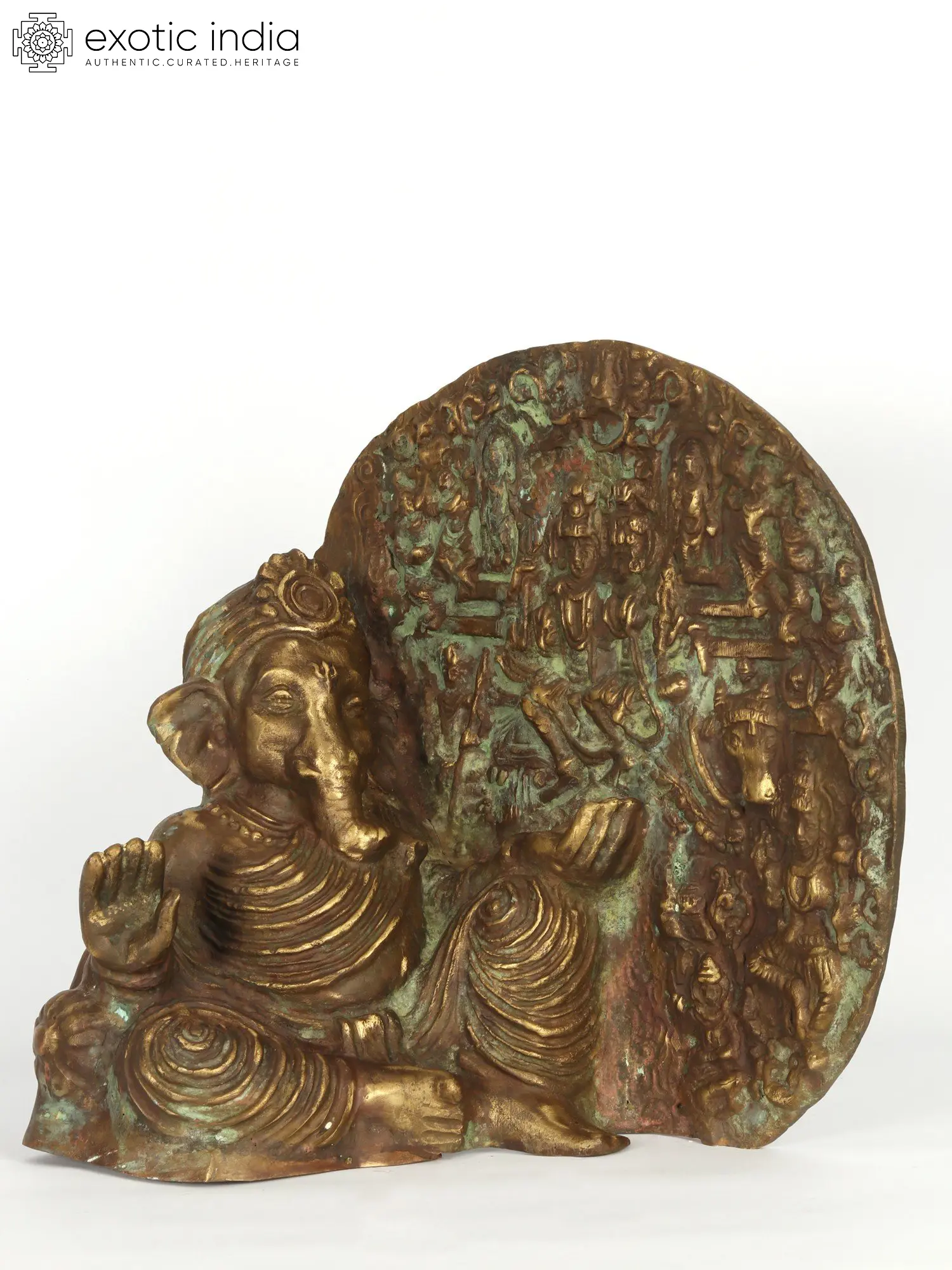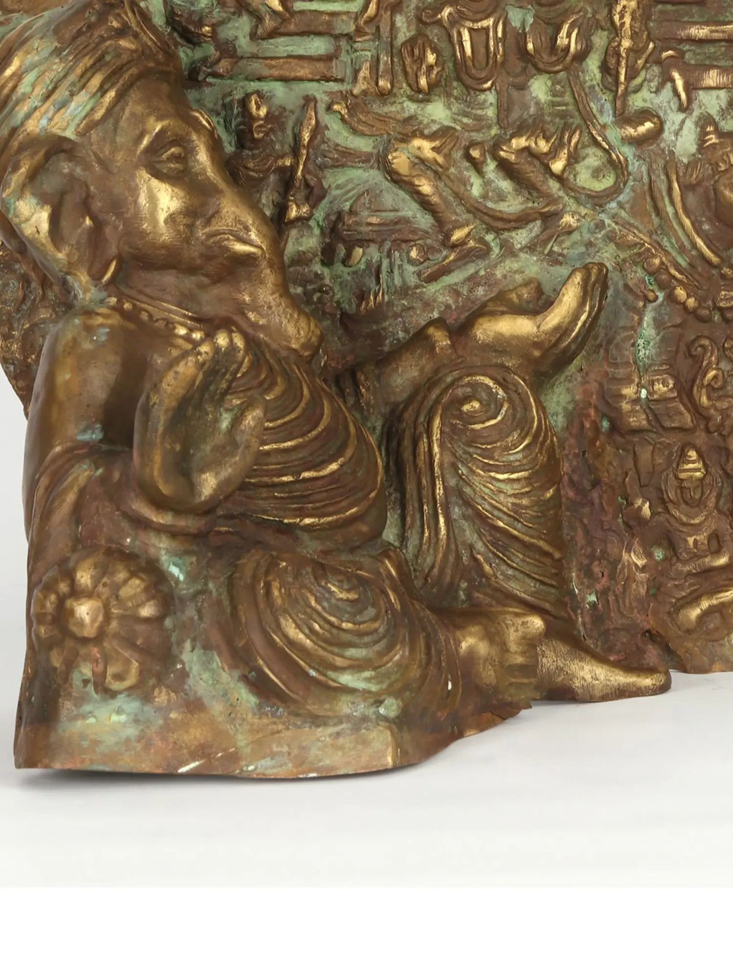 This Large Panchaloha Sculpture is a remarkable depiction of Lord Ganesha and his parental Universe, that is Shiv and Shakti. Once upon a time, Both Ganesha and his brother Kartikeya wanted a fruit that comprised supreme knowledge and immortality. The divine couple decided to give the fruit to the son who manages to encircle the world three times. Karthikeyan took his peacock and flew into space where according to Lord Ganesha, his vehicle, the mouse would never be able to help him win. So, he used his wisdom and started encircling his parents, Shiv and Shakti. He believed that the world was within them which led him to win the fruit. This Sculpture symbolizes the eternal devotion of Lord Ganesha to his parents and reminds us of their Divine Family Bond.