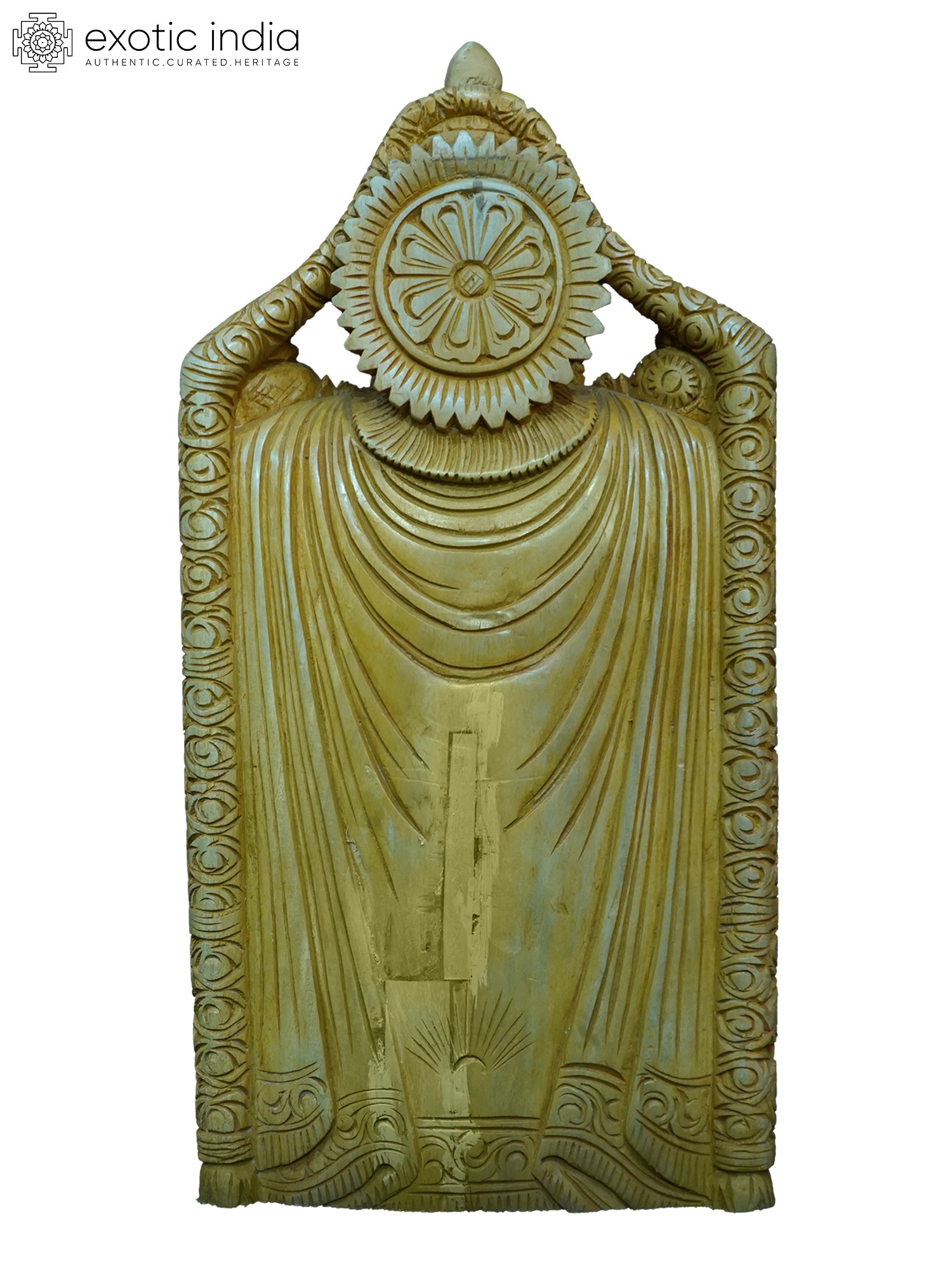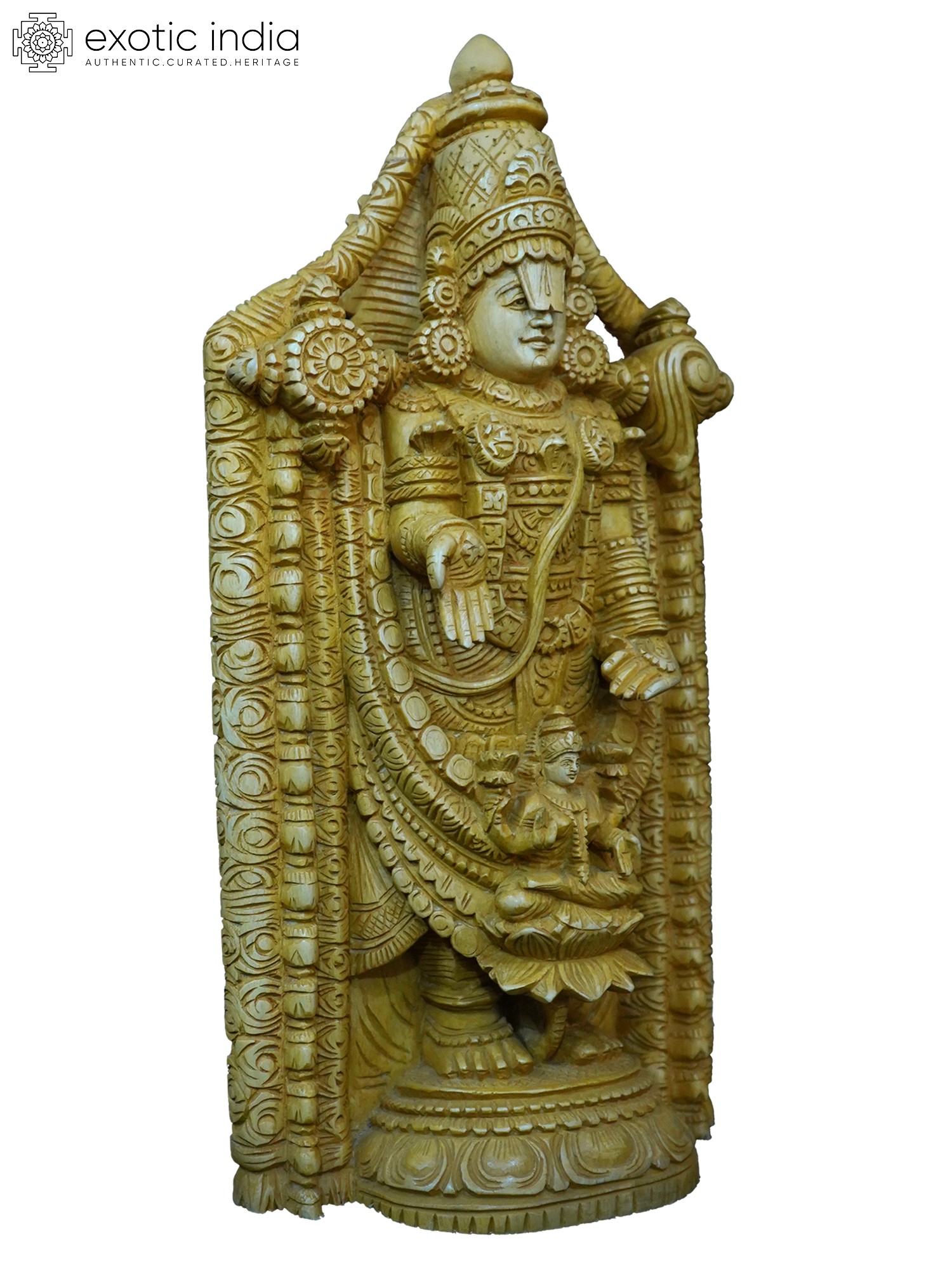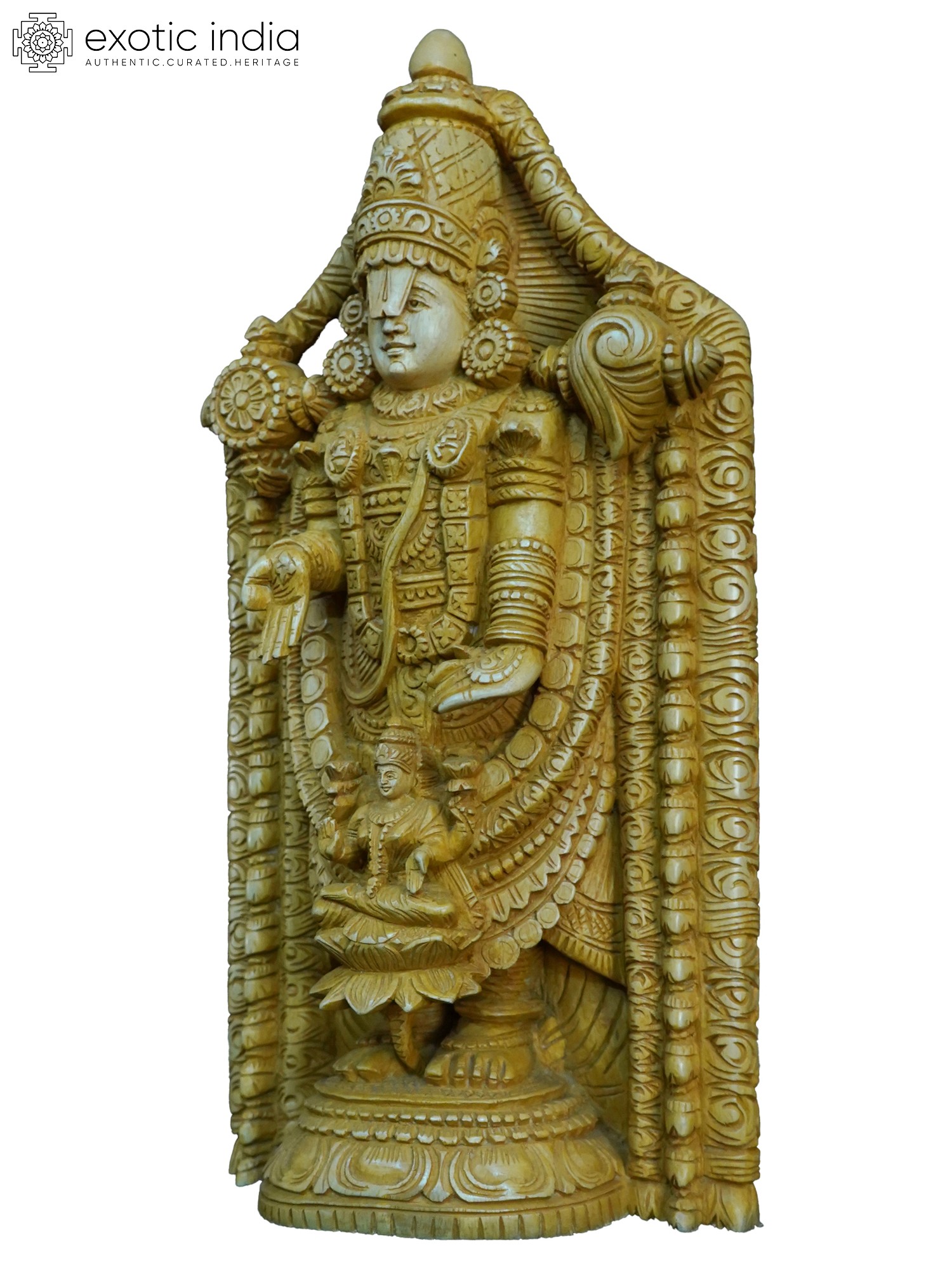 The creation of this statue is a labor of love and devotion. Each curve, each line, and each detail are meticulously carved by skilled artisans, carrying forward a tradition passed down through generations. The use of white wood lends a sense of purity and serenity to the sculpture. The hand-carved detailing, from the intricate ornaments adorning Venkateshwara to the delicate lotus upon which Lakshmi stands, speaks volumes about the dedication and artistry involved. Owning this statue is akin to possessing a piece of sacred art, imbued with the blessings of the divine. The posture of the deity with one hand pointed down invites worshippers to seek solace and abundance from him. The other hand is raised in blessing as he provides boons to devotees.