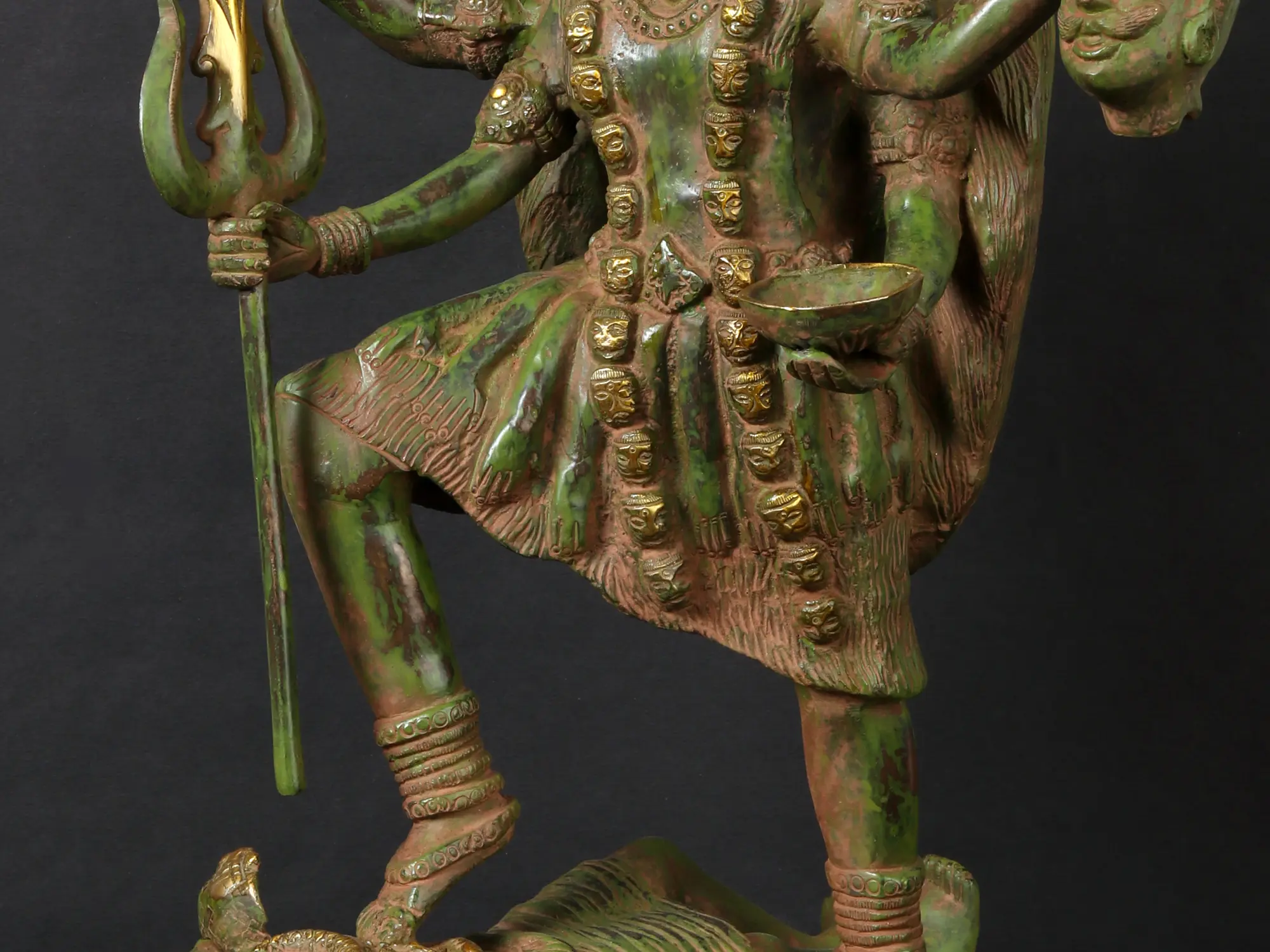 This striking brass statue captures the formidable essence of Maa Kali, one of the most revered and potent goddesses in Hinduism. Handcrafted with meticulous detail in India, this masterpiece stands as a testament to the country's rich artistic heritage and deep spiritual traditions. Maa Kali is the fierce aspect of Devi, the supreme goddess, often depicted as the destroyer of evil, a liberator of the oppressed, and a symbol of time, change, and ultimate reality. Her form, though fearsome, is understood as profoundly compassionate and protective, embodying the cyclical nature of creation and destruction necessary for renewal.