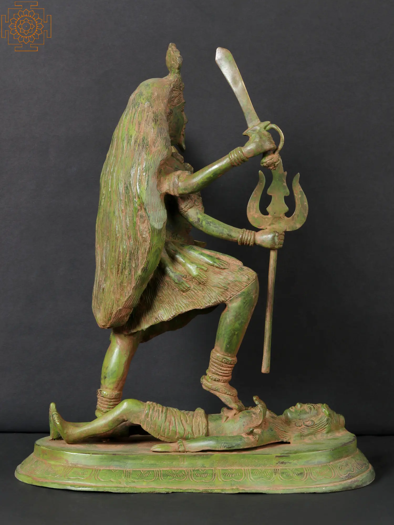 The story of Kali's emergence is often linked to the battle against the demon Mahishasura. When other goddesses, including Durga, found themselves unable to defeat him, Kali burst forth from Durga's forehead, her fury unleashed to vanquish the unrighteous. This statue, with Kali standing triumphantly upon a prostrate figure, likely representing a vanquished demon or the ego, evokes this powerful narrative. The coiled serpents that adorn her, and the garland of skulls around her neck, are potent symbols of her power over death and rebirth. The intricate designs etched into her skirt and the ornamentation on her ankles and wrists showcase the skilled artistry of the Indian craftsmen who brought this divine form to life. The verdigris patina applied to the brass enhances the statue's ancient and sacred feel, suggesting a timeless connection to the divine.