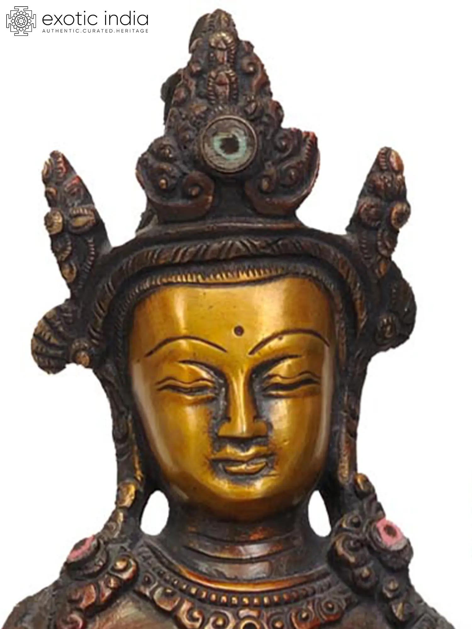 This exquisite brass statue captures the serene presence of Padmapani Avalokiteshvara, the Bodhisattva of Compassion, a central figure in Mahayana Buddhism. Crafted with meticulous detail in India, this artwork stands as a testament to traditional artistry and spiritual devotion. The name "Padmapani" translates to "lotus-bearer," a symbolic representation of purity and enlightenment, which is elegantly depicted in the deity's hand, holding a blooming lotus. This sacred flower symbolizes the Bodhisattva's ability to rise above the worldly afflictions, remaining pure and untainted by the cycles of suffering.