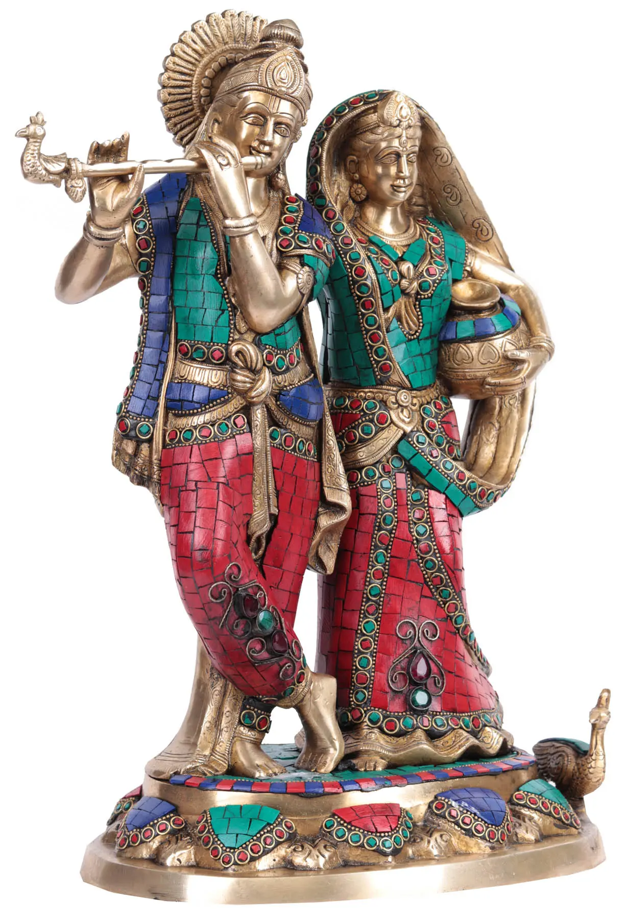 The artistry of this statue is truly breathtaking. The lustrous brass serves as a noble canvas for the meticulously inlaid semi-precious stones. The vibrant red and turquoise hues adorning their attire speak of passion and celestial joy, reminiscent of the lush landscapes of Vrindavan where their legendary romance unfolded. The tiny, precisely cut pieces are set with remarkable skill, creating patterns that are both bold and delicate. Notice the subtle nuances in the drapery, the graceful flow of their garments, and the gentle curves that define their forms. Even the base on which they stand is a testament to the artisan's dedication, featuring decorative patterns and smaller inlaid stones, anchoring the divine figures with earthly beauty. The presence of two small peacocks, birds sacred to Krishna, further enhances the sacred narrative woven into the sculpture.