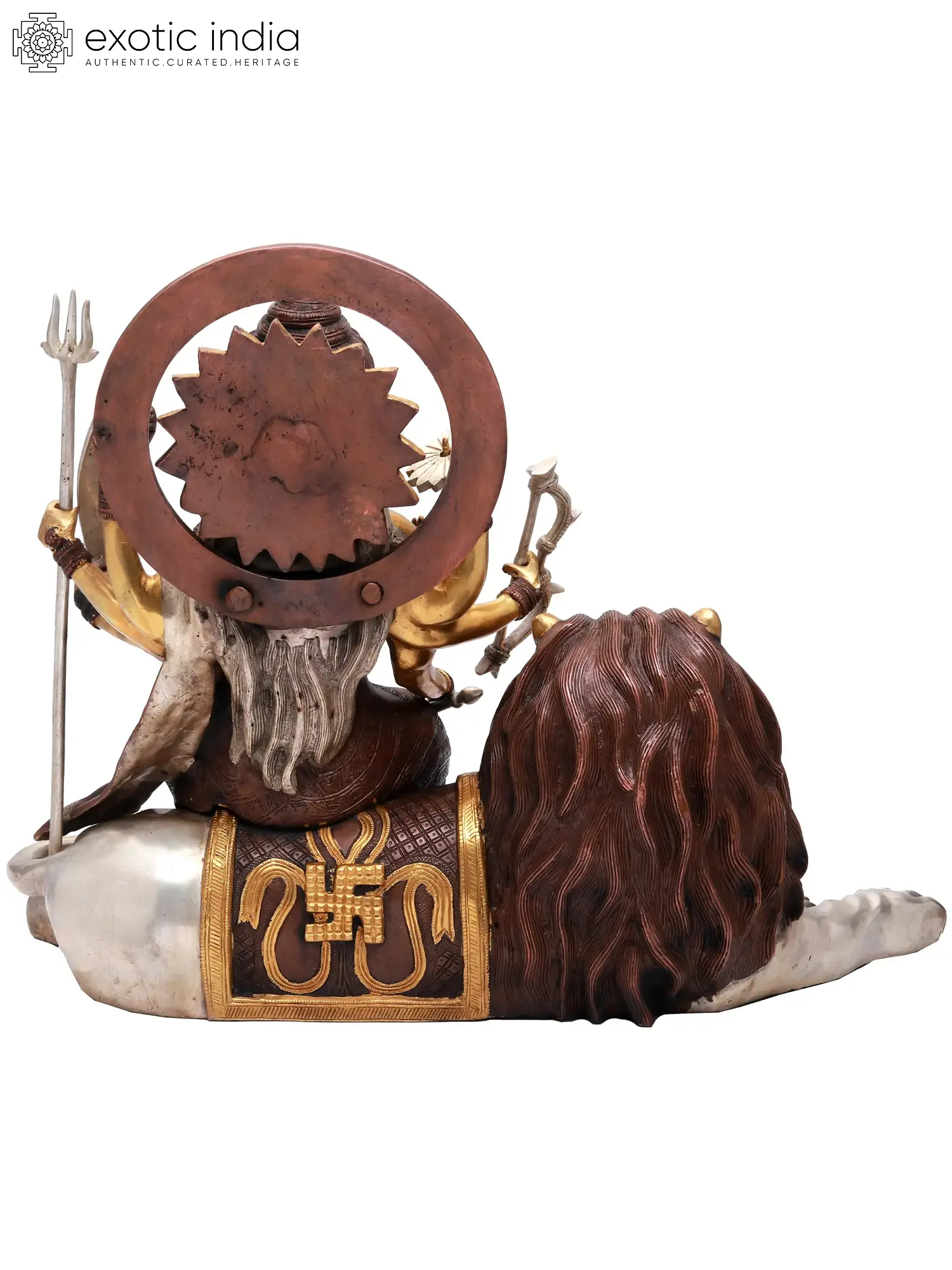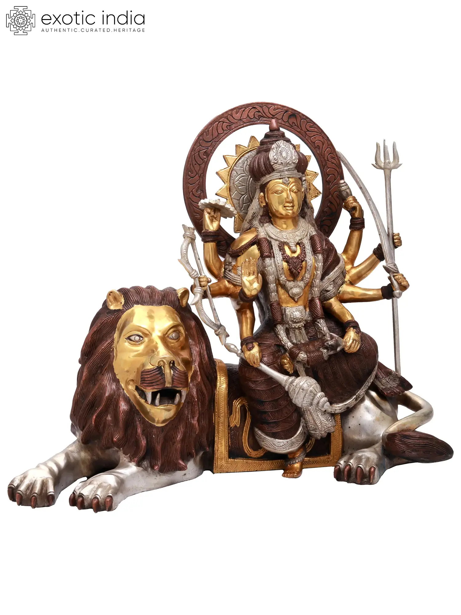 In this brass sculpture, “Sheran-wali Mata”, the radiant embodiment of divine power, gracefully sits astride a majestic lion, symbolising her fearlessness and sovereignty. Her resplendent aura bathes the cosmos in a celestial glow, casting away the shadows of ignorance and despair. With eyes like blazing stars, she watches over her devotees, her benevolence a soothing balm for troubled hearts. Her multi-armed form wields weapons of cosmic significance, ready to vanquish the forces of darkness. “Goddess Durga”, the warrior of the heavens, evokes awe and reverence, a beacon of unwavering hope.