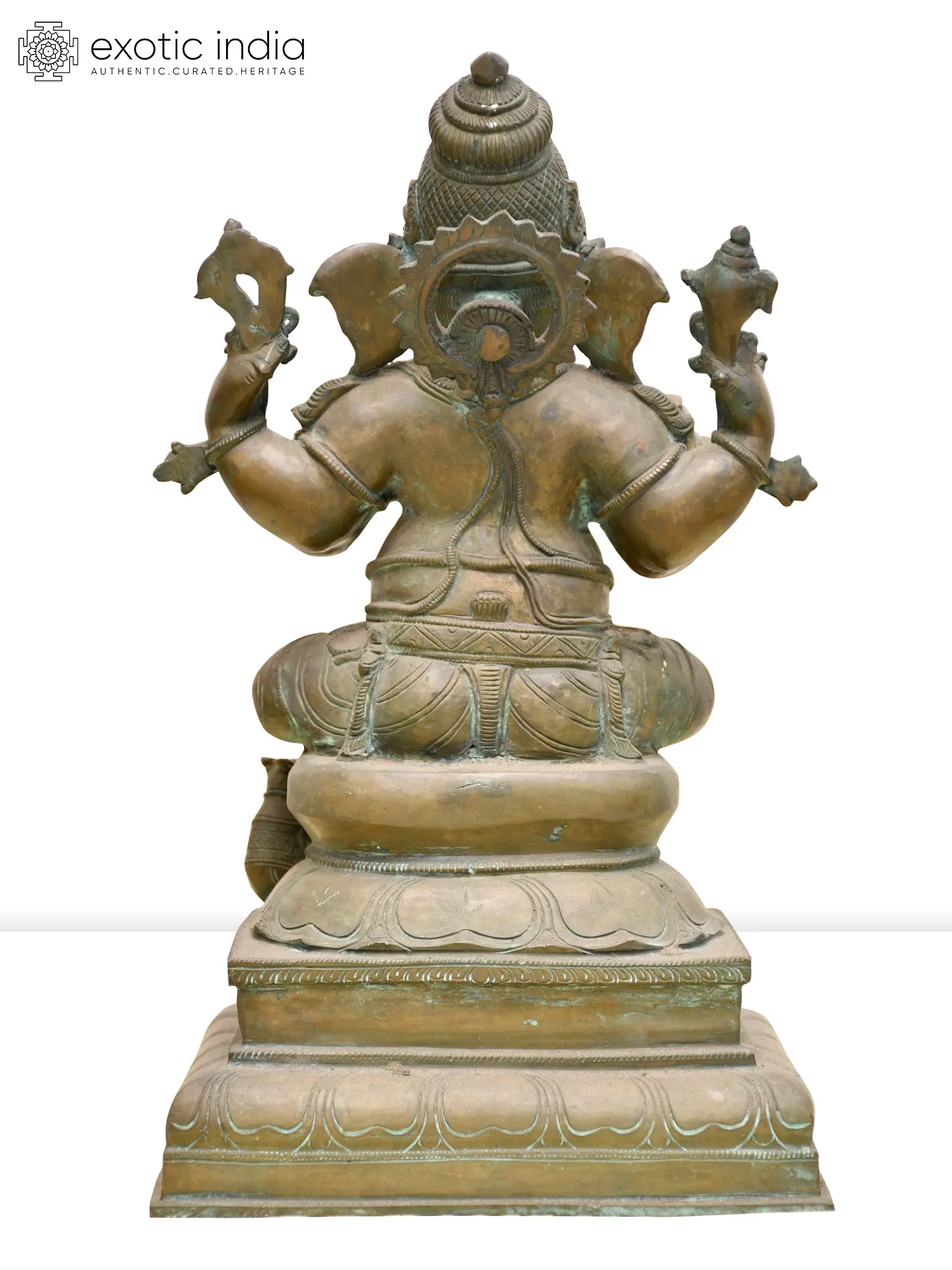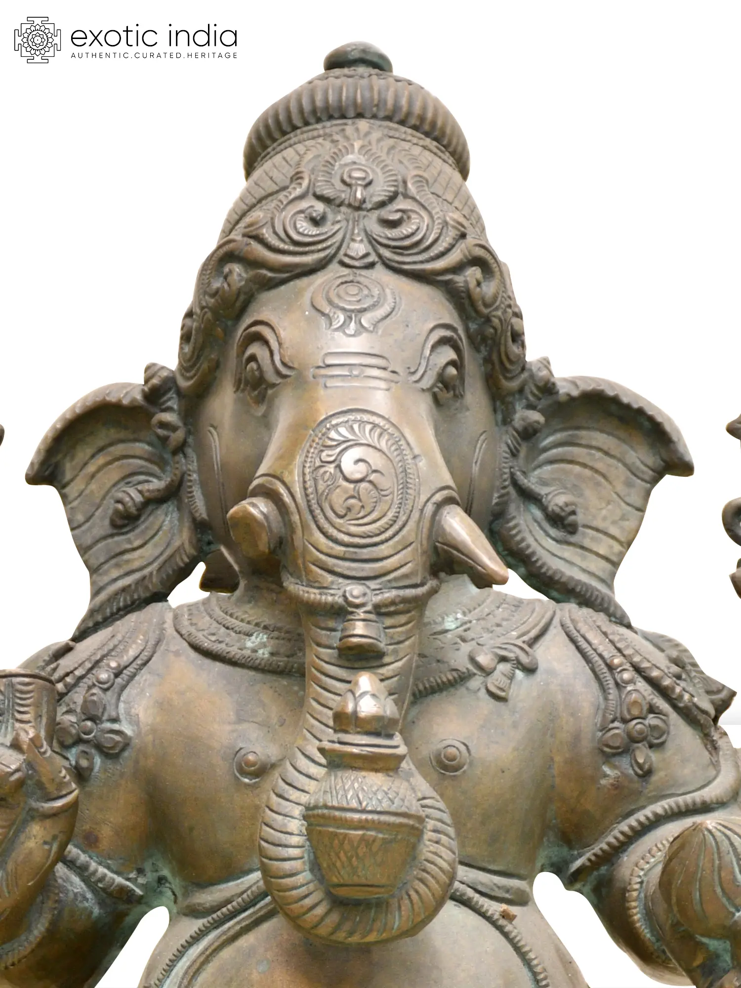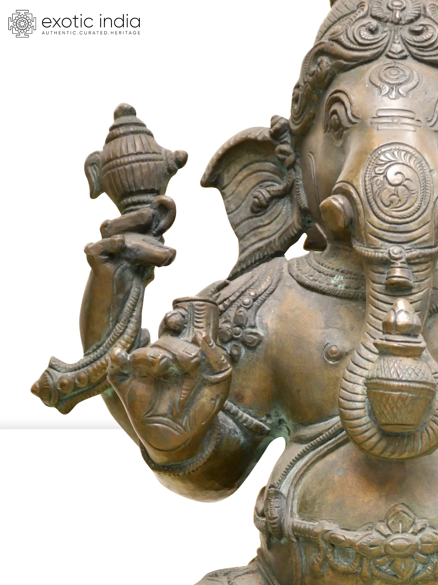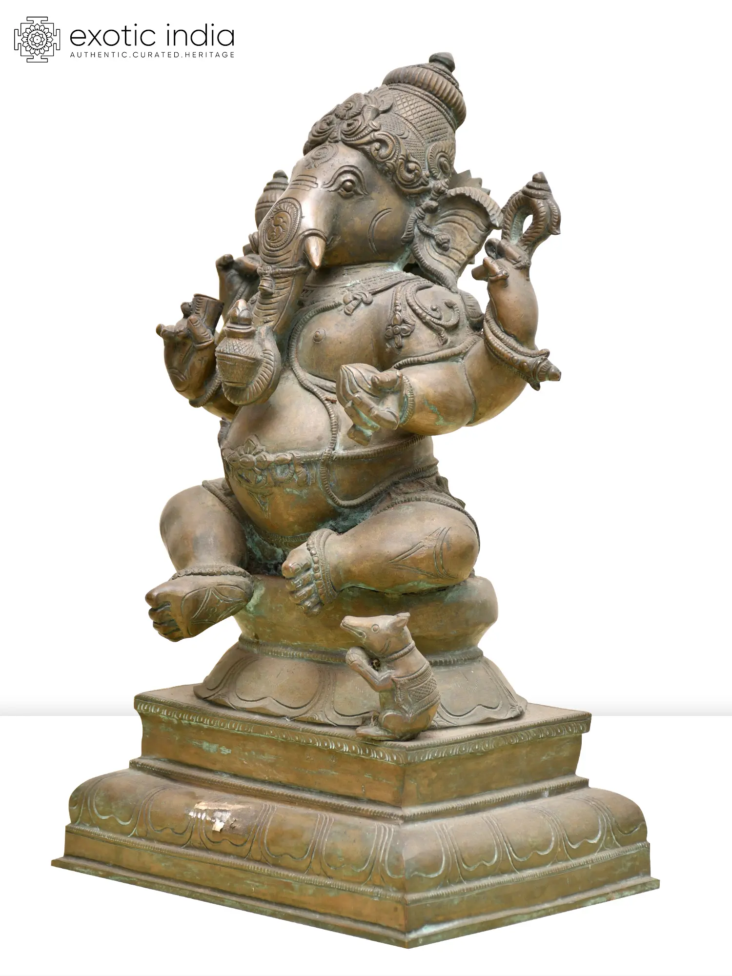 The pot-bellied auspicious Hindu Lord, Ganapati sits in the regal Lalitasana pose in this traditionally sculpted Swamimalai bronze.