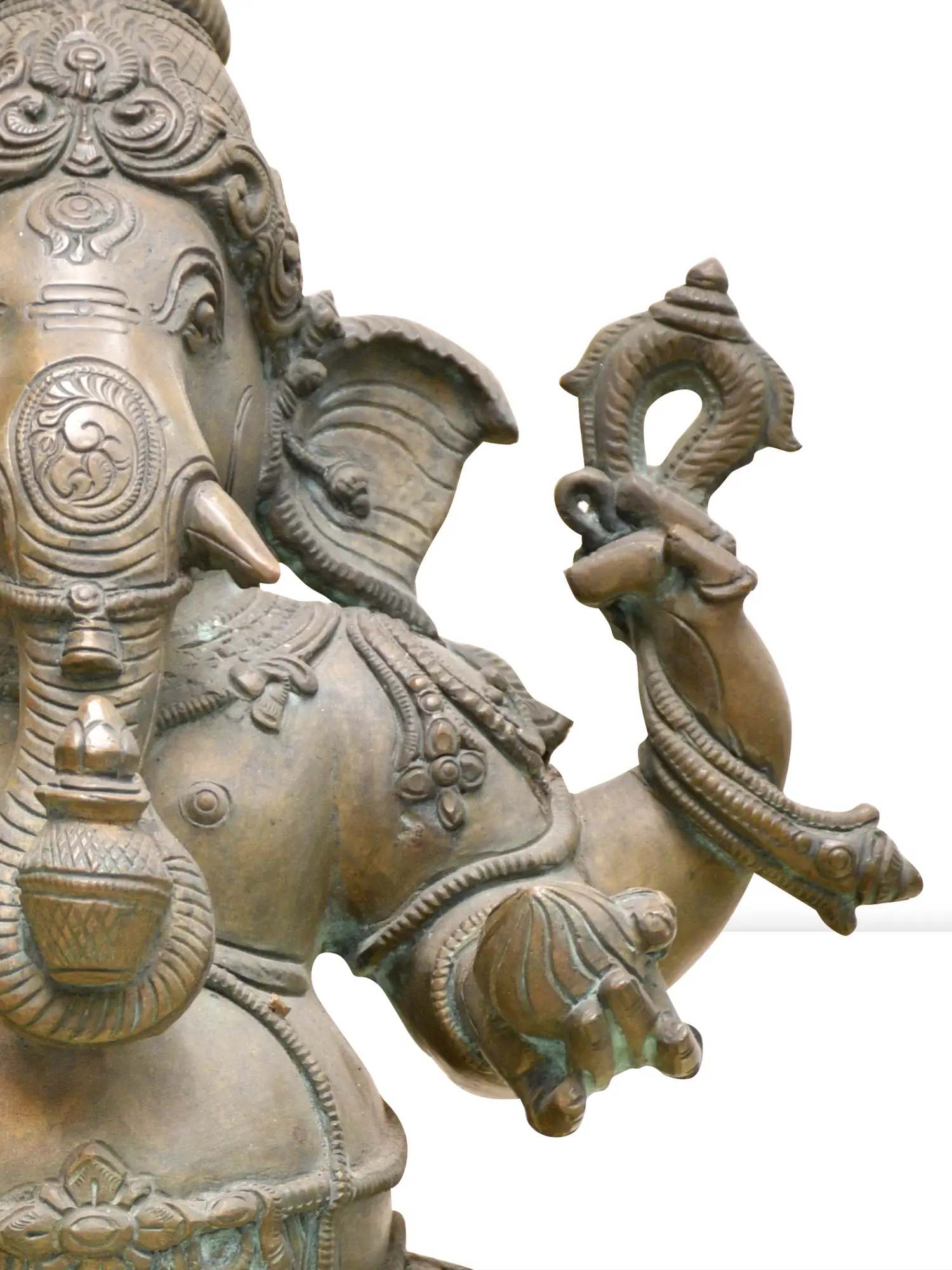 Raised on a two-tiered lotus pedestal that symbolizes the supreme throne, the seat of divinity, Ganesha is sculpted in a rounded manner, to fill the space he inhabits with a sacred aura.