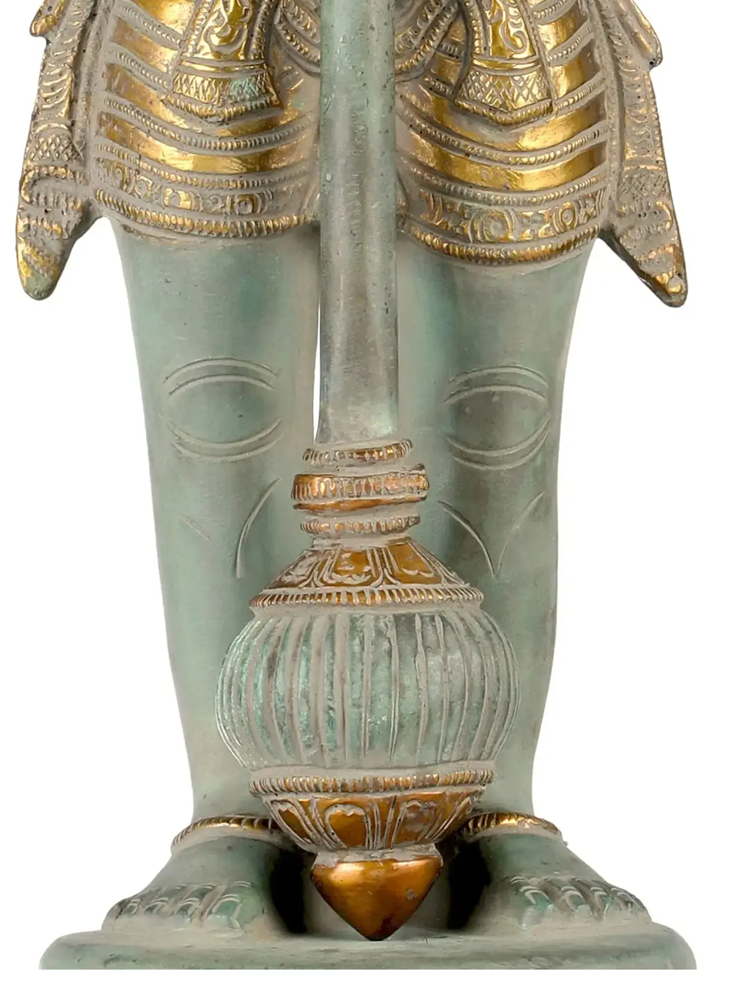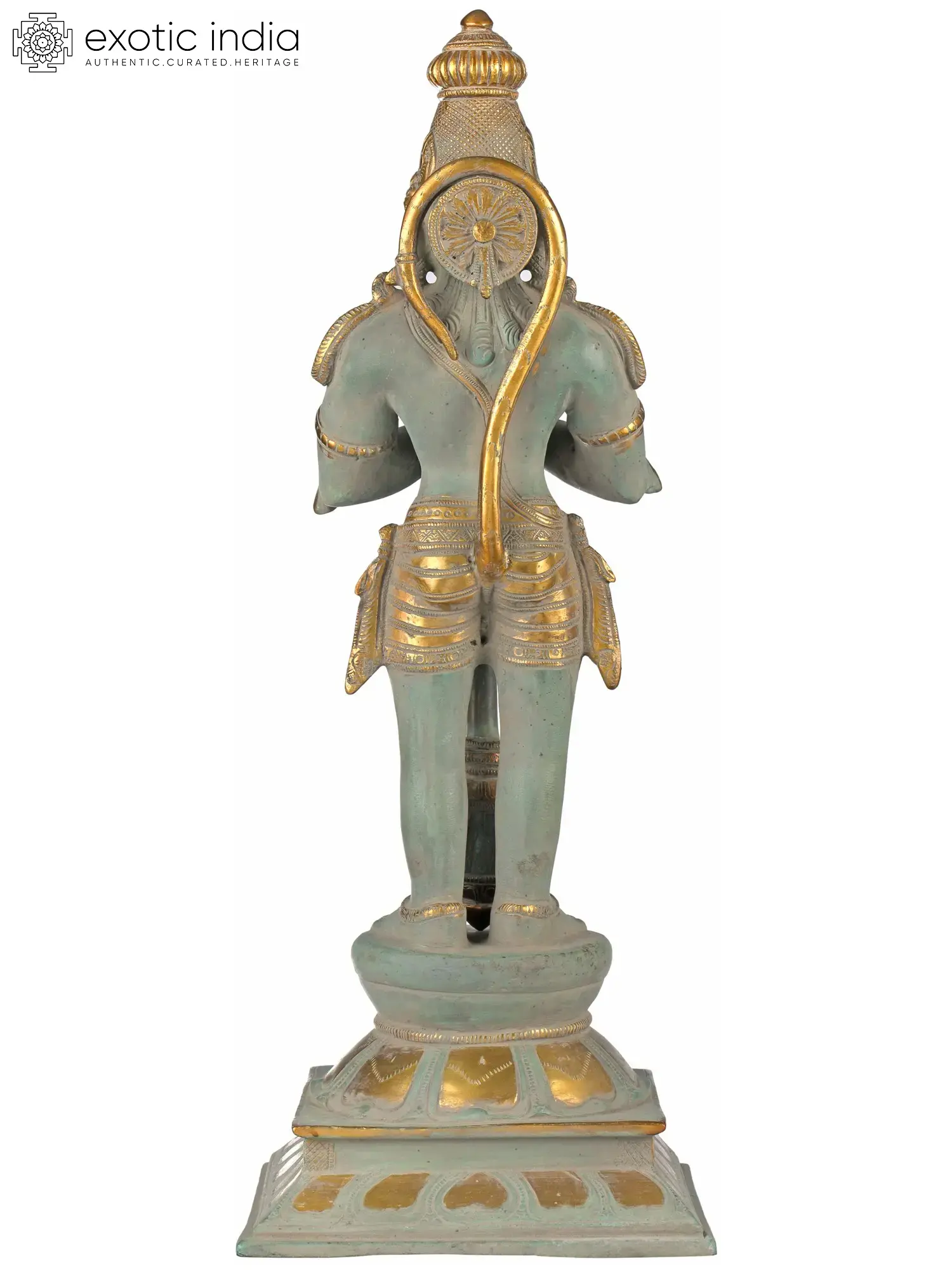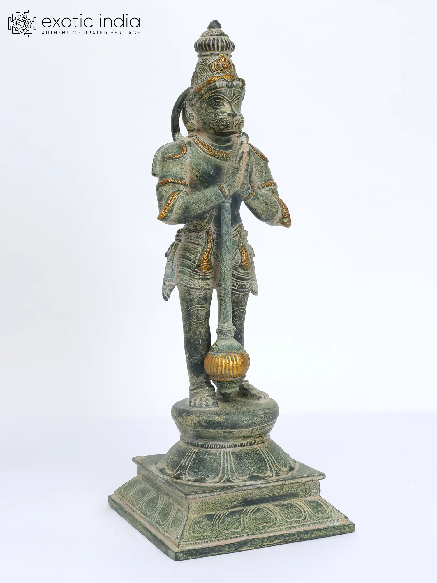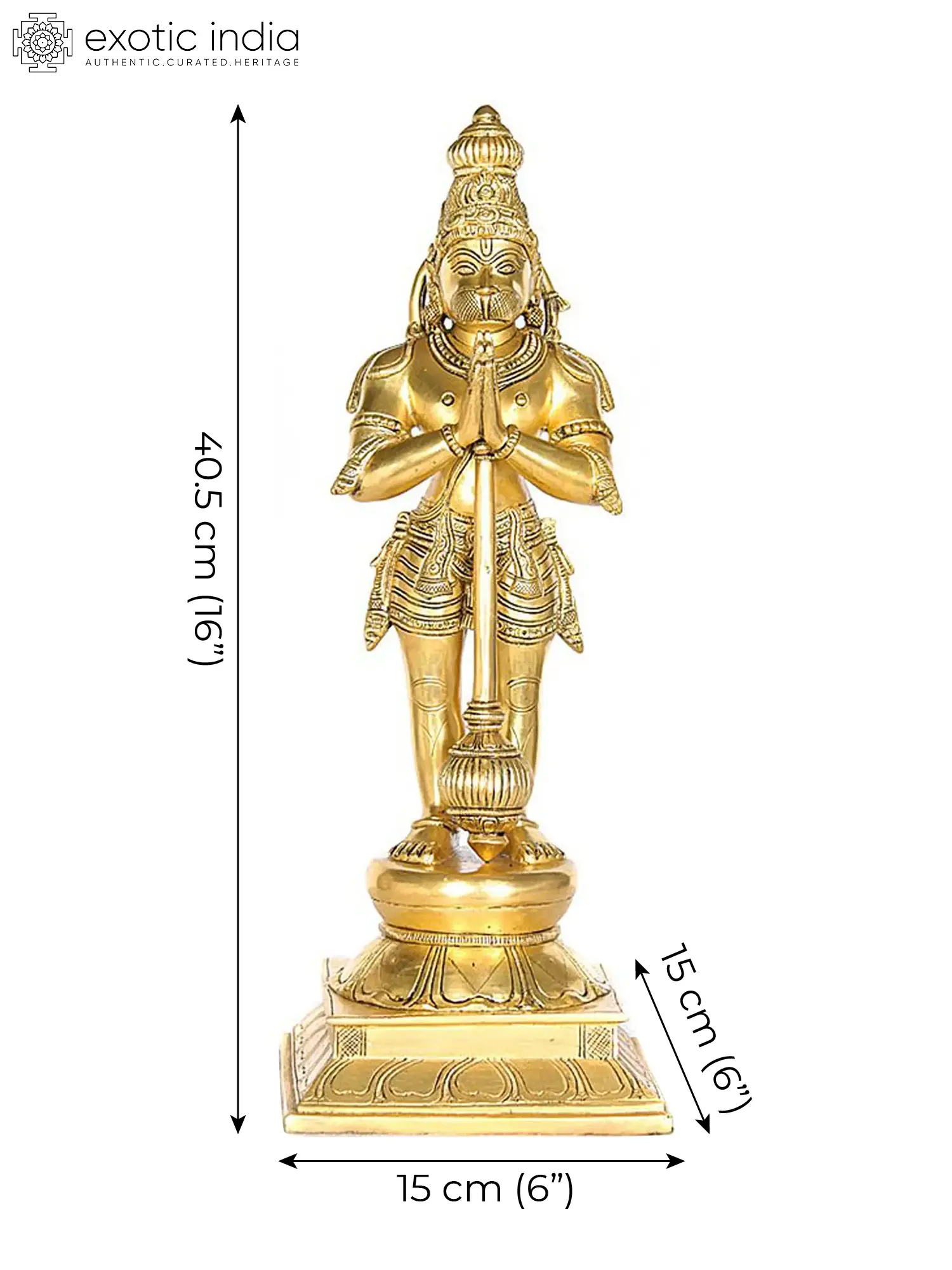 The Standing Hanuman Brass Idol, meticulously handcrafted in India, portrays Lord Hanuman in all his glory. Hanuman, the symbol of devotion and unwavering loyalty, stands tall. His uplifted mace signifies strength and his hands pressed together in prayer symbolize devotion.