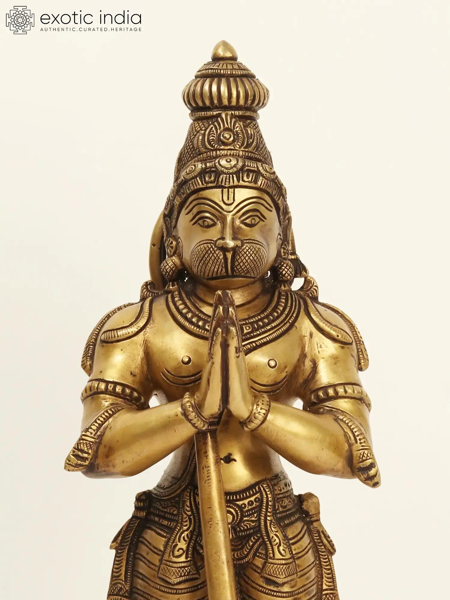 His uplifted mace signifies strength and his hands pressed together in prayer
