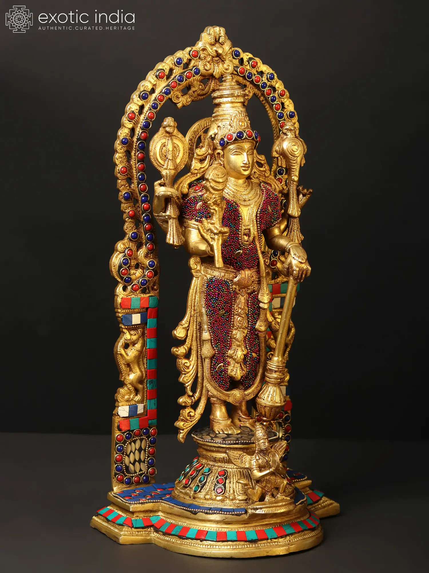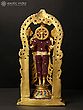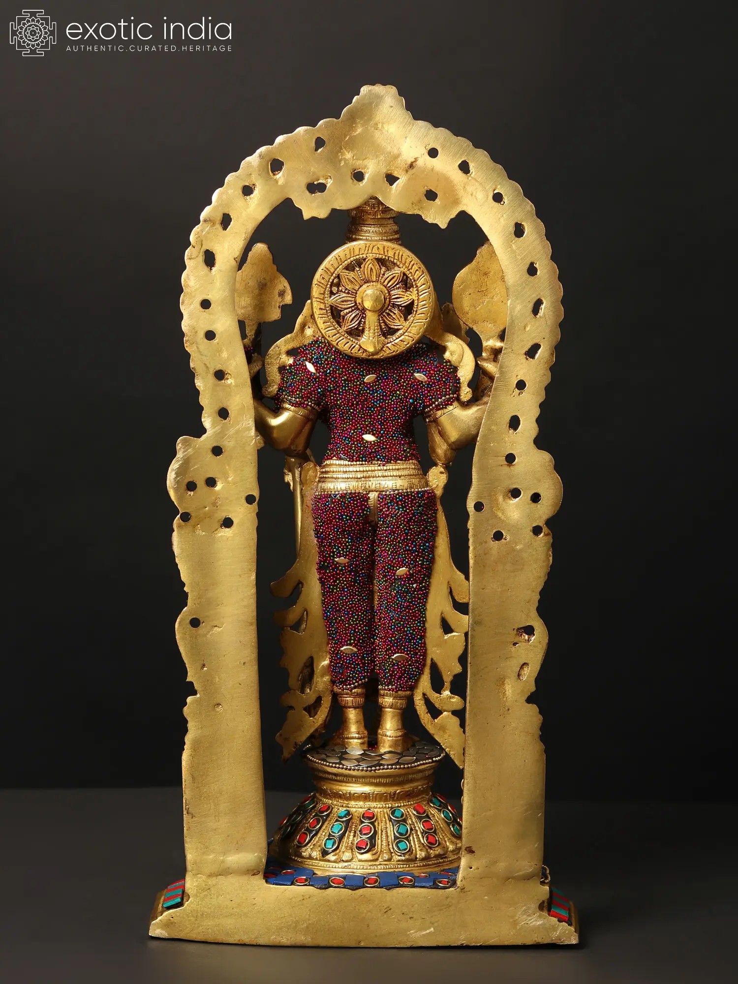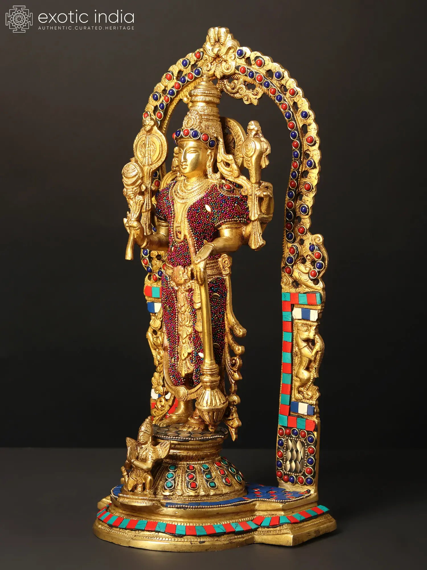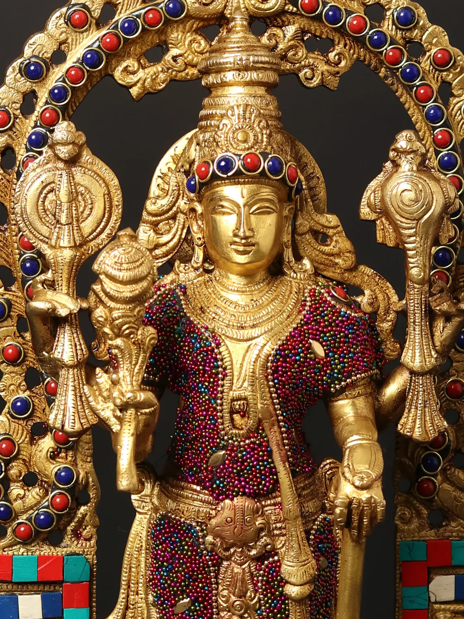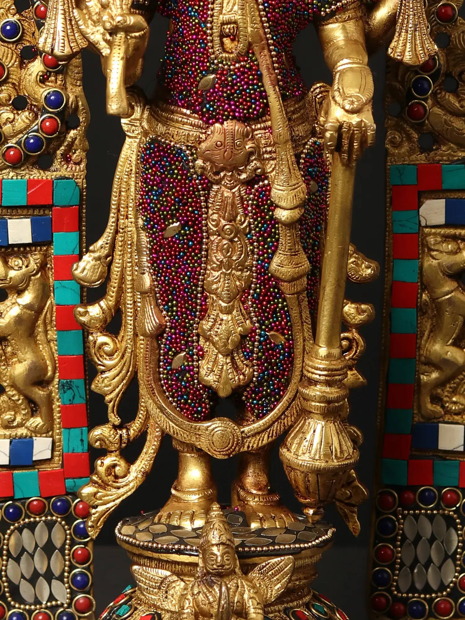 This Brass statue of Lord Vishnu, standing beneath a Kirtimukha Prabhavali, exudes divine grandeur in Hindu iconography. The ornate statue adorned with fine inlay work amplifies its aesthetic allure, showcasing exquisite craftsmanship. Vishnu, the preserver in the Hindu trinity, is depicted in a stance of cosmic balance and grace. Notably, the statue includes Garuda, Vishnu's celestial eagle mount, seated at the deity's feet, symbolizing unwavering devotion. This intricate portrayal not only glorifies Vishnu's majestic presence but also signifies the inseparable bond with his devoted mount, conveying a sense of cosmic unity and the divine harmony inherent in Hindu mythology.