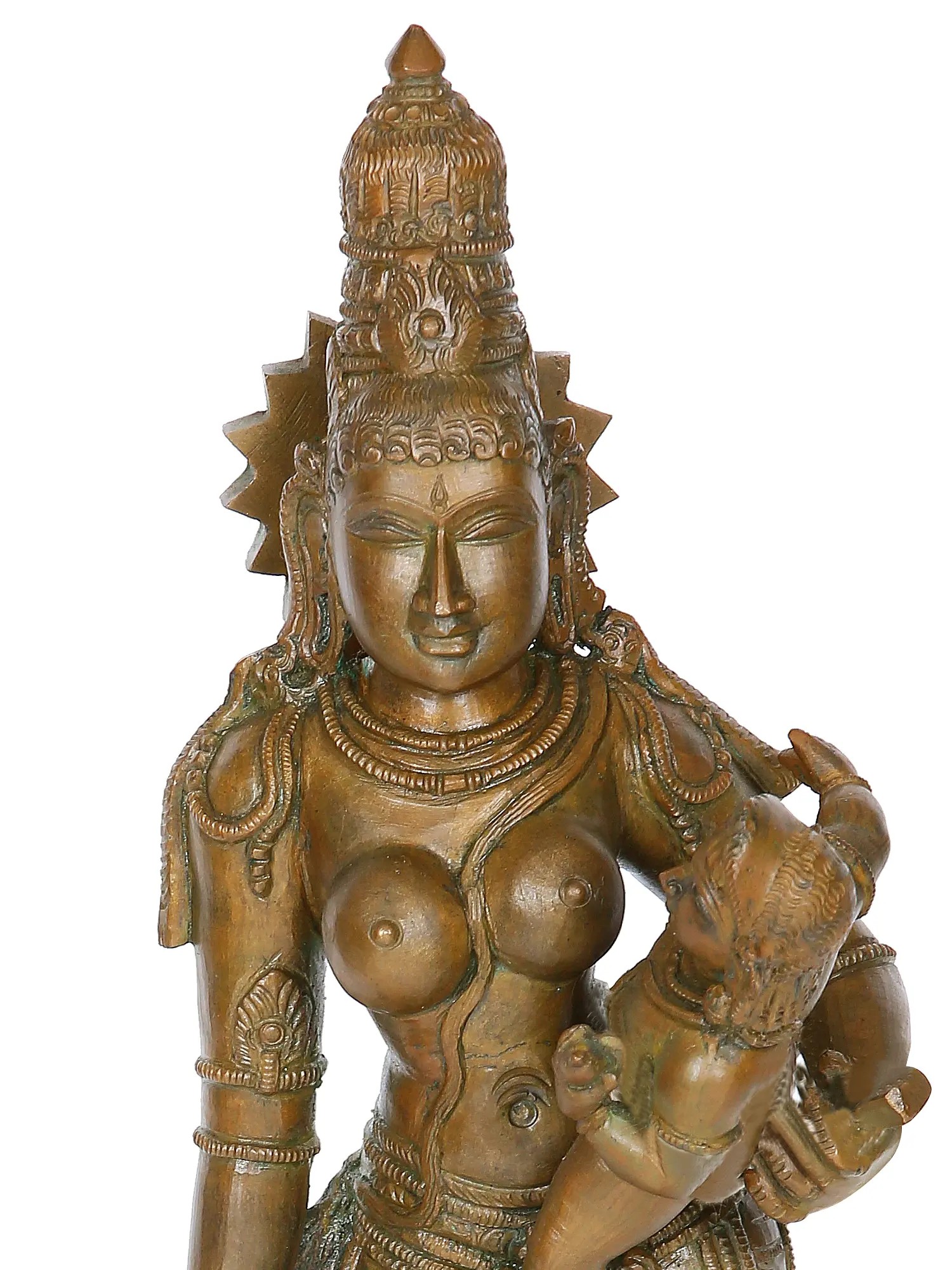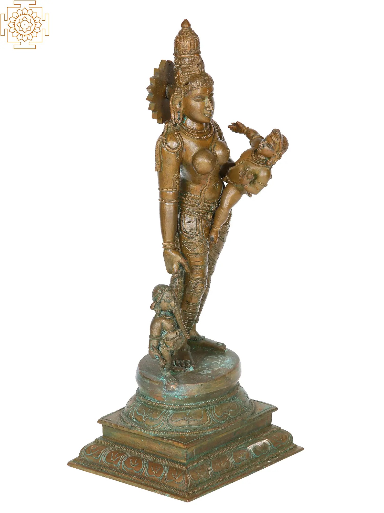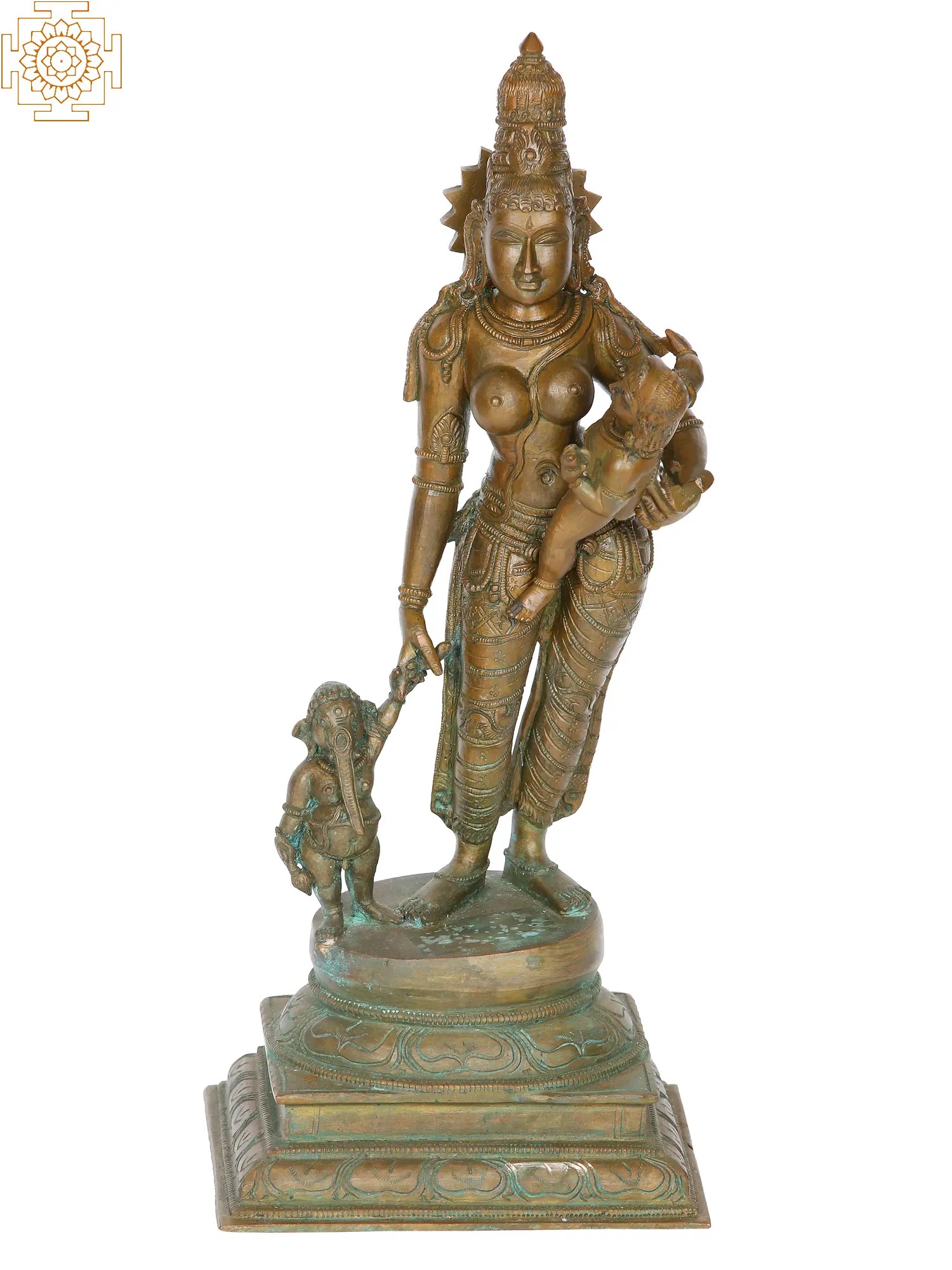 The plinth upon which stands the Goddess Parvati is a particularly ornate one. It has a two-tiered base in a quadrilateral shape, and an upturned lotus bloom on top. The feet of Parvati and Ganesha rest upon its pistil. In this composition, the language of the great Parvati Adi Shakti’s form pours forth with compassion and tenderness and every other quality of the divine maternal.