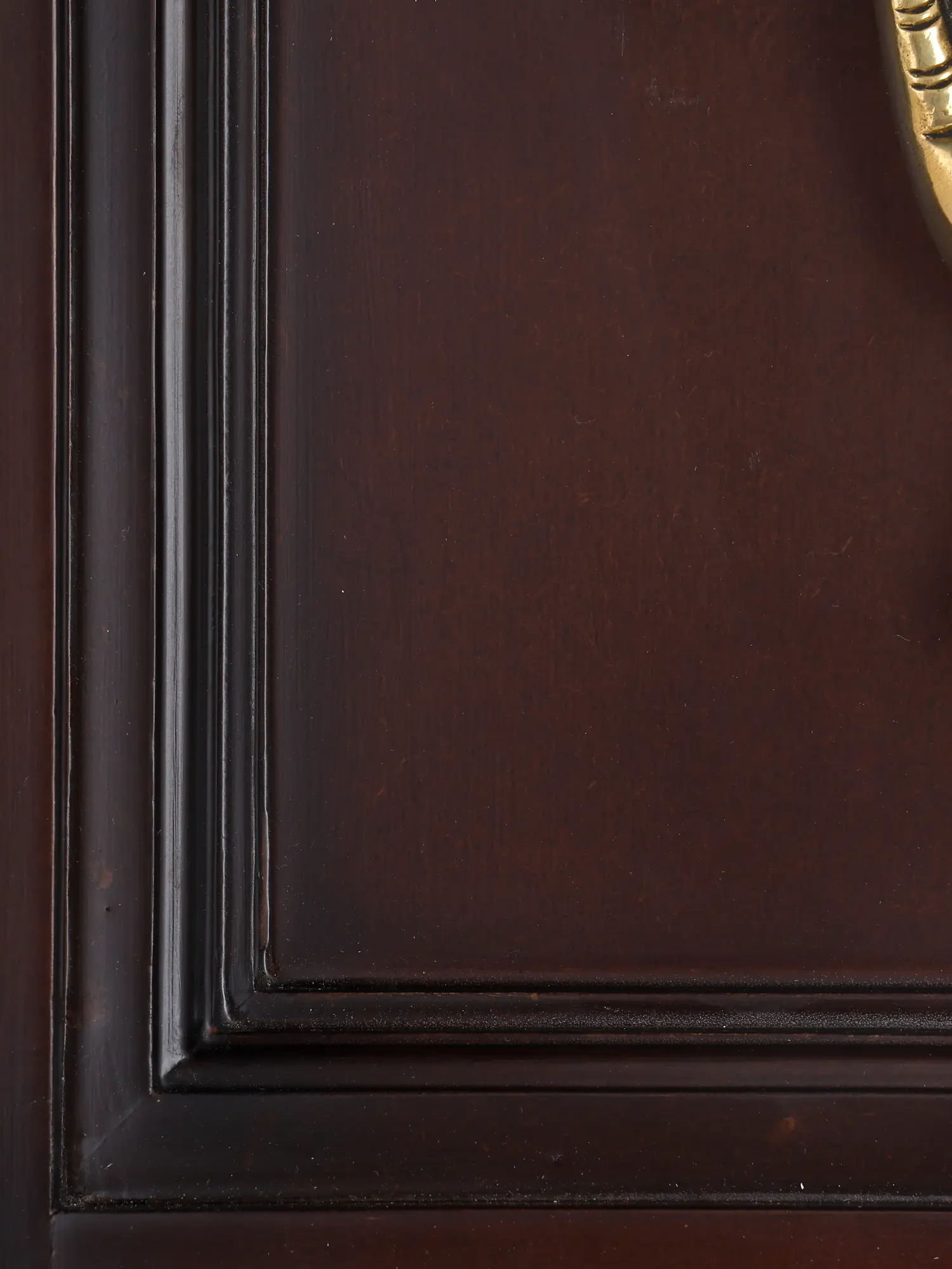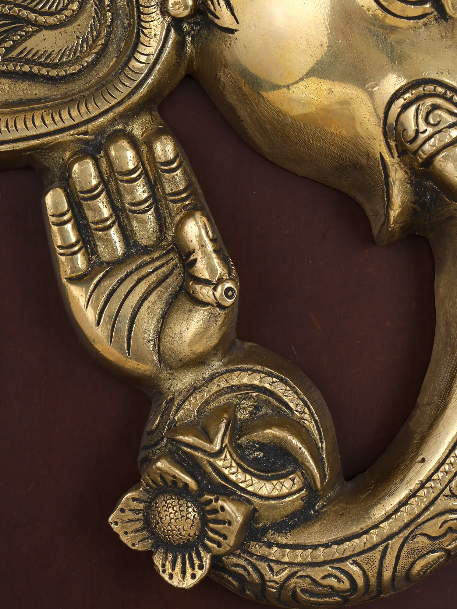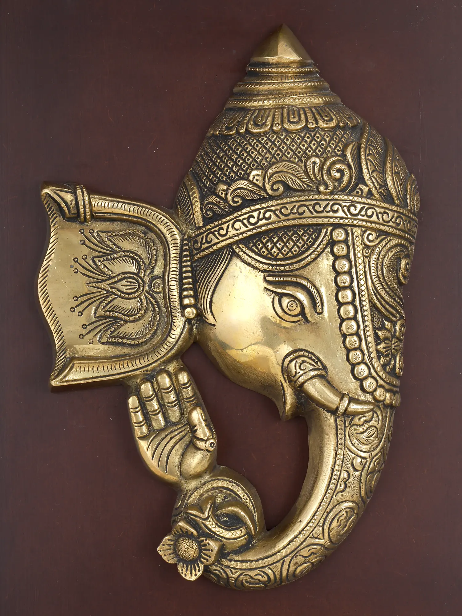 This wood and brass wall hanging presents Vakratunda (with curving trunk) Sri Ganesha’s head, adorned beautifully with his hand in Abhaya mudra, blessing the ambiance he resides in.