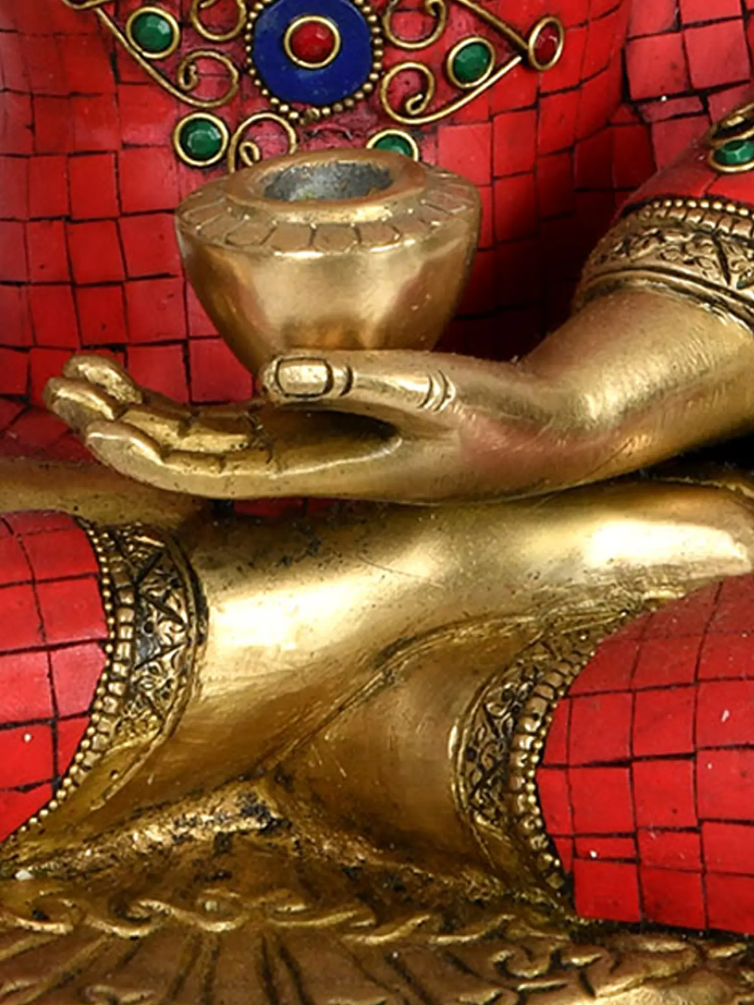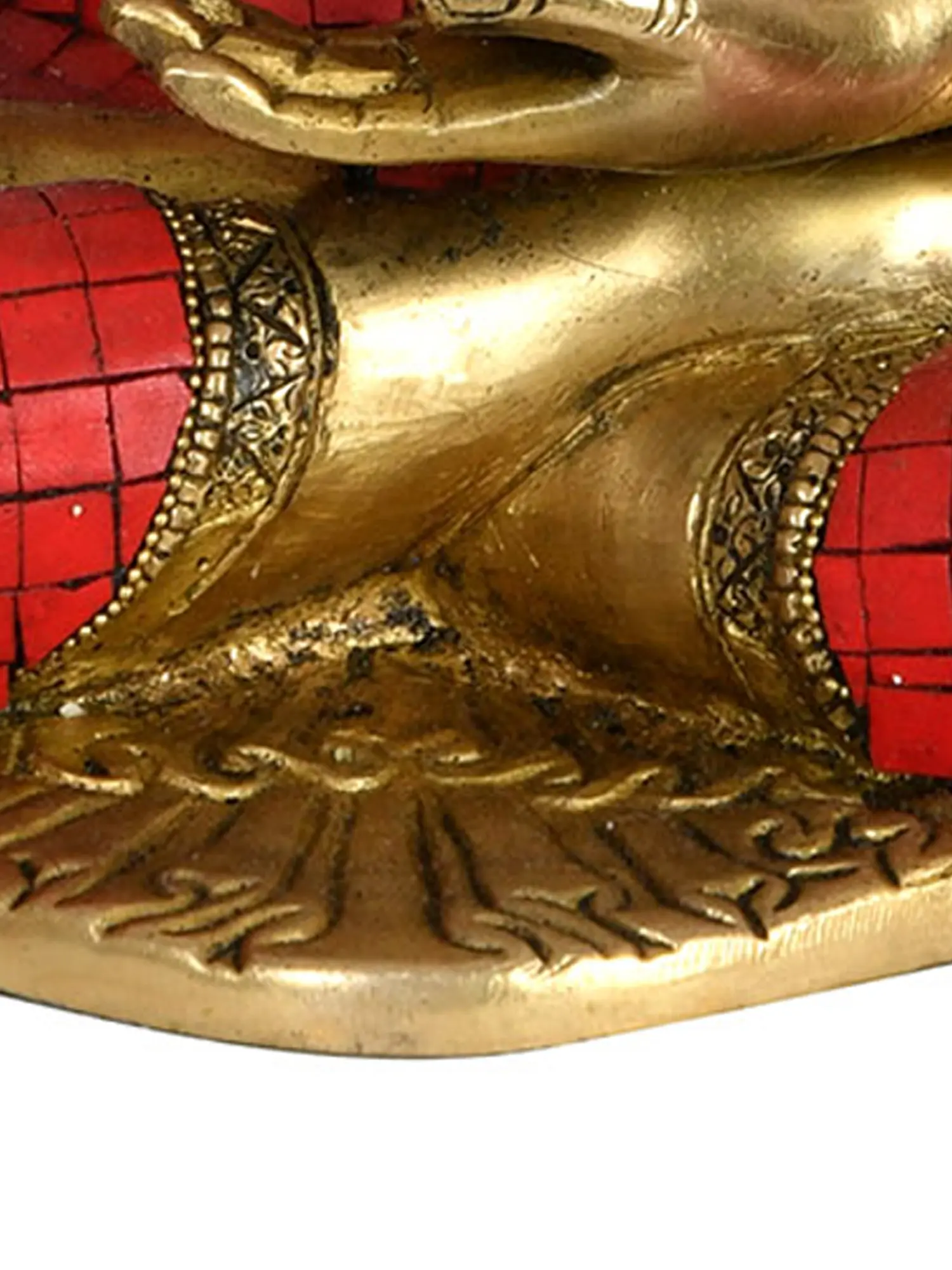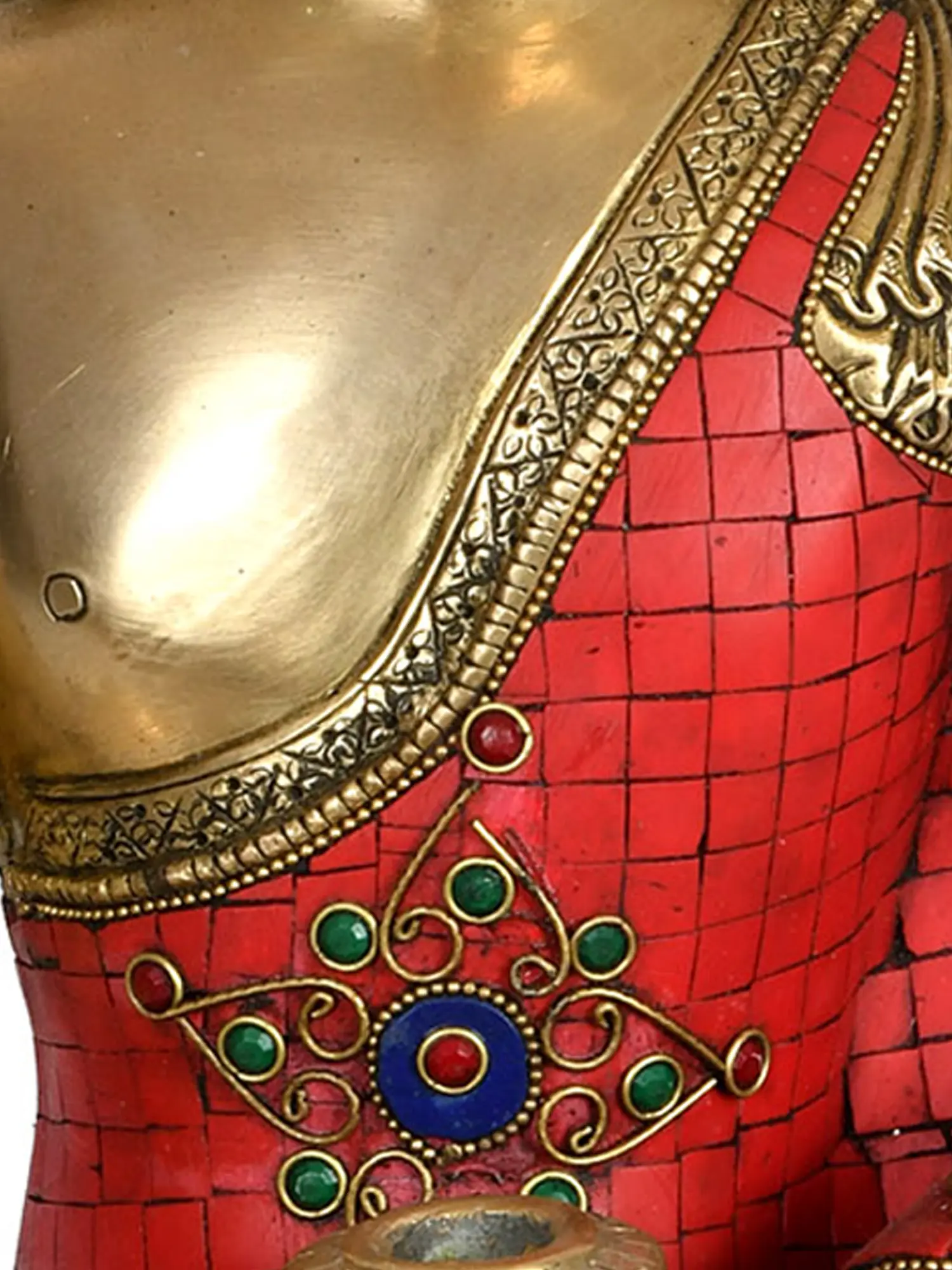 Handcrafted in India with meticulous attention to detail, this impressive sculpture is rendered in robust brass, a material associated with durability and auspiciousness in many cultures. The rich golden sheen of the brass highlights the serene countenance of the Buddha, from his contemplative gaze to the subtle lines of his benevolent smile. The robe, rendered in a vibrant red mosaic of inlaid stones, adds a striking visual element. This intricate inlay work, featuring captivating shades of blue and green, is not merely decorative; it signifies the precious gems and the richness of the spiritual treasures that enlightenment bestows. The careful tessellation of these stones evokes the checkered patterns often found in traditional Buddhist art, adding a layer of cultural depth and authenticity.