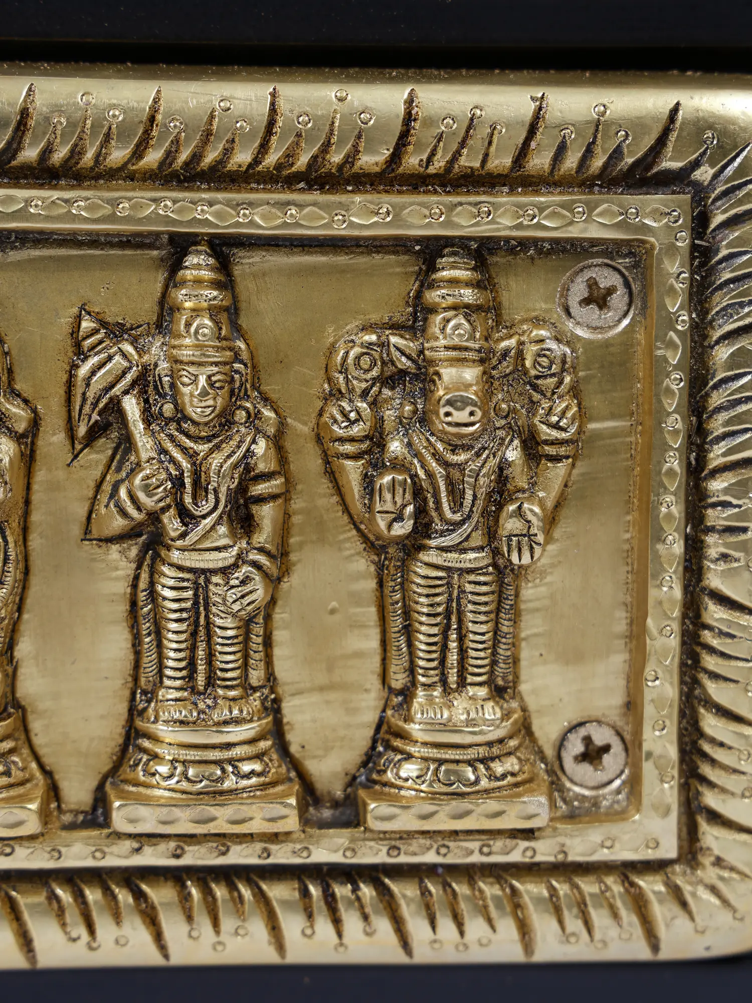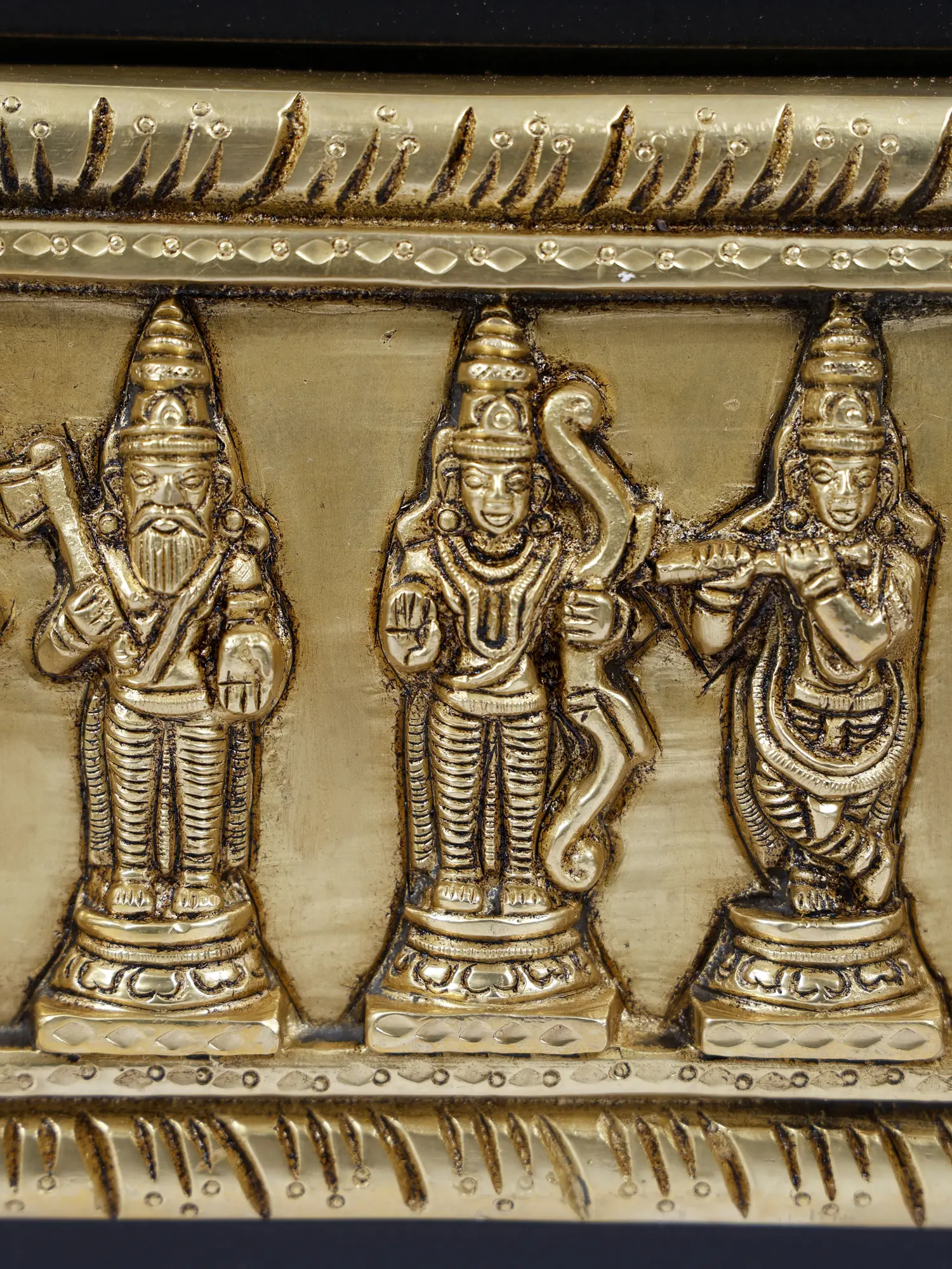 This Wood Framed Dashavatara of Lord Vishnu in Brass is a remarkable wall hanging that seamlessly blends traditional aesthetics with contemporary appeal. The intricate brass craftsmanship portraying the ten avatars of Lord Vishnu is both culturally rich and visually stunning. The wooden frame provides a touch of warmth, creating a perfect balance between tradition and modernity.
