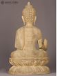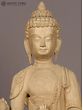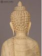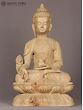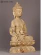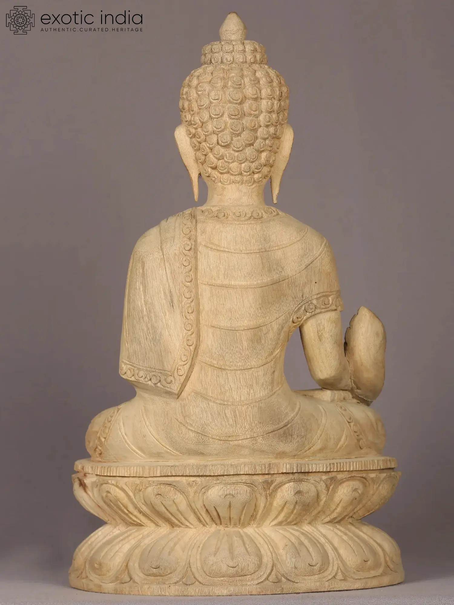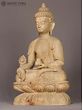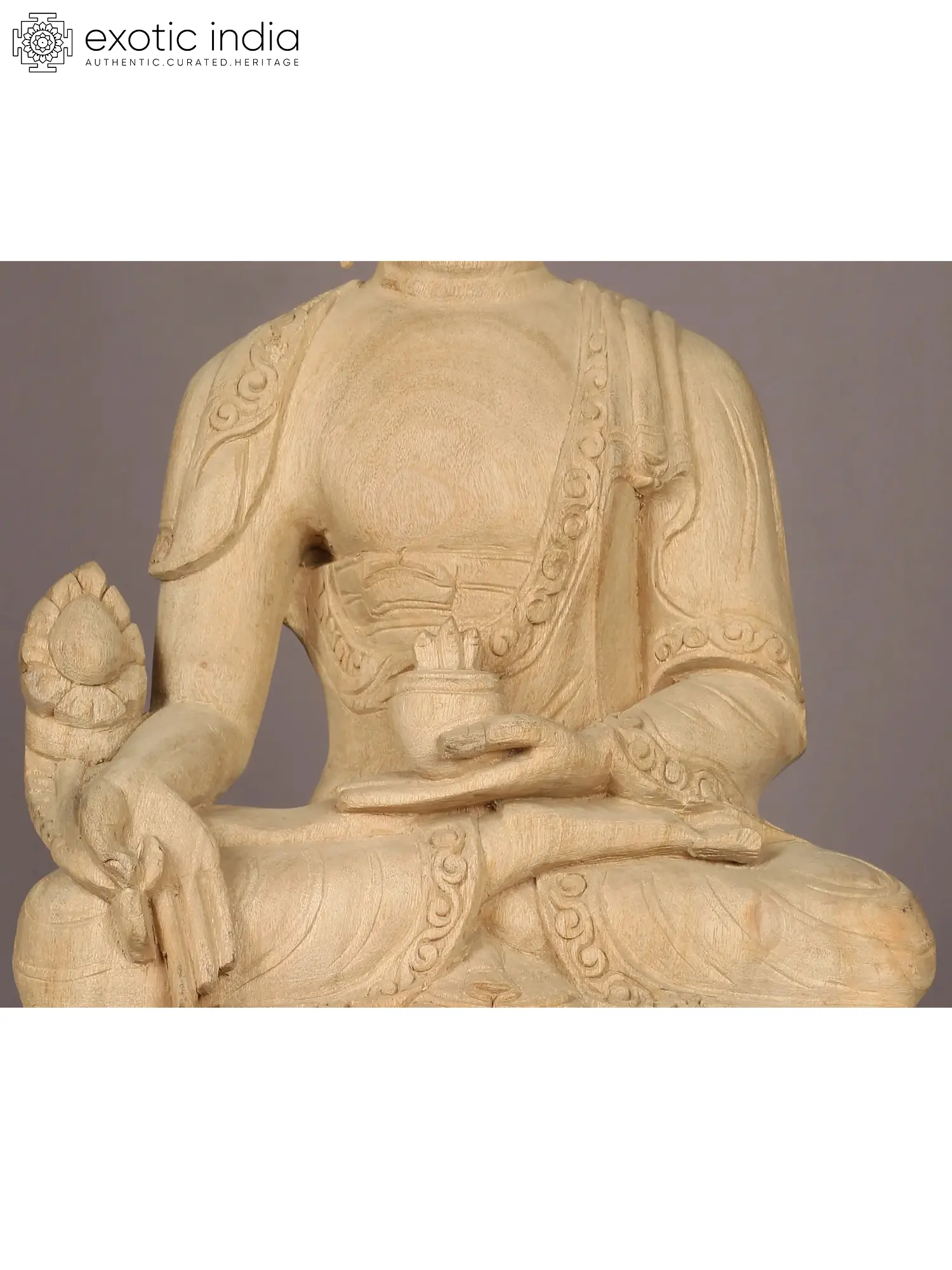 The colorless Wooden Lord Medicine Buddha sculpture is a symphony of iconography that unfolds through its intricate details. Seated in unwavering composure, the Medicine Buddha's right hand extends in the Varada mudra, symbolizing the granting of blessings and boons. His left hand holds the myrobalan plant, a potent emblem of healing wisdom to dispel suffering. The absence of color shifts focusses to the lines and forms, highlighting the meditative posture and serene expression. The wood's texture becomes a tactile medium for his spiritual resonance. This sculpture, free from hues, conveys the essence of compassion and restoration, inviting contemplation on the profound interconnectedness of well-being and enlightenment.