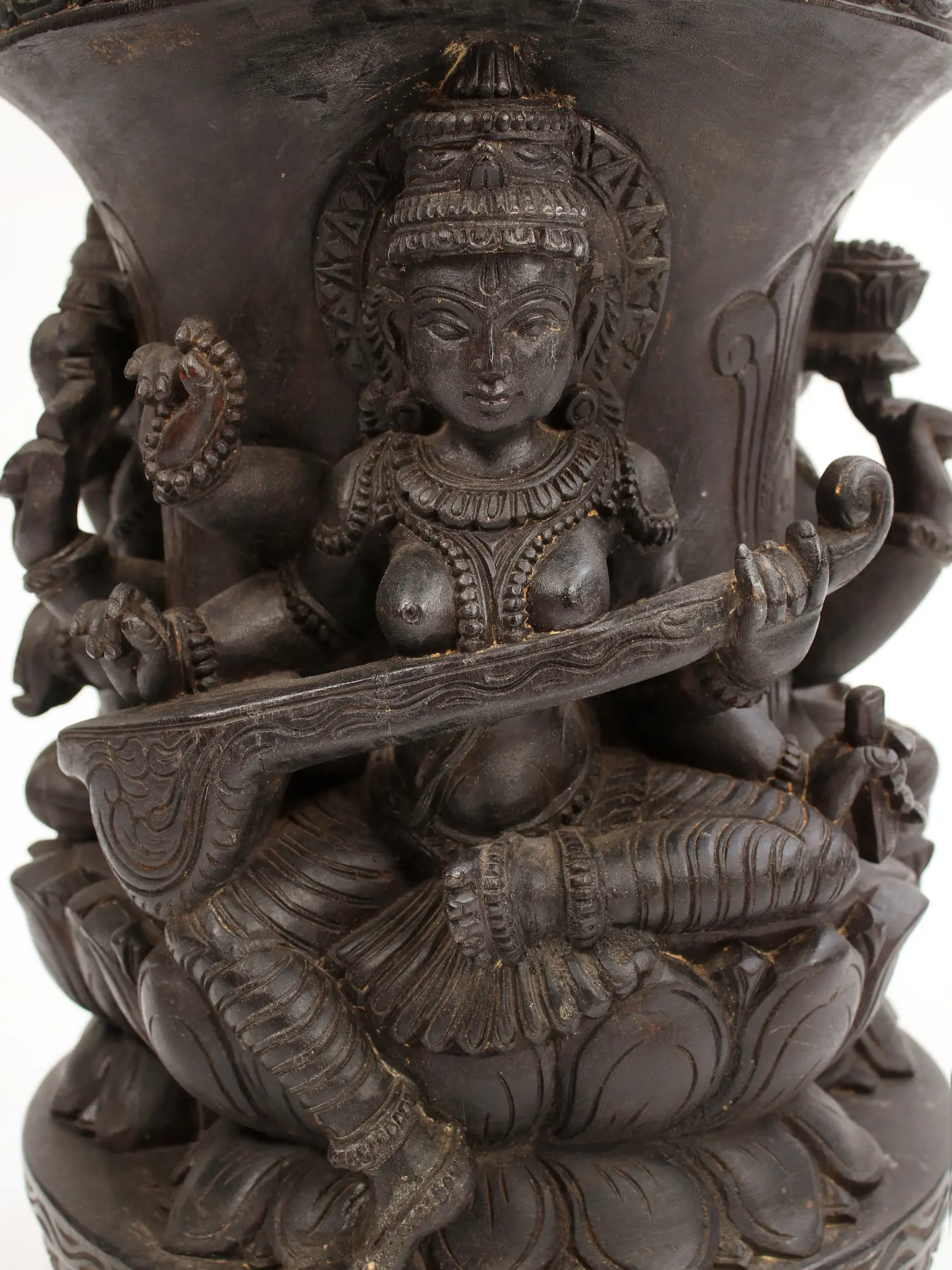 Encircling the central motif, subtle yet significant representations of Goddess Lakshmi and Goddess Saraswati are thoughtfully integrated. Lakshmi, the embodiment of wealth, fortune, and prosperity, brings her blessings of abundance and good luck. Her gentle grace is often associated with the lotus, a symbol of purity and spiritual awakening, which is echoed in the design of the base itself. Saraswati, the goddess of knowledge, music, arts, wisdom, and learning, inspires creativity and intellectual pursuits. Together, these divine feminine energies create a powerful synergy of material and spiritual wealth, knowledge, and artistic expression. This harmonious blend makes the base an ideal support for cherished idols, valuable artifacts, or even as a standalone piece that radiates positive vibrations.