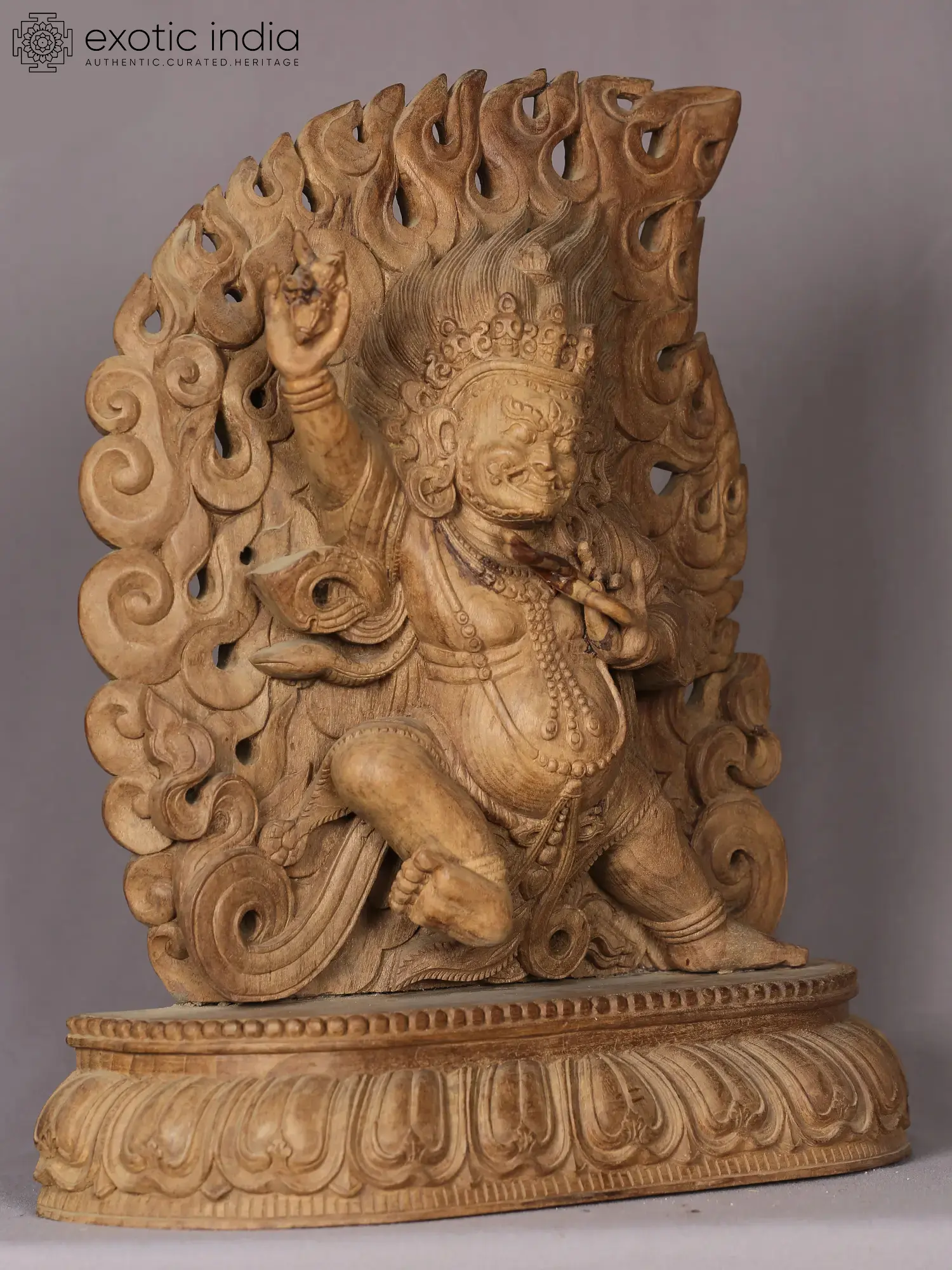 Vajrapani is depicted as a powerful and wrathful figure, holding a vajra (thunderbolt or diamond scepter) in one hand, symbolizing indestructible spiritual power. His other hand often displays a threatening gesture (Larijani mudra), representing the dispelling of fear and obstacles.