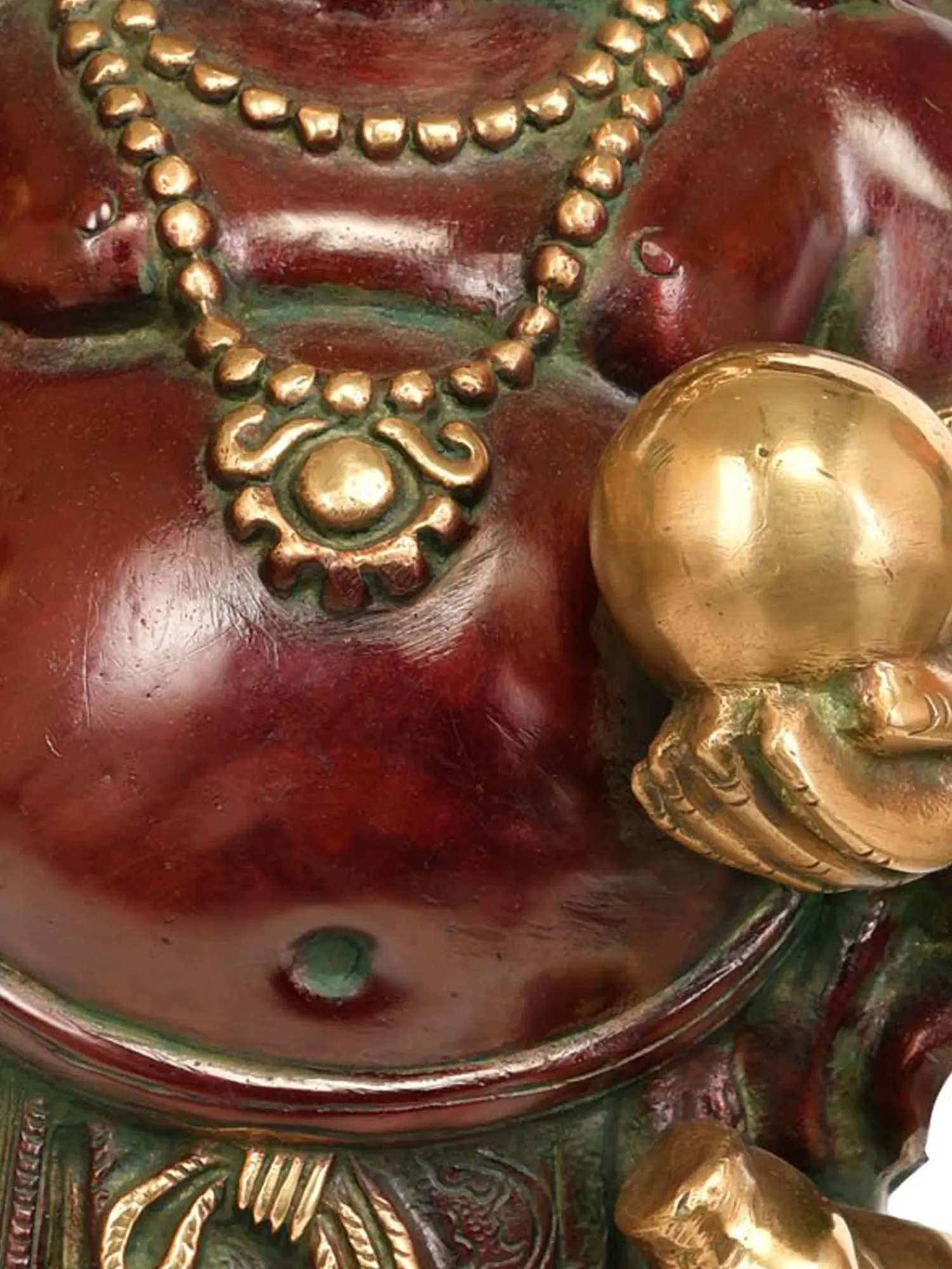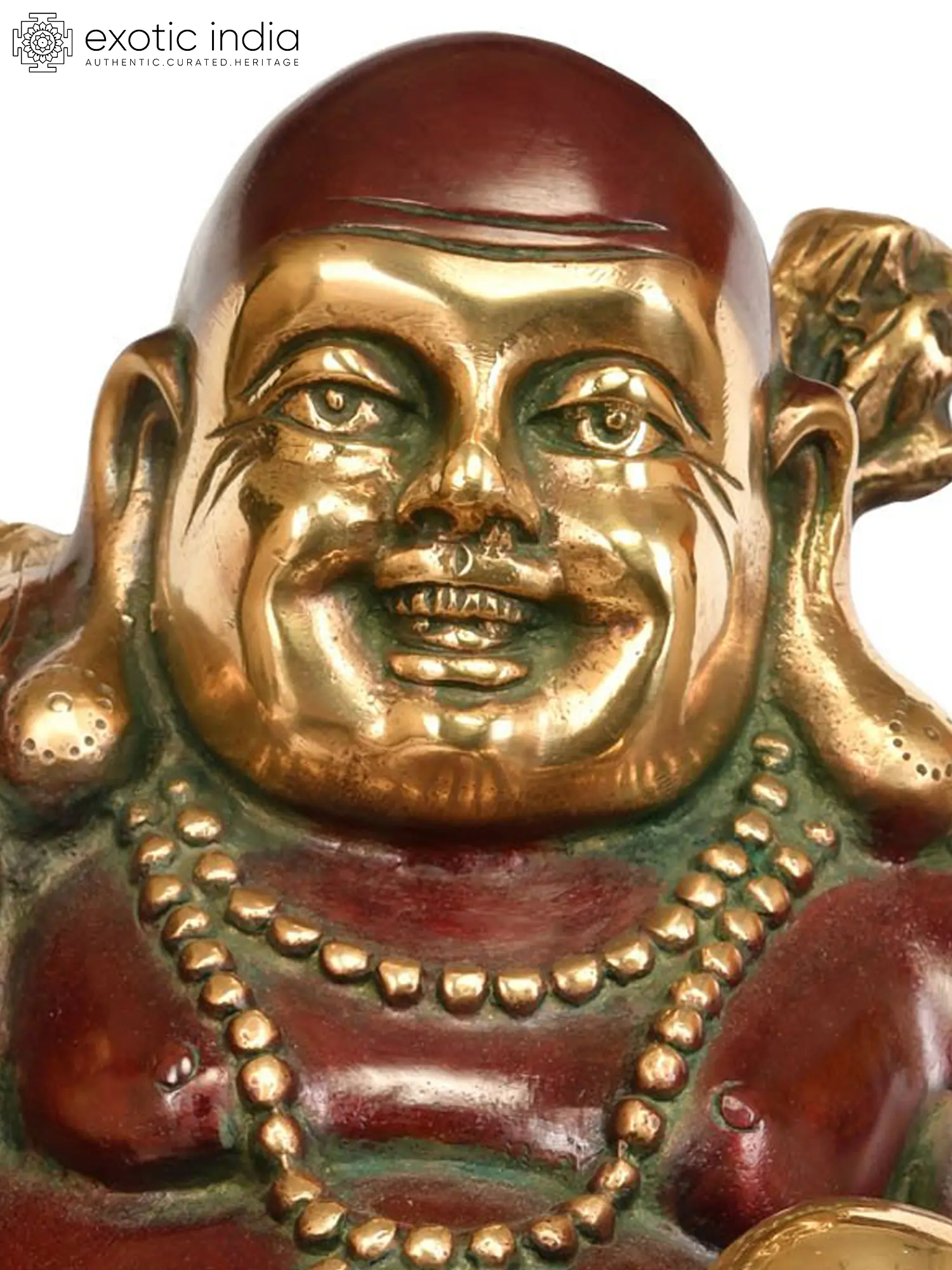This sculpture masterfully portrays the characteristics associated with the Laughing Buddha. His broad, beaming smile is the focal point, conveying an unshakeable sense of joy and mirth. Adorned with intricate bead necklaces and draped in flowing robes, the figure is further enhanced by the rich detailing that speaks to the skill of the artisan. In his hand, he often holds a precious orb, symbolizing wealth and good fortune, and sometimes a string of prayer beads or a wealth-invoking pouch. The vibrant contrast between the deep bronze hues and the subtle green patination on certain areas adds depth and visual interest, highlighting the intricate craftsmanship. This statue is not merely an object but a conduit for positive energy, designed to attract luck, wealth, and happiness to its surroundings. Its substantial size makes it a commanding yet comforting presence, ideal for placement in a prominent location where its benevolent spirit can be fully appreciated. Each curve and contour is a testament to the dedication and expertise of the Indian artisans who brought this divine form to life, ensuring a unique and cherished piece for generations to come.