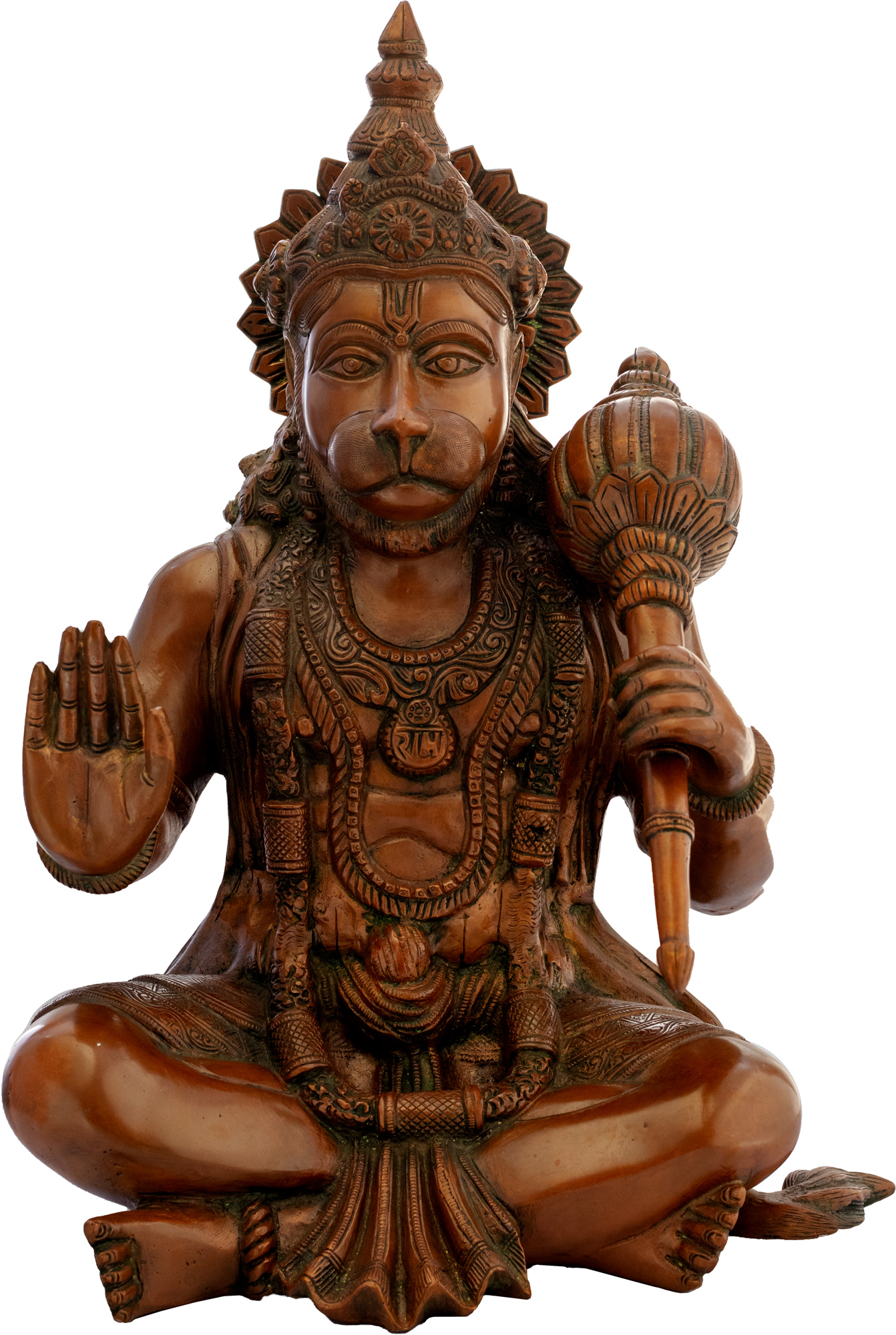 This statue of Hanuman representing him seated cross-legged as in Yoga-mudra, and his right hand held granting abhaya – protection from fear, is a form of his image rarely represented in arts, and not much consistent to his personality and overall cult. The most humble divinity Hanuman always claimed for him the status of the Rama’s servant, even that of his emissary only rarely. In some of the moments of crisis he even rescued his master Rama but his humility made him announce only that not a grain of his strength is his own, and whatever he has he draws perpetually from his master. Obviously, the masters’ assumptive posture, as reveals in abhaya-granting mode, could hardly be an humble servant’s bearing. Commemoration of the name of Rama apart, Hanuman is not known to resort to any formal rituals and Yoga like formal practices. Even a sitting posture does not much befit with his overall personality of an alert servant always on heels. Hence, a statue representing him as seated in Yogasana reveals new dimensions of his image.