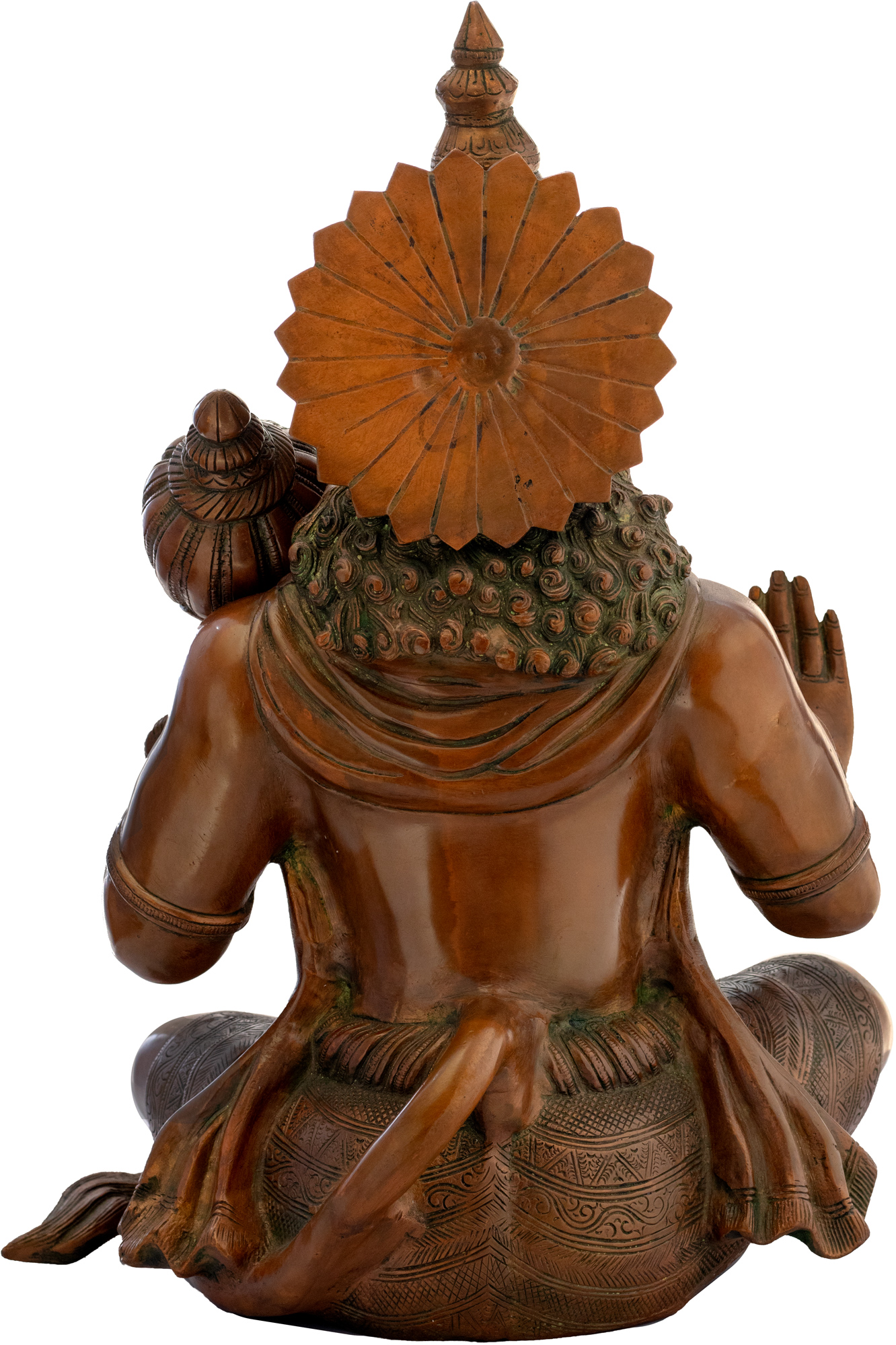 One of the most loved Indian deities, and far widely worshipped with a greater number of shrines dedicated to him than to his master Rama, this brass statue represents Hanuman as seated cross-legged with no formal seat, even a simple pedestal, under him, carrying in his left hand his most usual attribute mace, while the right is held in the gesture of granting ‘abhaya’, one, assuring freedom from fear, and other, ensuring it. Though greatly refined, in the style of face with greater emphasis on its monkey-aspect, voluminous and bold figure with tough look, and in heavily conceived ornaments the image reveals Hanuman’s basic ethnic character. As contend many scholars, like Kali Hanuman too was a divinity worshipped since long by aboriginal tribes, and in whatever degree, that ethnicity has been always an inevitable element in his imagery.