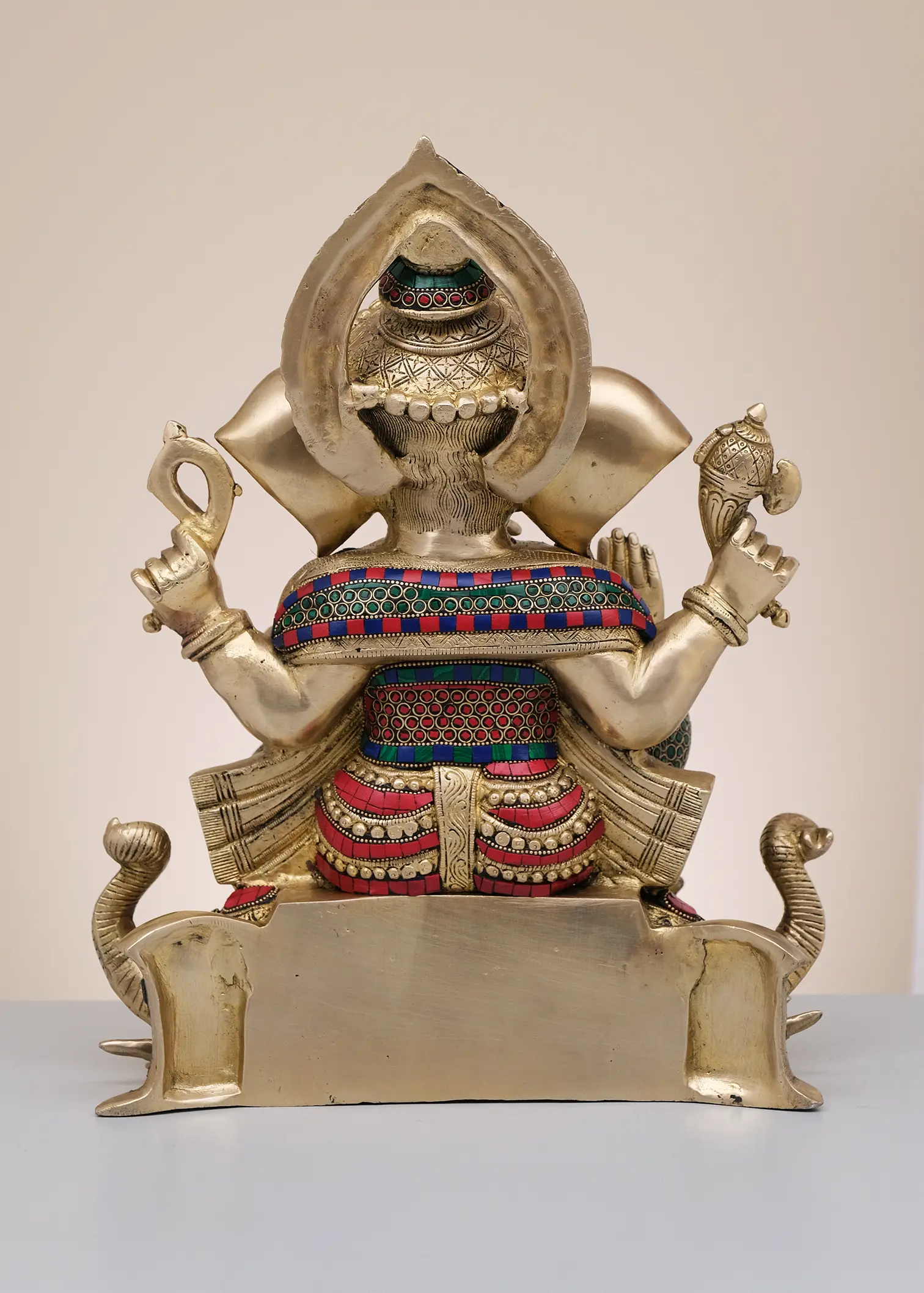 17" Brass Lord Ganesha Seated on Elephant Pedestal with Inlay Work | Handmade