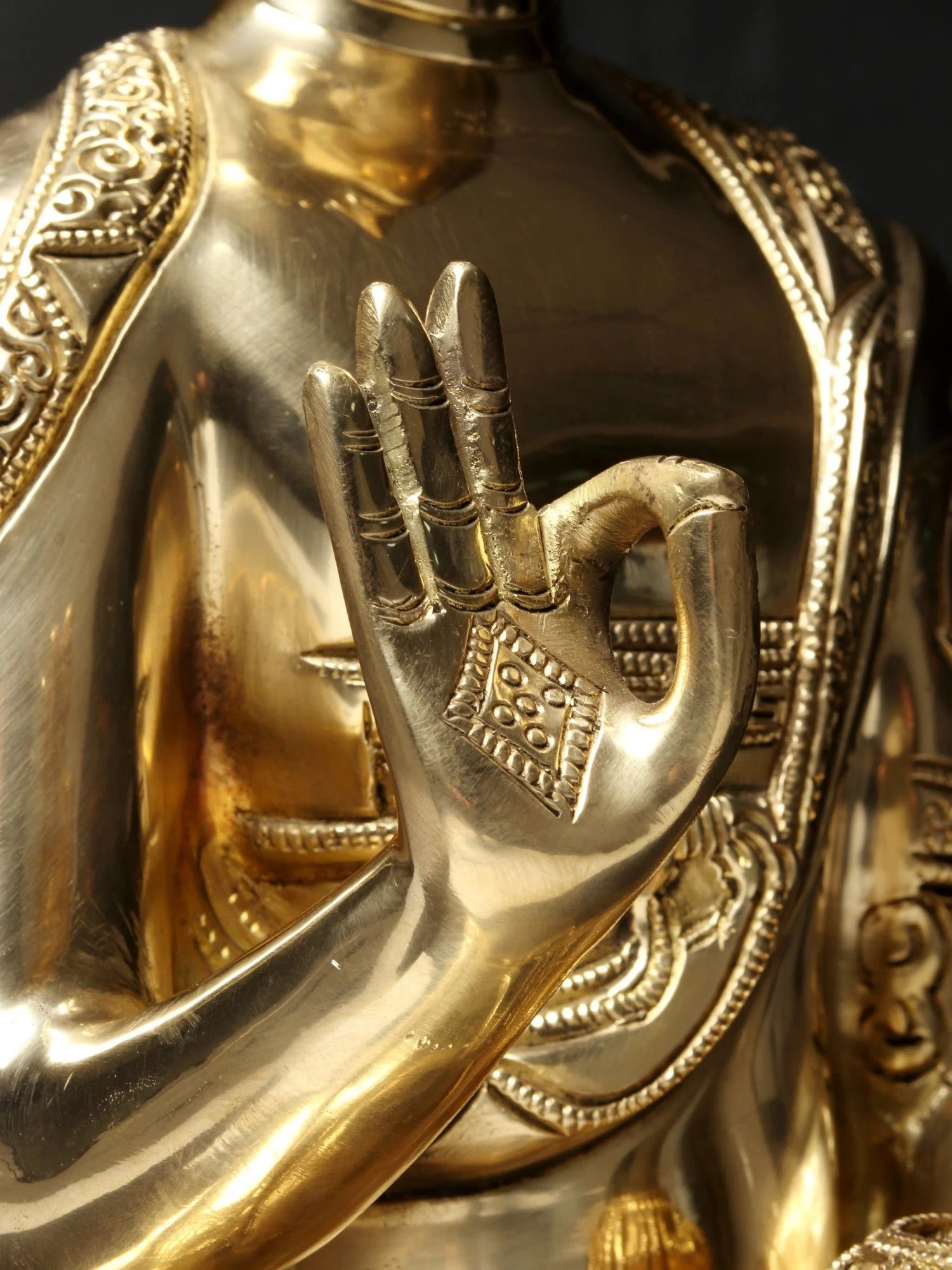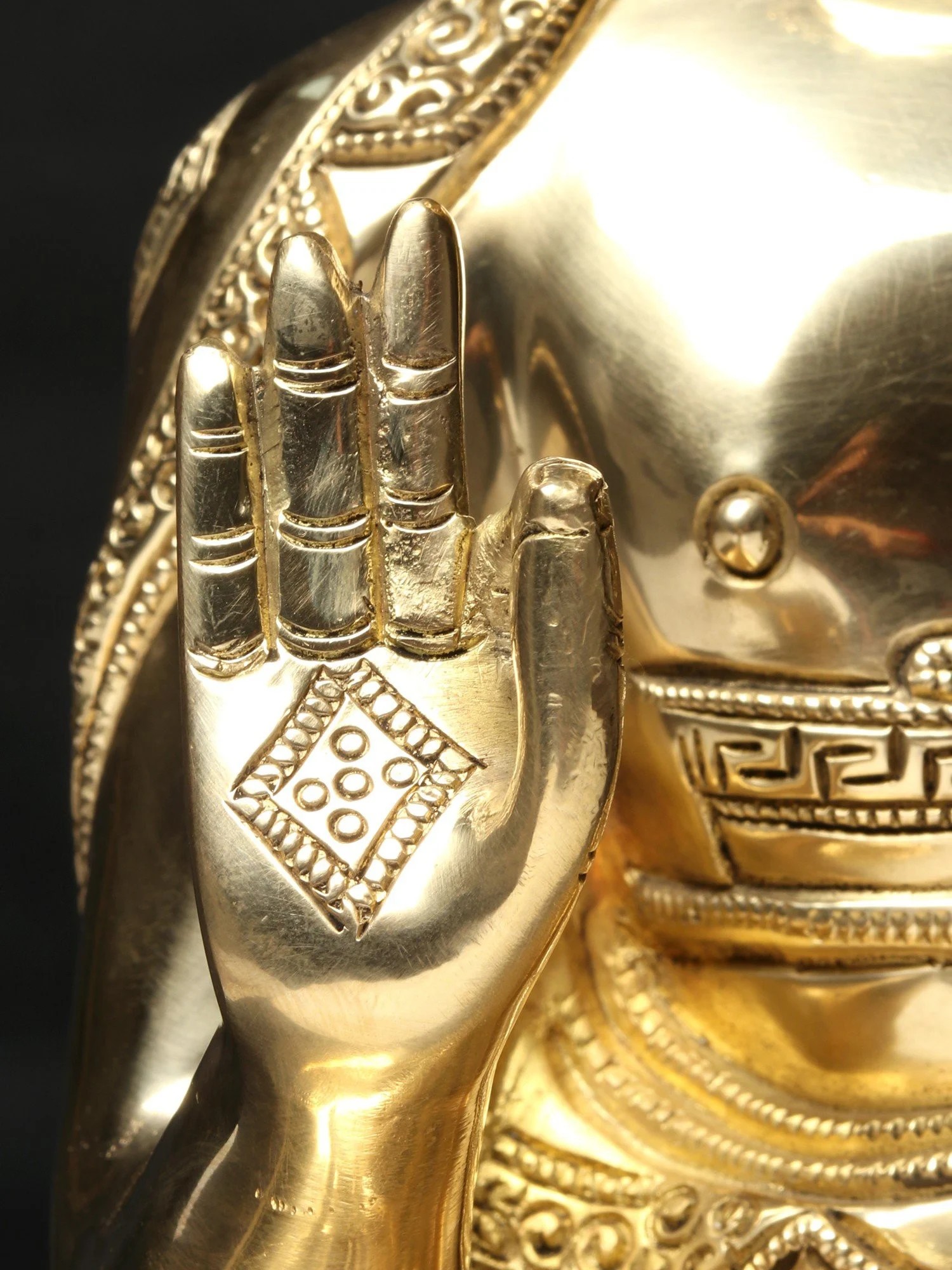 The Vitark Mudra, often depicted with one hand raised slightly, palm outward, and the other resting gently on the lap, holds deep symbolic weight in Buddhist tradition. This posture often represents the Buddha's act of teaching and disseminating the Dharma—the teachings of the Buddha aimed at liberation from suffering. It suggests a moment of active engagement, a dynamic interplay between the teacher and the disciple, and the ongoing process of spiritual growth and understanding. This mudra encapsulates the essence of the Buddha's life's work, dedicated to sharing wisdom and guiding others toward enlightenment. Ancient Buddhist texts, scrolls, and sculptures from across Asia offer countless examples of this significant gesture, testifying to its enduring importance across various Buddhist sects and throughout history. The subtle details of the statue, especially the nuanced gesture of the hands, bring the timeless essence of the Vitark Mudra to life.