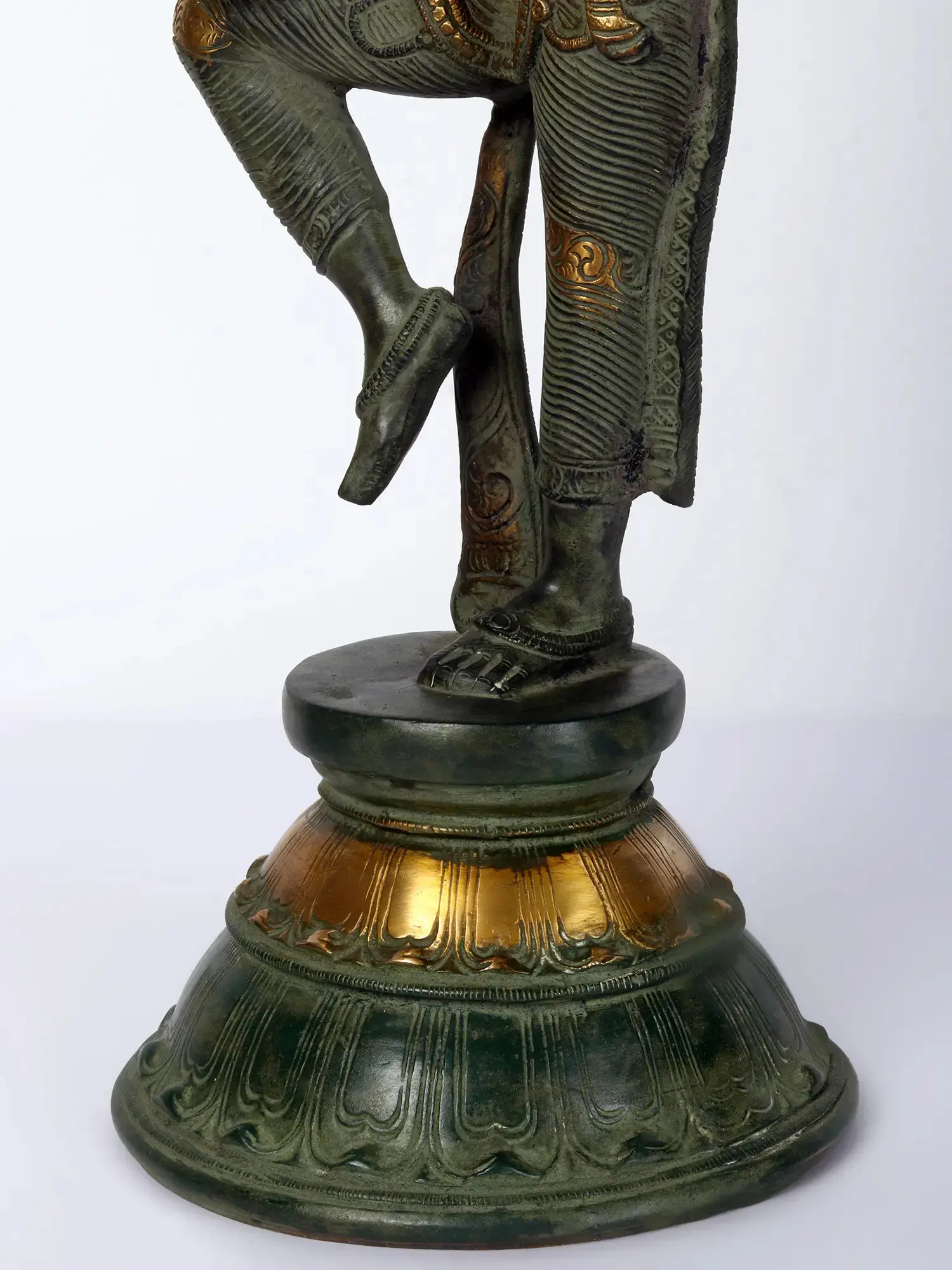 On an inverted lotus pedestal, the celestial maiden of heaven is brought to the realm of humans, in this beautiful brass statue of a dancing Apsara. The Apsara strikes an animated posture, raising her right leg by bending her knee, while placing her body weight on her left leg, creating a beautiful balance in the icon. Her hair is tied in a high-raising hairdo and her form is adorned in a traditional manner, which spreads a fragrance of beauty and divinity in the ambiance.
