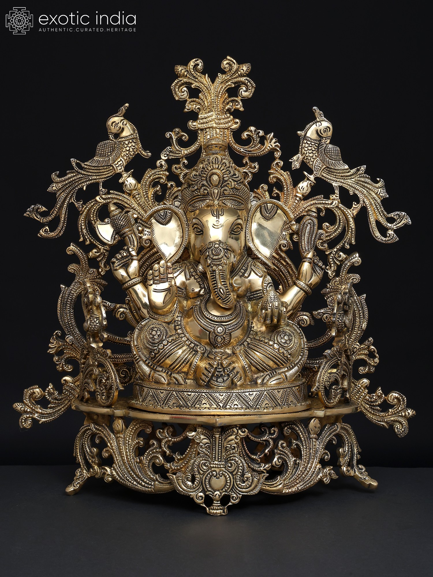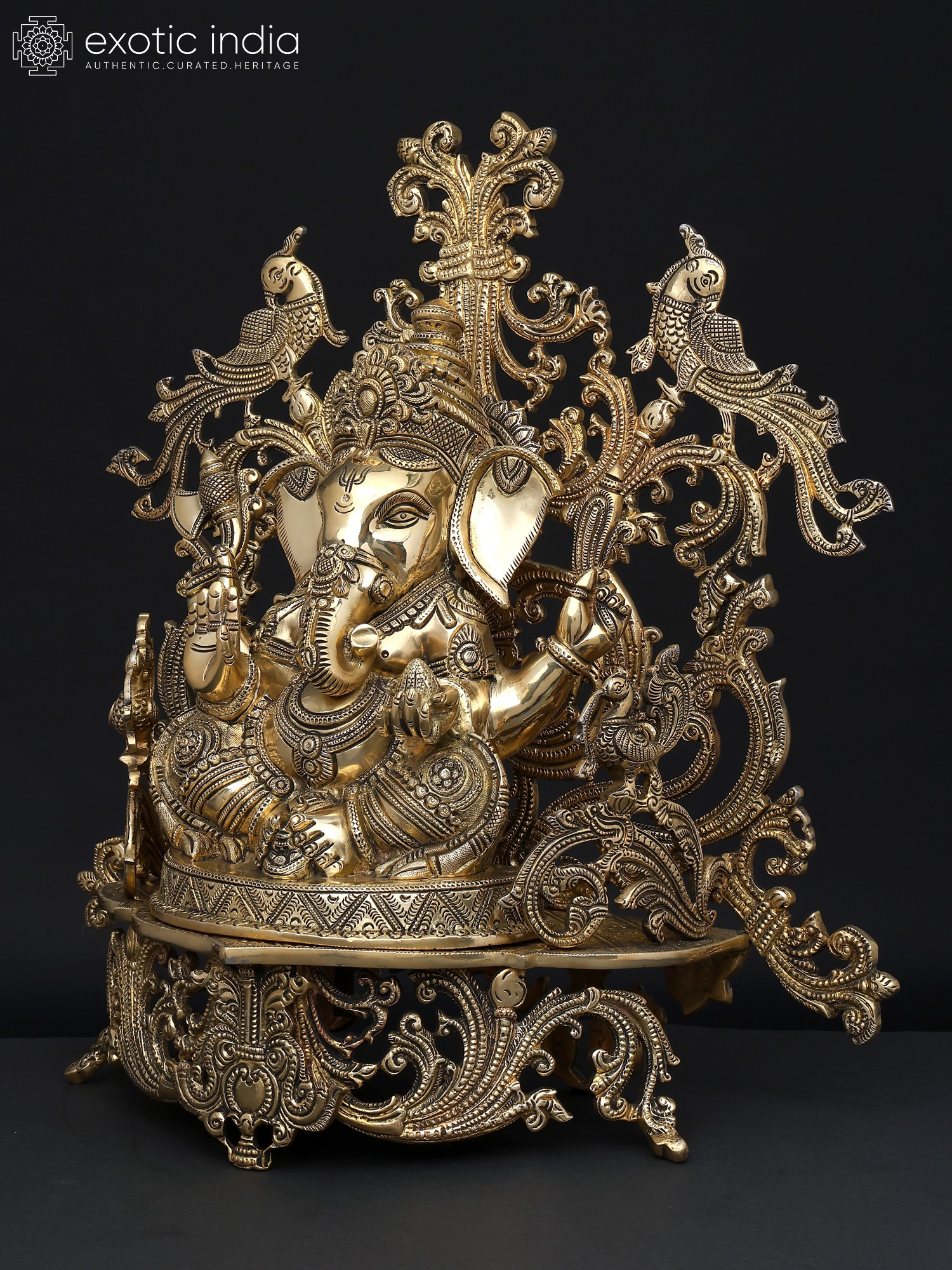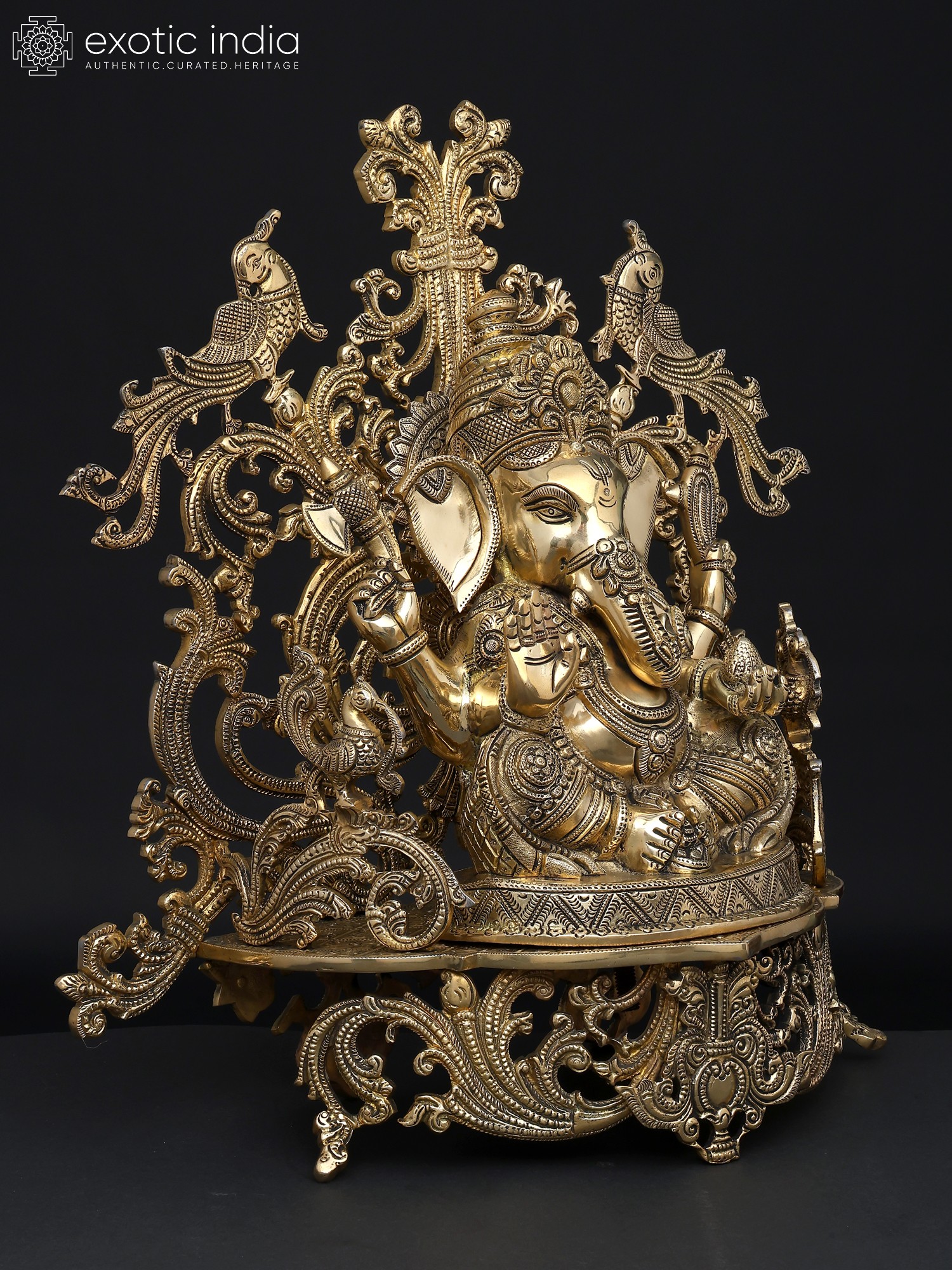 32" Brass Ganesha Idol Relaxing on Peacock Recliner | Brass Staute with Inlay Work