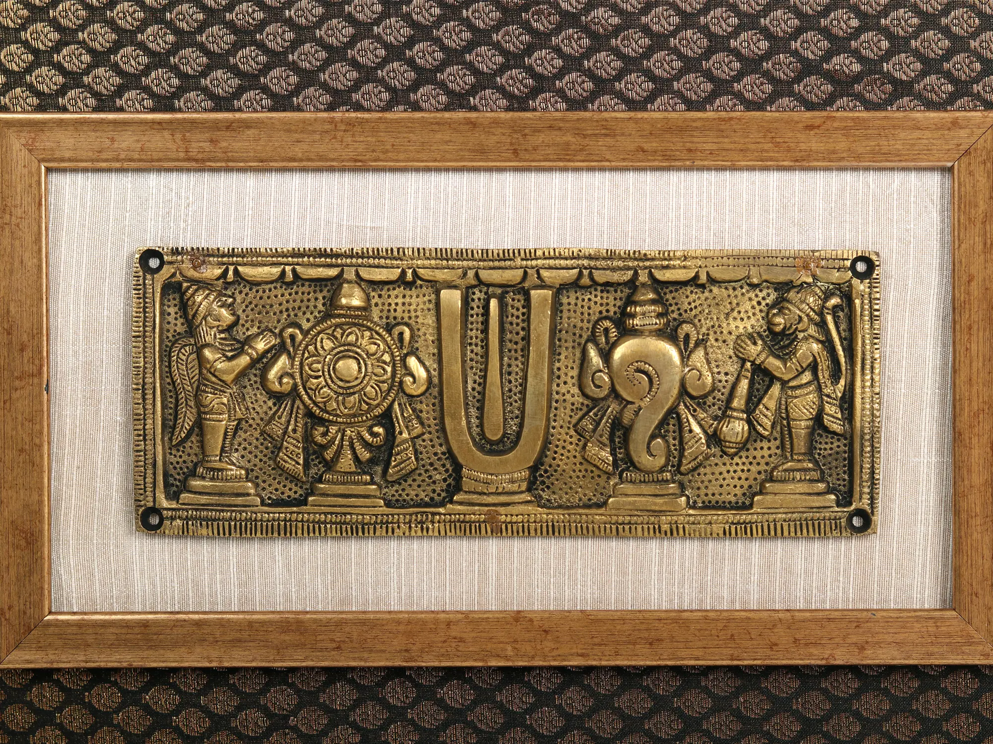 This wall hanging portraying the three fortunate Vaishnava emblems is a work of art rich in religious symbolism. Lord Vishnu is associated with three symbols in Hinduism: Urdhva Pundra (elevated mark), Panchajanya (conch), and Sudarshana Chakra (auspicious disc). He is depicted with the Urdhva Pundra on his forehead and the Panchajanya conch and Sudarshan Chakra, which symbolize heavenly might. This holy work of art combining all three emblems in one spot provides worshippers with an out-of-this-world experience. The symbols are further seen worshipped by Garuda and Lord Hanuman, enhancing the holiness manifolds. The wall hanging is beautified by the use of ivory and black jacquard clothes and a sturdy wooden frame. Having this item in your home will undoubtedly draw all of the auspiciousness linked with each symbol and will boost the positivity of the room.