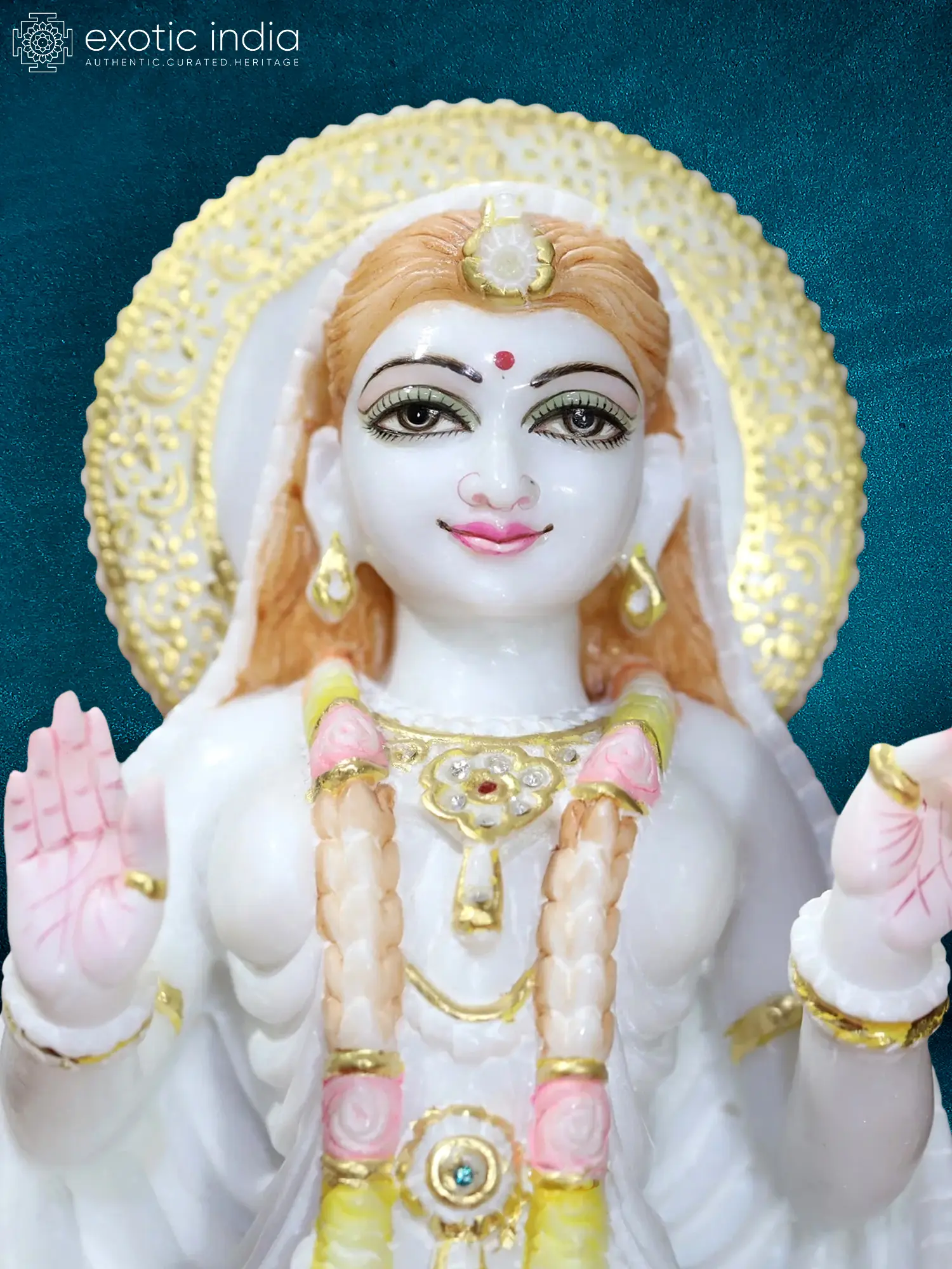 The artistry displayed in this statue is truly remarkable. The sculptor has masterfully brought the form to life through meticulous carving and a keen eye for detail. The delicate features of the goddess's face, the gentle flow of her hair, and the precise rendering of her adornments all speak to the skill and dedication of the artisan. The contrasting colors and textures, achieved through the use of the pure white marble and what appears to be subtle coloration and metallic gilding, add depth and visual richness. The halo surrounding the goddess's head, intricately designed, further emphasizes her divine radiance. This piece is a testament to the enduring legacy of Indian marble sculpture, blending traditional aesthetics with a profound spiritual narrative. It serves as a captivating centerpiece for any sacred space, home, or collection, inviting contemplation and reverence.