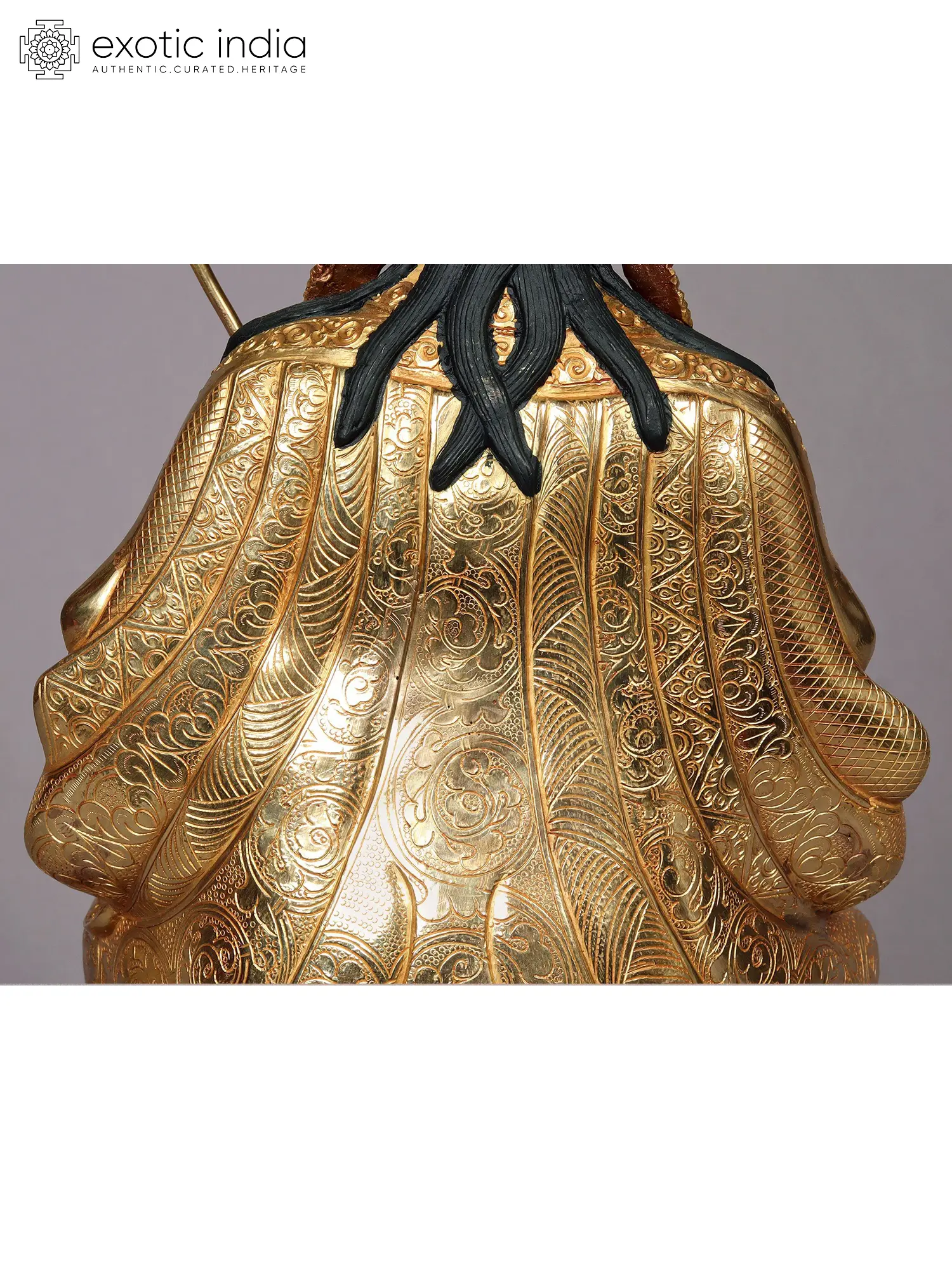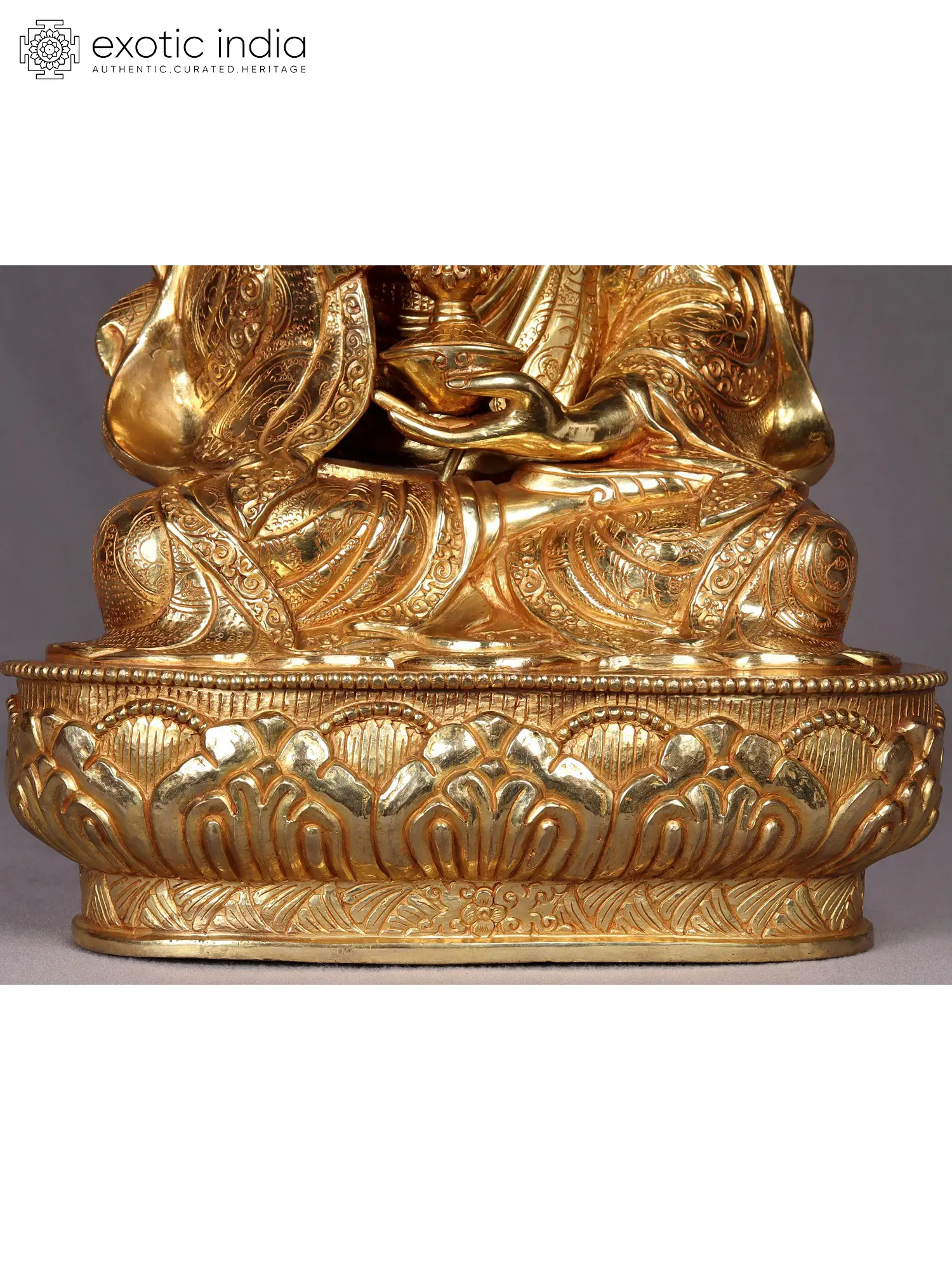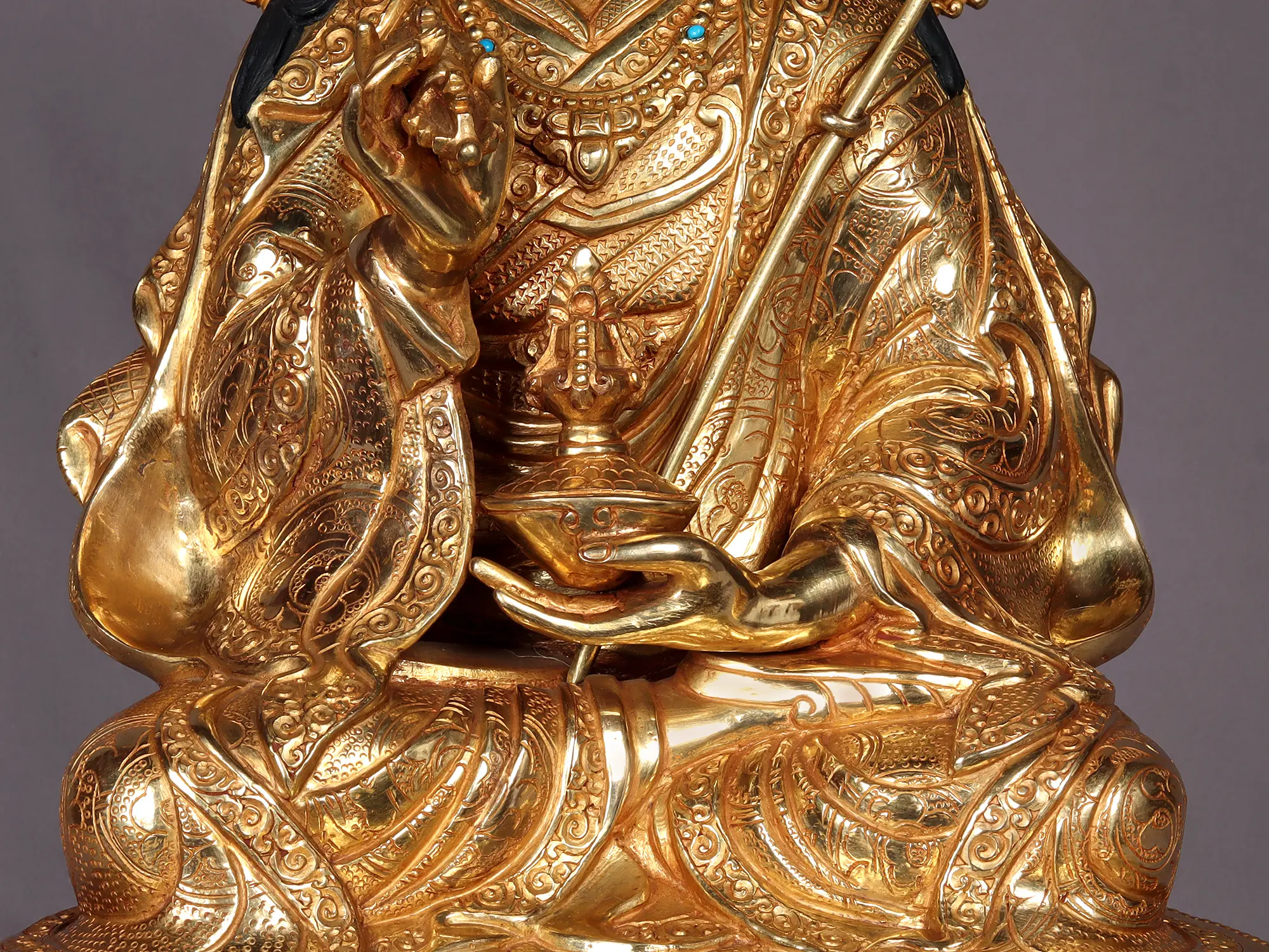 Padmasambhava, also known as Guru Rinpoche, holds a profound place in the history of Tibetan Buddhism. He is often depicted with a beard, a distinctive feature. In his left hand, Guru Rinpoche holds a skull cup filled with blood, while his right-hand grasps the Vajra, symbolizing both a thunderbolt and a diamond, representing his powerful and indestructible nature.