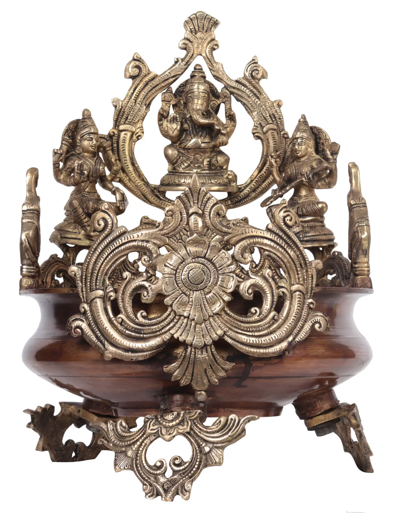 This brass urli is influenced by the Hoysala ornamentation style. It has a dark brown lacquer finish on the typical urli body and a silver finish on the front and back embellishments. The presence of pictures of Lord Ganesha in the middle and Goddess Lakshmi and Saraswati seated elegantly next to him is the most notable characteristic of this urli. Two elephants are seen paying their respects to this fortunate triad, which represents wisdom, riches, and success. This urli may be utilized to ensure that the benefits of this sacred triad are showered upon the believers.