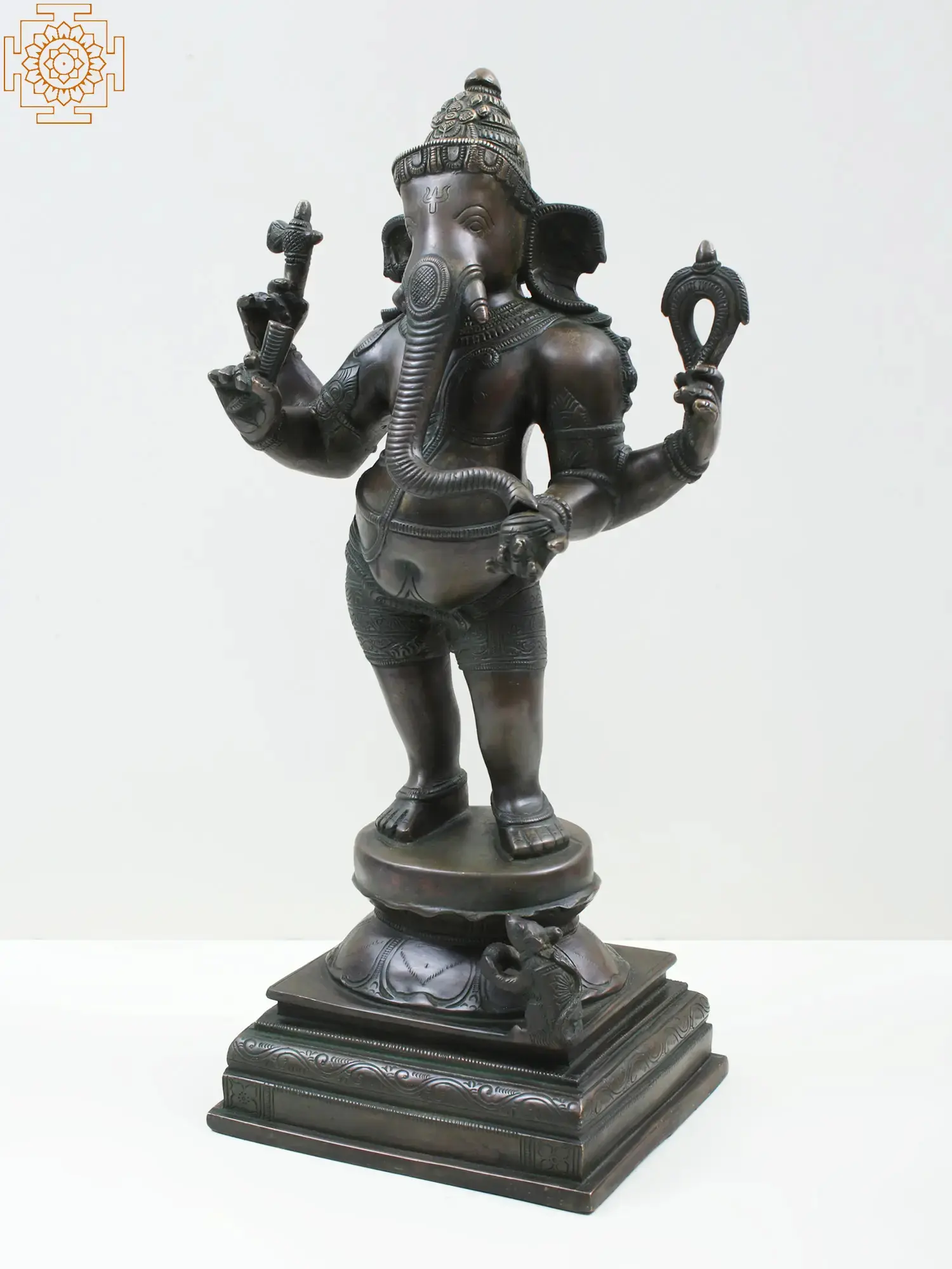 Invite auspiciousness and wisdom into your sacred space with this exquisite standing Ganesha brass sculpture. Standing tall and exuding a serene yet powerful presence, this magnificent piece is meticulously crafted from high-quality brass, ensuring its enduring beauty and spiritual resonance. Ganesha, the beloved elephant-headed deity, is revered as the remover of obstacles, the patron of arts and sciences, and the intellect. This sculpture captures his divine essence with remarkable detail and artistry.