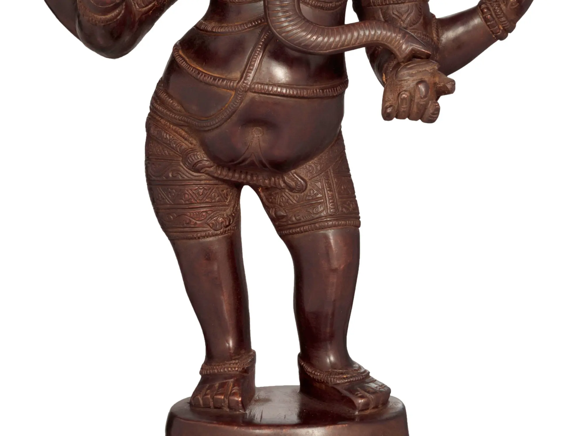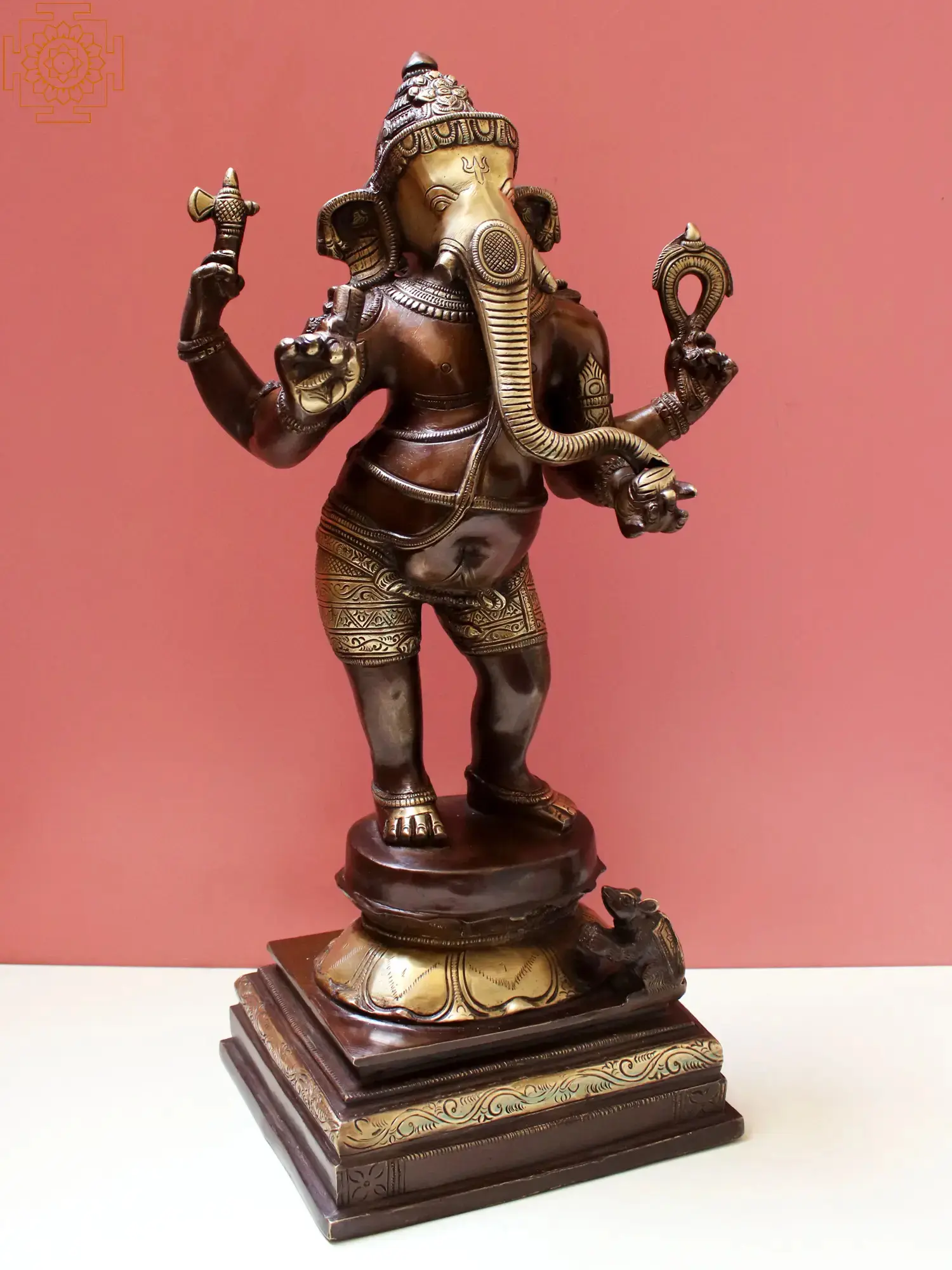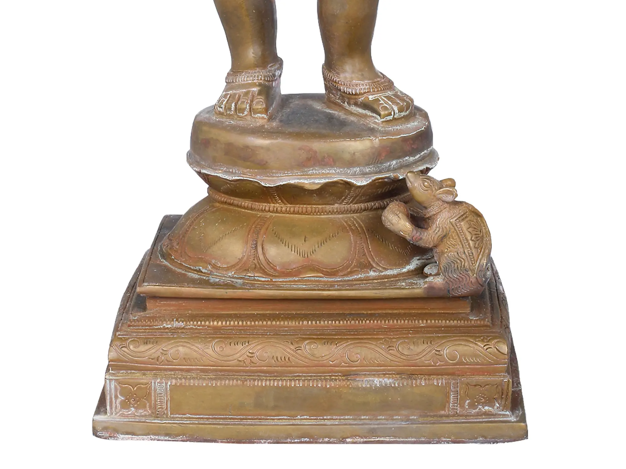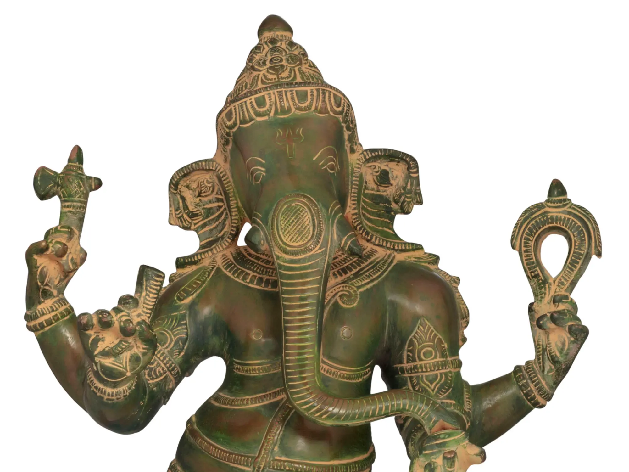 This standing Ganesha sculpture is a testament to the skill and dedication of master artisans. The intricate detailing across the figure, from the finely sculpted ornaments to the textured headdress and the dynamic posture, showcases a deep understanding of traditional iconography and a keen eye for aesthetic appeal. The lustrous brass medium lends a timeless gravitas to the piece, radiating a warm, inviting glow that enhances its spiritual aura. The slightly aged patina adds a sense of antiquity, evoking the sacred traditions from which this divine form originates. The stable, ornate base provides a fitting pedestal for the deity, further accentuating his majestic stance. This sculpture is not merely an object of decoration but a conduit of spiritual energy, designed to inspire contemplation and foster a deeper connection with the divine.