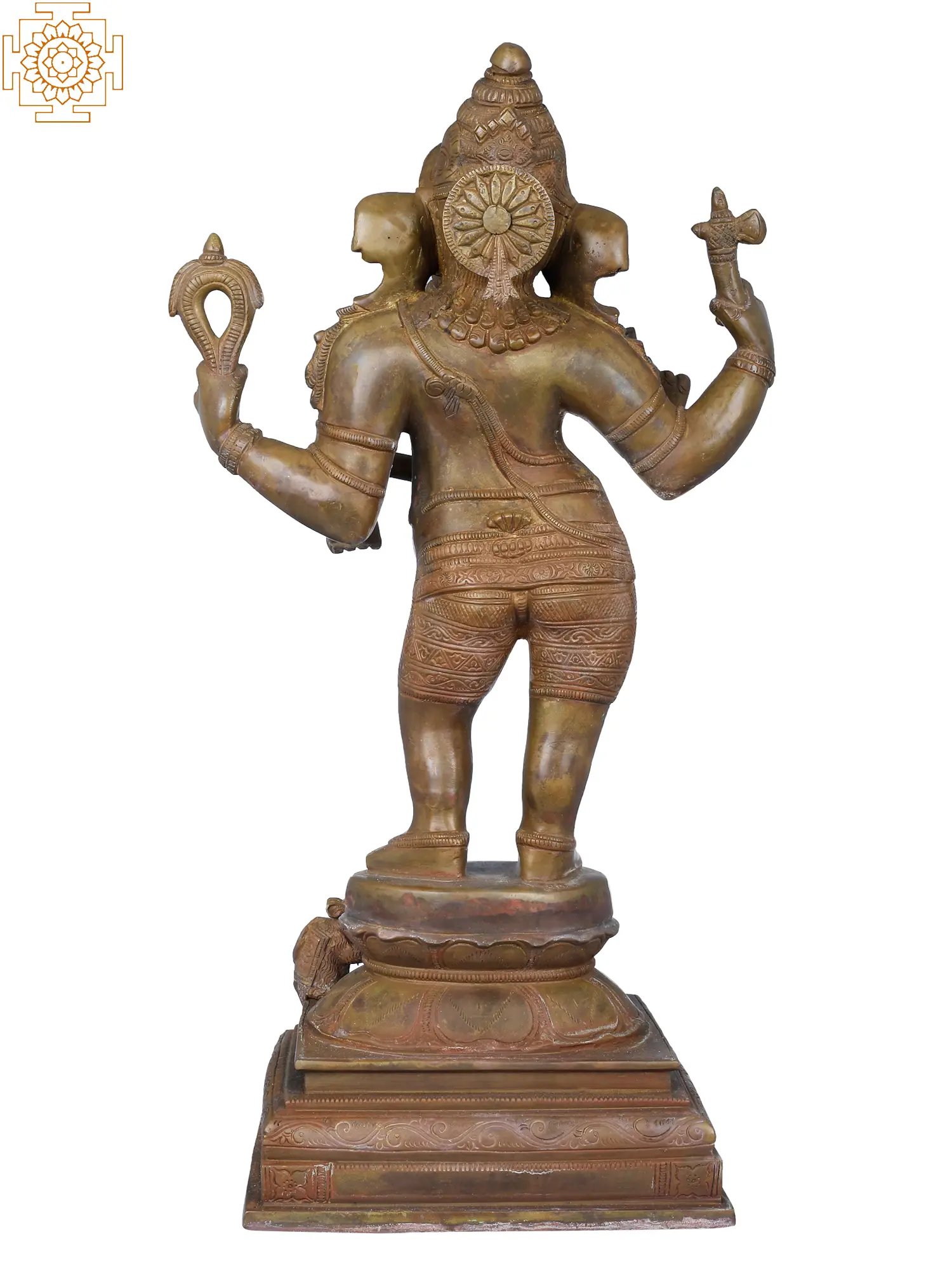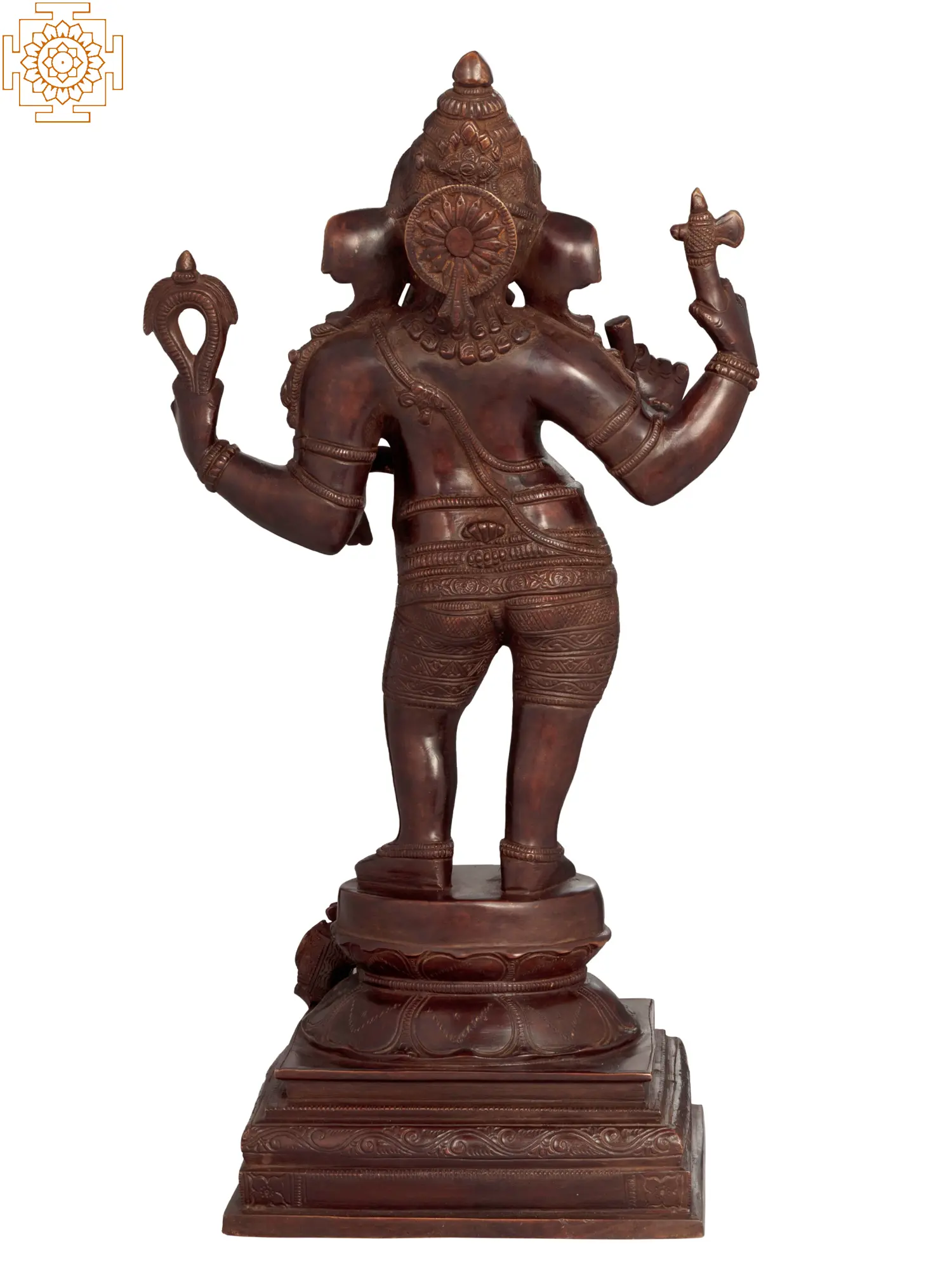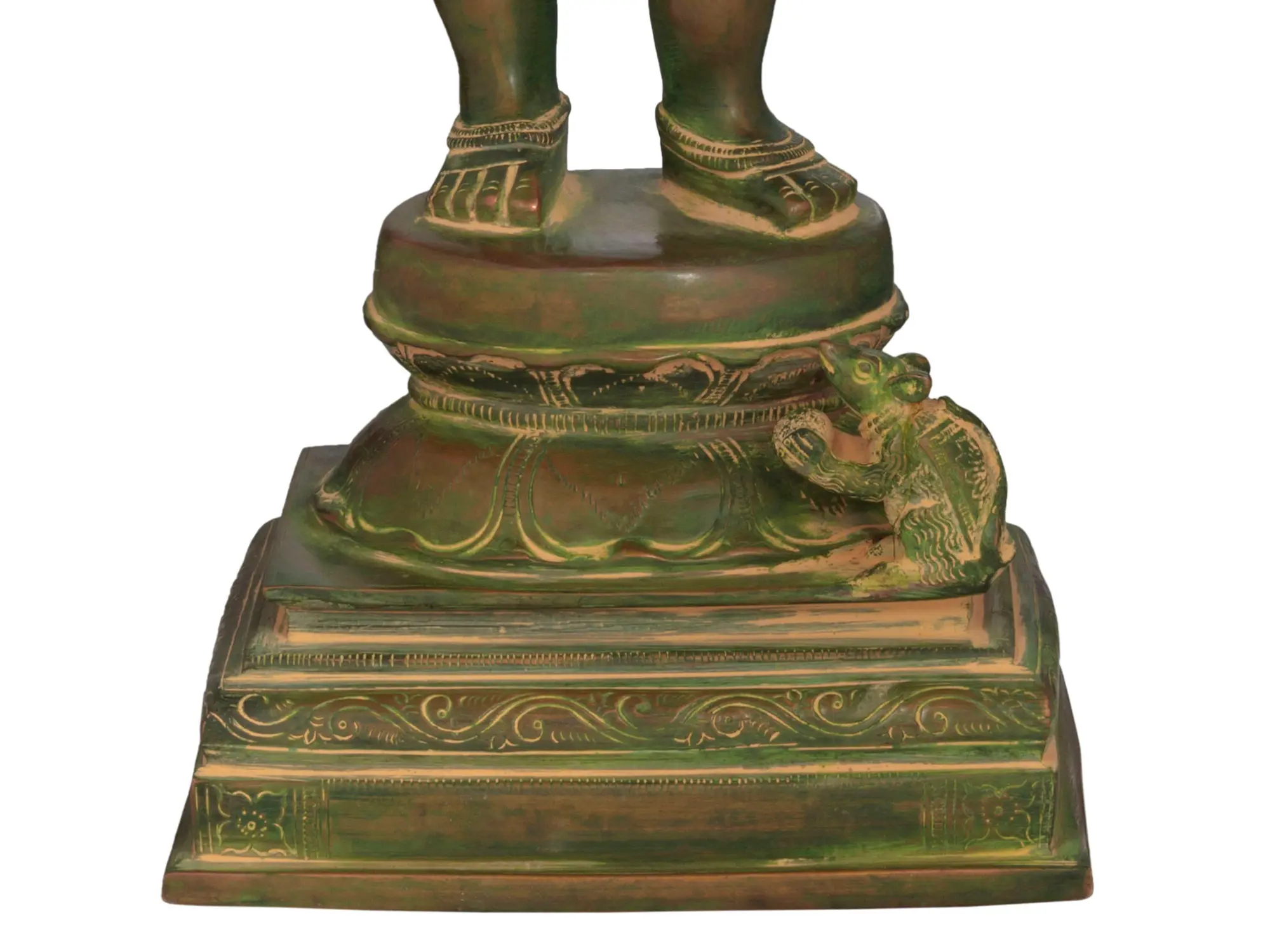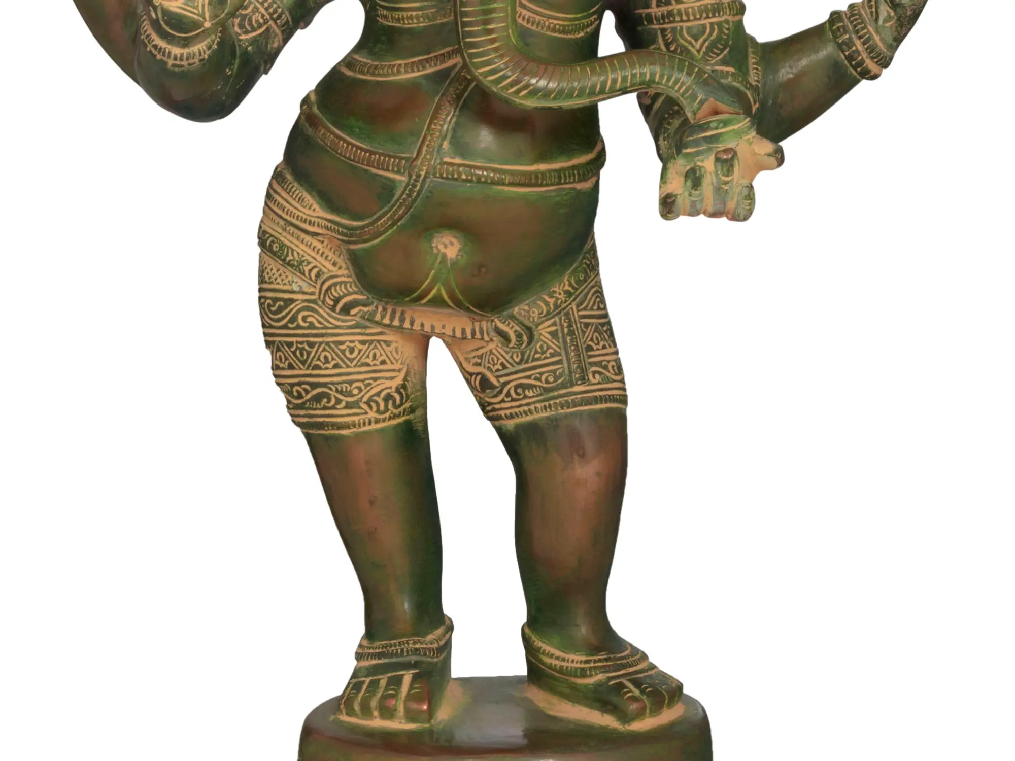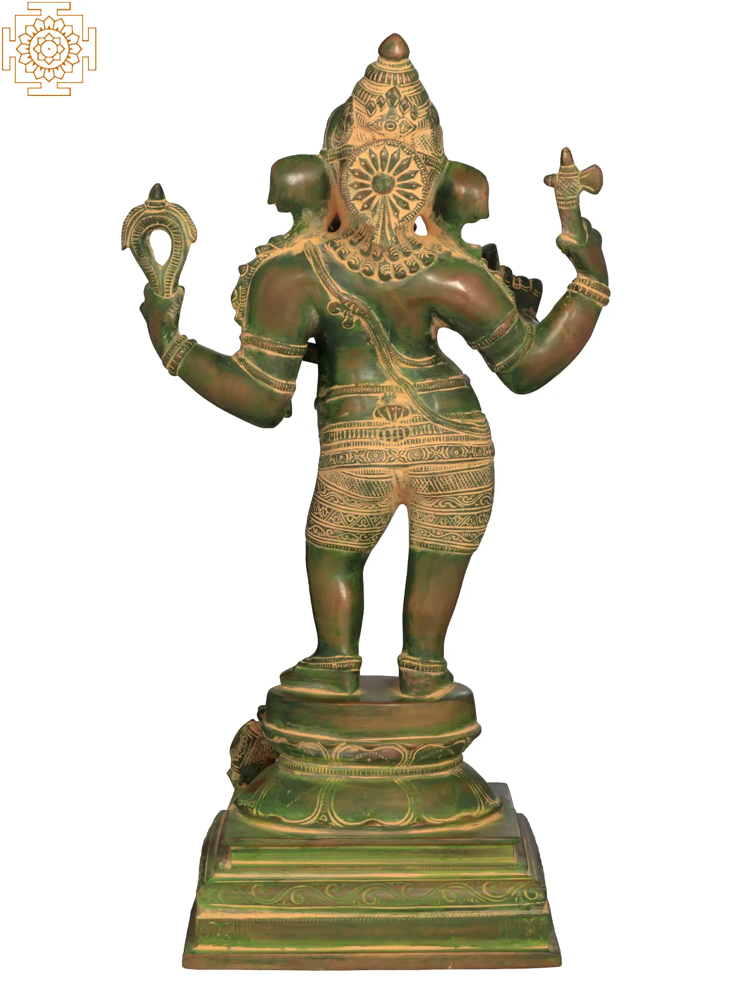 This standing Ganesha sculpture is a testament to the skill and dedication of master artisans. The intricate detailing across the figure, from the finely sculpted ornaments to the textured headdress and the dynamic posture, showcases a deep understanding of traditional iconography and a keen eye for aesthetic appeal. The lustrous brass medium lends a timeless gravitas to the piece, radiating a warm, inviting glow that enhances its spiritual aura. The slightly aged patina adds a sense of antiquity, evoking the sacred traditions from which this divine form originates. The stable, ornate base provides a fitting pedestal for the deity, further accentuating his majestic stance. This sculpture is not merely an object of decoration but a conduit of spiritual energy, designed to inspire contemplation and foster a deeper connection with the divine.