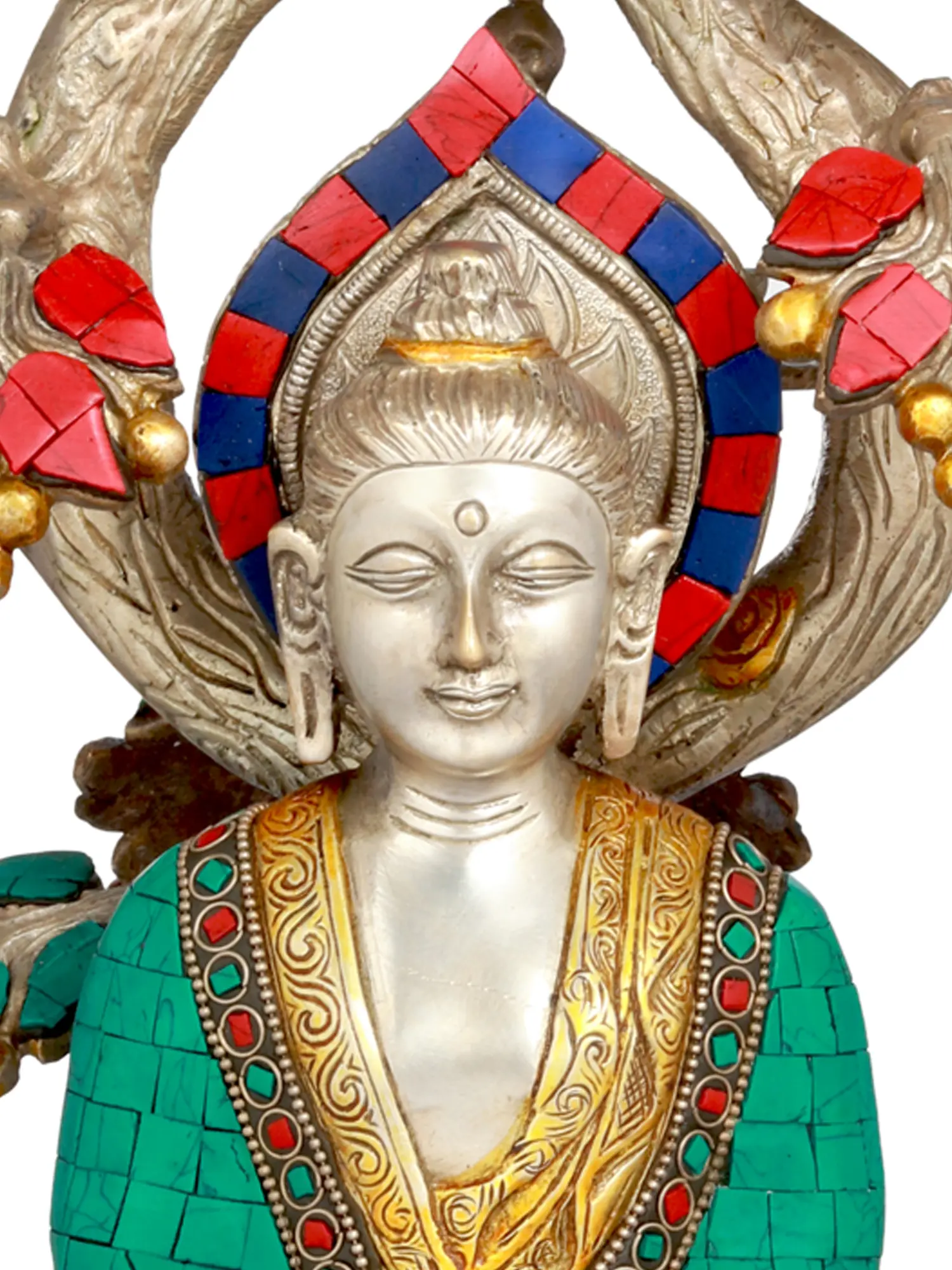 The craftsmanship of this piece is truly captivating. The Buddha's serene countenance, with eyes gently closed in deep contemplation, invites a sense of reverence. His monastic robes are depicted with flowing lines, intricately adorned with colorful inlays of turquoise-like green and red stones, bordered by delicate gold-colored brass work. These vibrant colors are not merely decorative; they often represent different aspects of spiritual attainment and the interconnectedness of all things. The lotus-shaped pedestal upon which the Buddha sits is another significant element, symbolizing purity and spiritual elevation. The layered petals, also embellished with contrasting inlays of blue, red, and yellow, elevate the entire composition, signifying the Buddha's transcendence above the mundane world. This piece is more than a statue; it is a meticulously crafted narrative, a tangible representation of spiritual pursuit and the attainment of ultimate peace, ready to bring its serene presence to your sacred space.