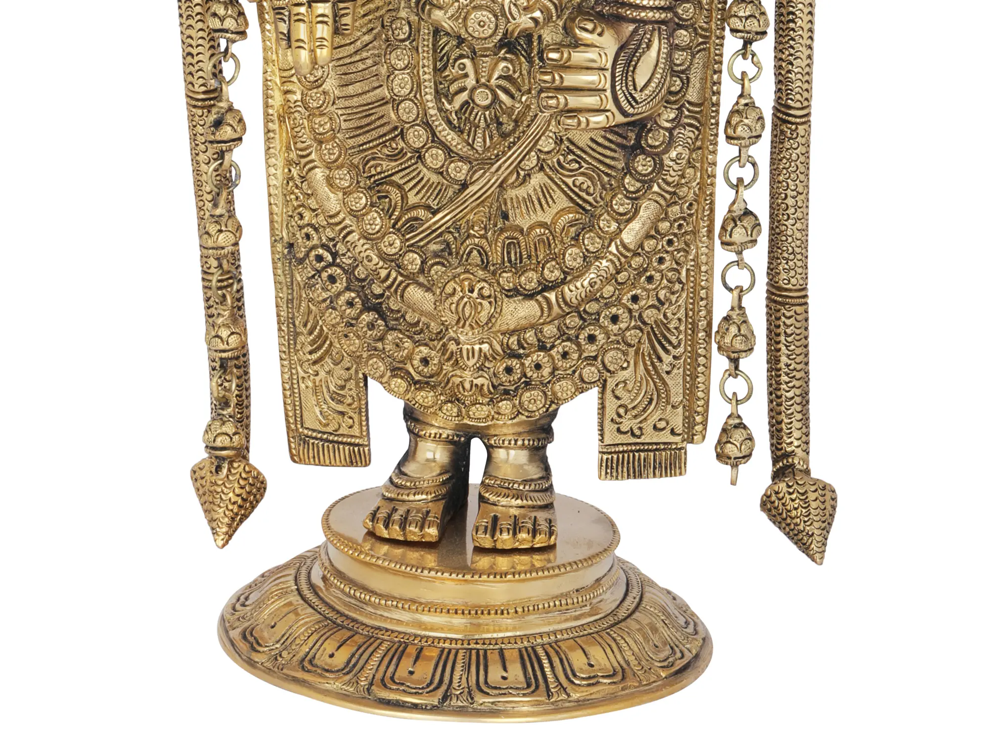 Invite the blessings and divine grace of Lord Venkateshwara, also known as Balaji, into your home with this exquisite brass statue. Standing at an impressive height, this masterpiece captures the serene and benevolent form of the presiding deity of Tirumala Tirupati, one of the most revered pilgrimage sites in Hinduism. Crafted with meticulous attention to detail, the statue embodies the spiritual essence and grandeur associated with Lord Venkateshwara. The intricate ornamentation adorning the deity speaks volumes about the skilled craftsmanship. From the elaborate headdress, symbolizing his cosmic sovereignty, to the cascading layers of his attire, each element is rendered with remarkable precision. The delicate carving of necklaces, armlets, and bracelets accentuates his divine splendor. The serene expression on his face, with eyes gently closed, conveys a profound sense of peace and compassion, inviting devotees to find solace and strength in his presence. The raised hand in *abhaya mudra* offers protection and reassurance, while the other hand, often depicted in *varada mudra*, bestows boons and blessings.