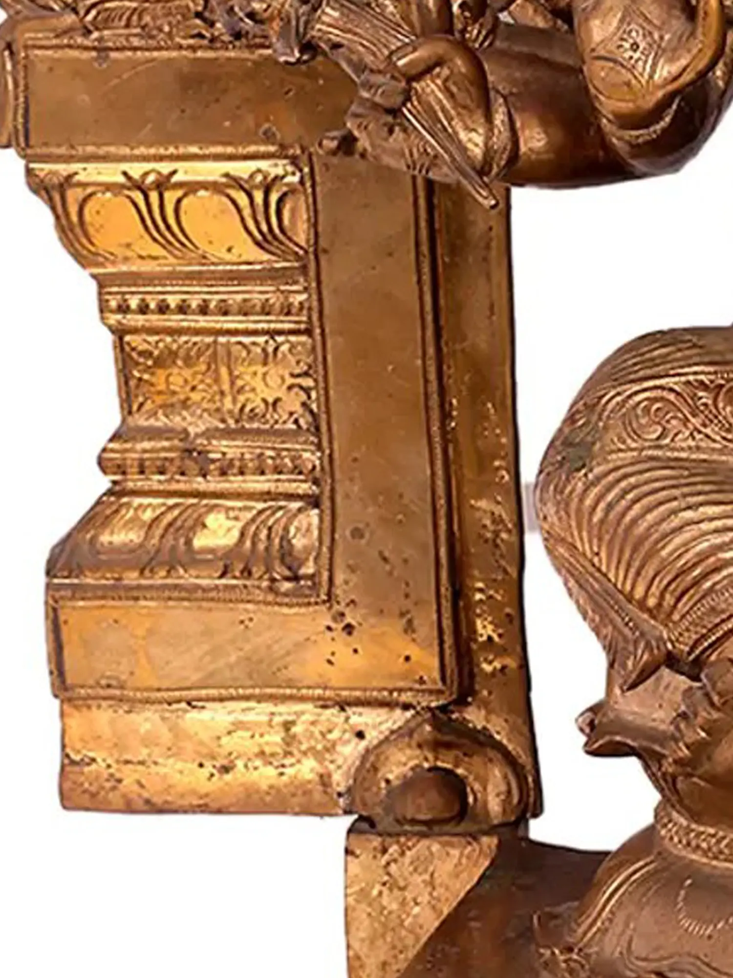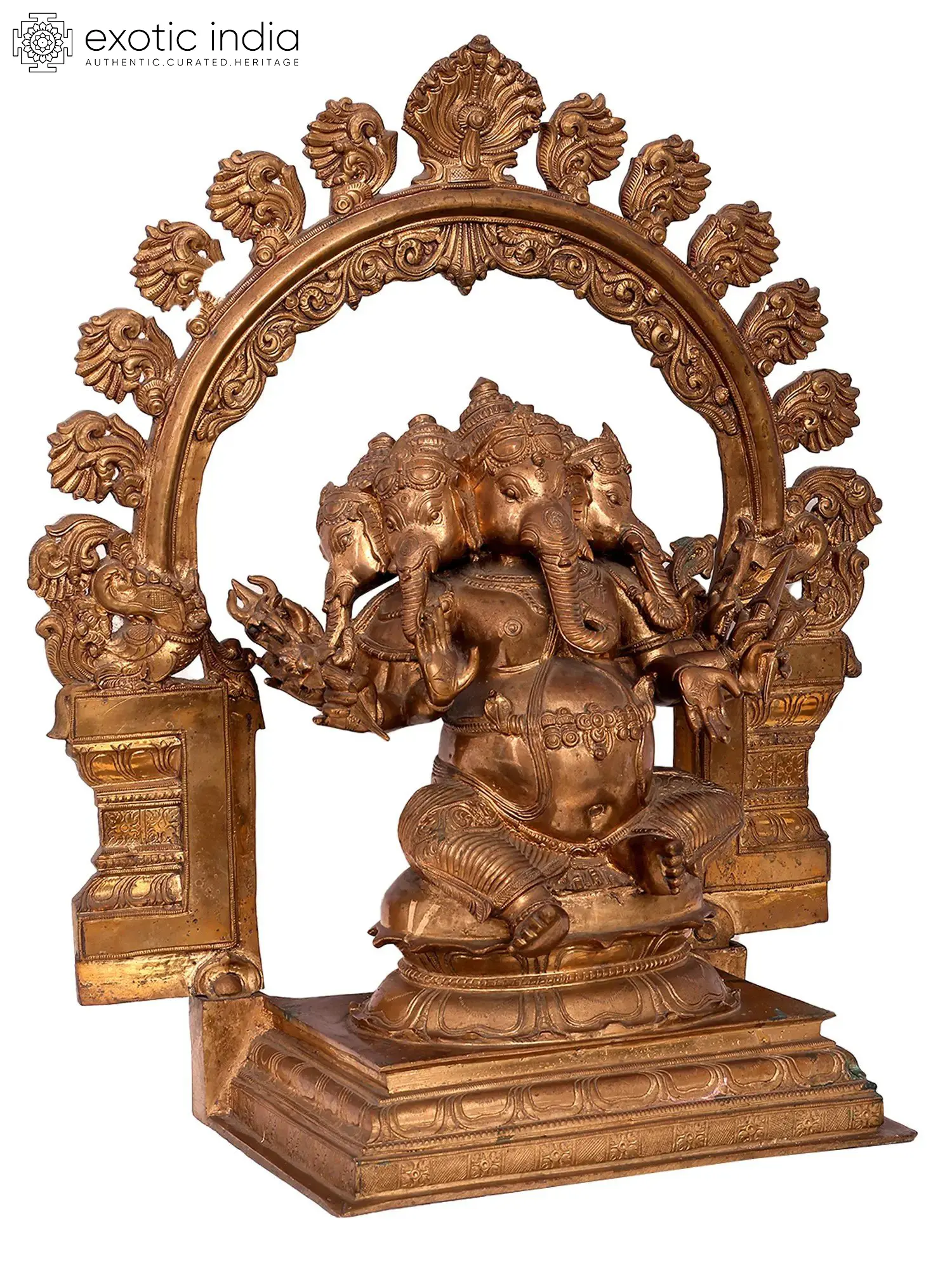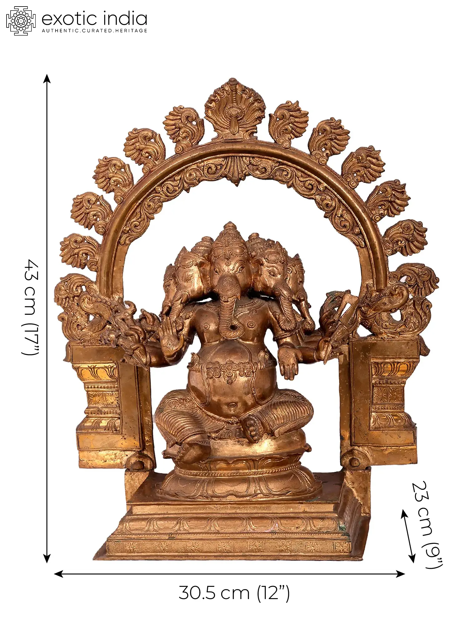 Temple pillars on either side of the seated figure, borrowing heavily from the ancient South Indian temple aesthetic. The same goes for the ornate archway above the five heads of Vinayaka. A baked gold colour with the unmistakable sheen of panchaloha, and texture replete with the finest iconographical details.