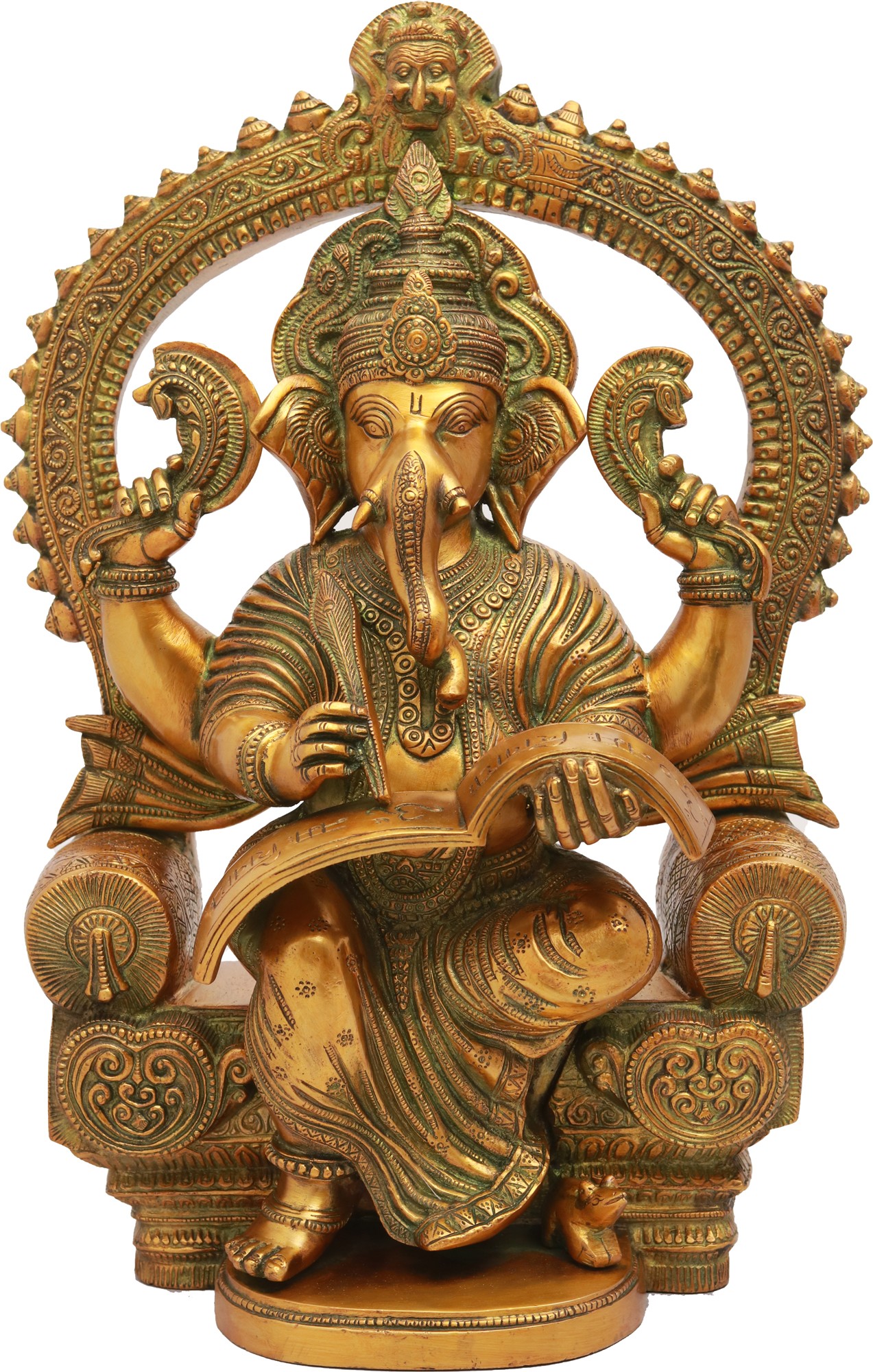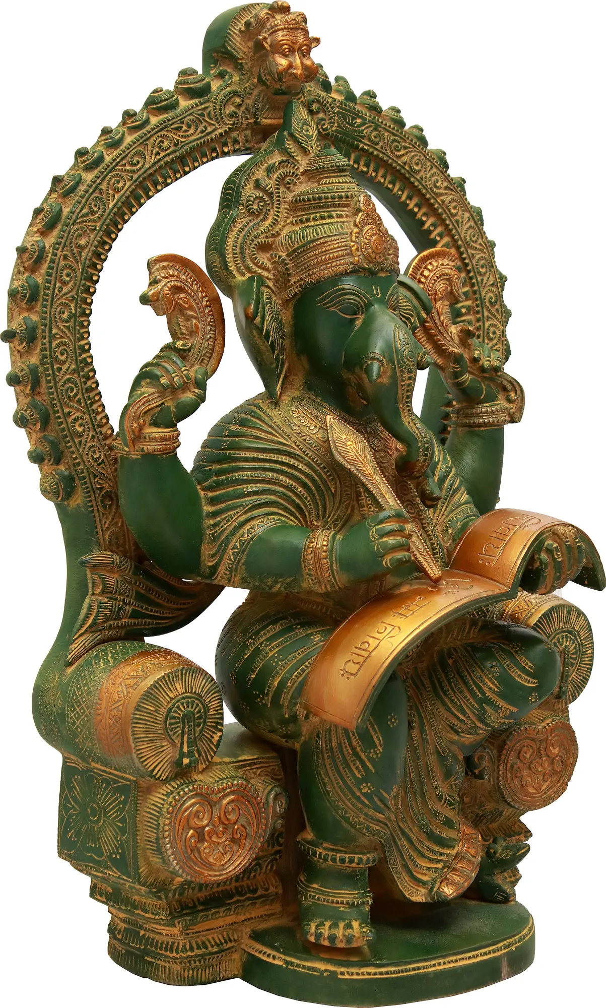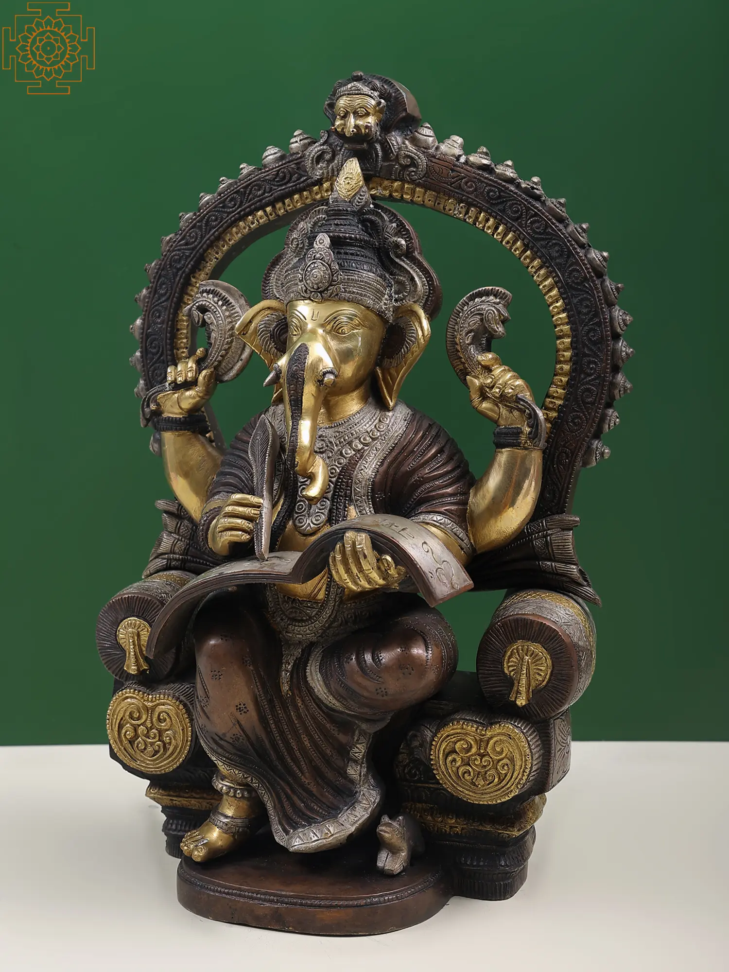 This magnificent brass statue captures Ganesha, the beloved elephant-headed deity, in a posture of profound contemplation and divine scholarship. Seated upon a majestic throne, he is depicted with his characteristic wisdom and gentle demeanor. The intricate craftsmanship, a testament to traditional Indian artistry, imbues this piece with a palpable sense of reverence and spiritual depth. The rich brass gleams, highlighting the elaborate details of his attire, his ornate crown, and the regal throne that cradles him. This is not merely a decorative item; it is an invocation of intellect, prosperity, and the removal of obstacles, bringing a sacred aura to any space.