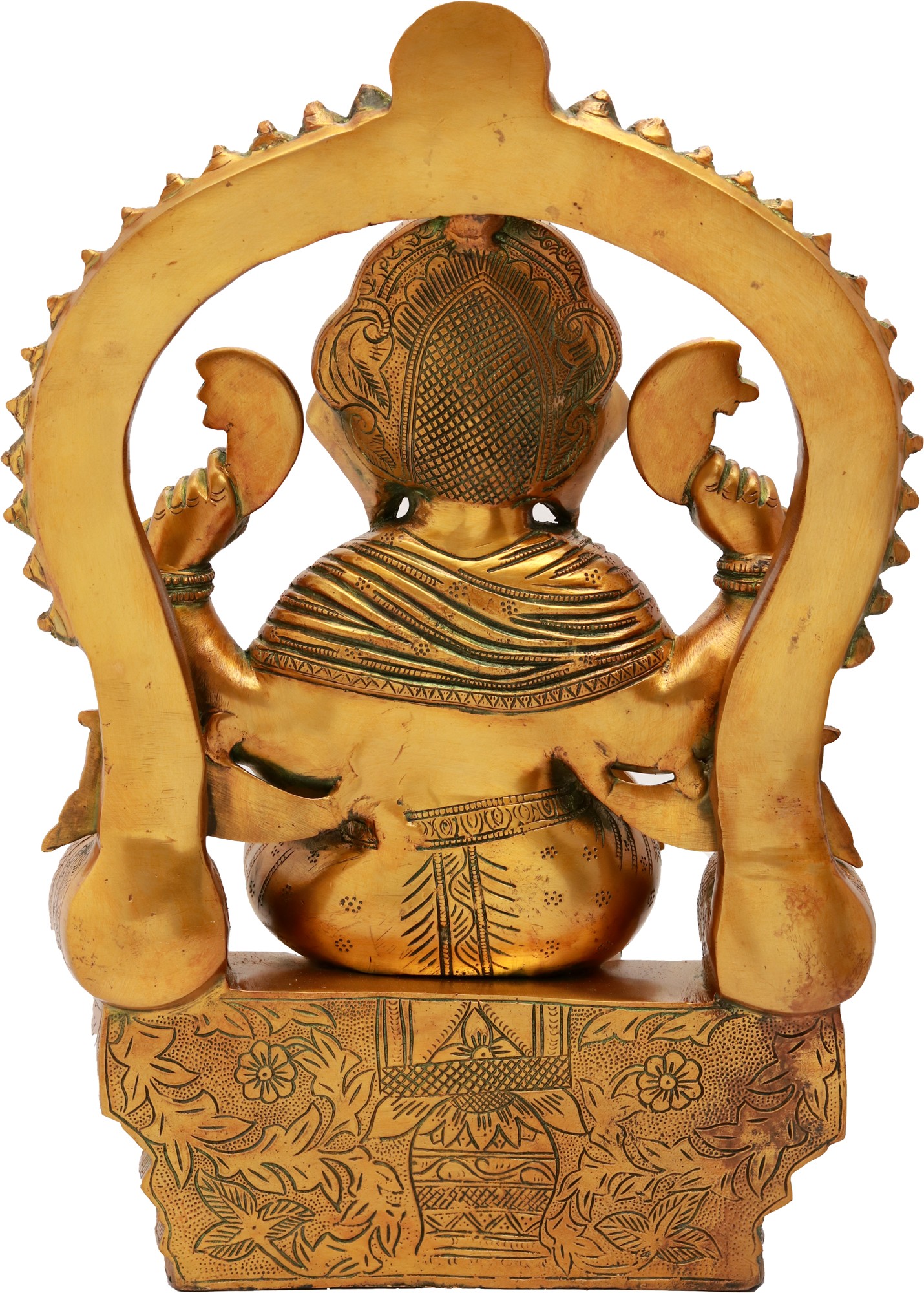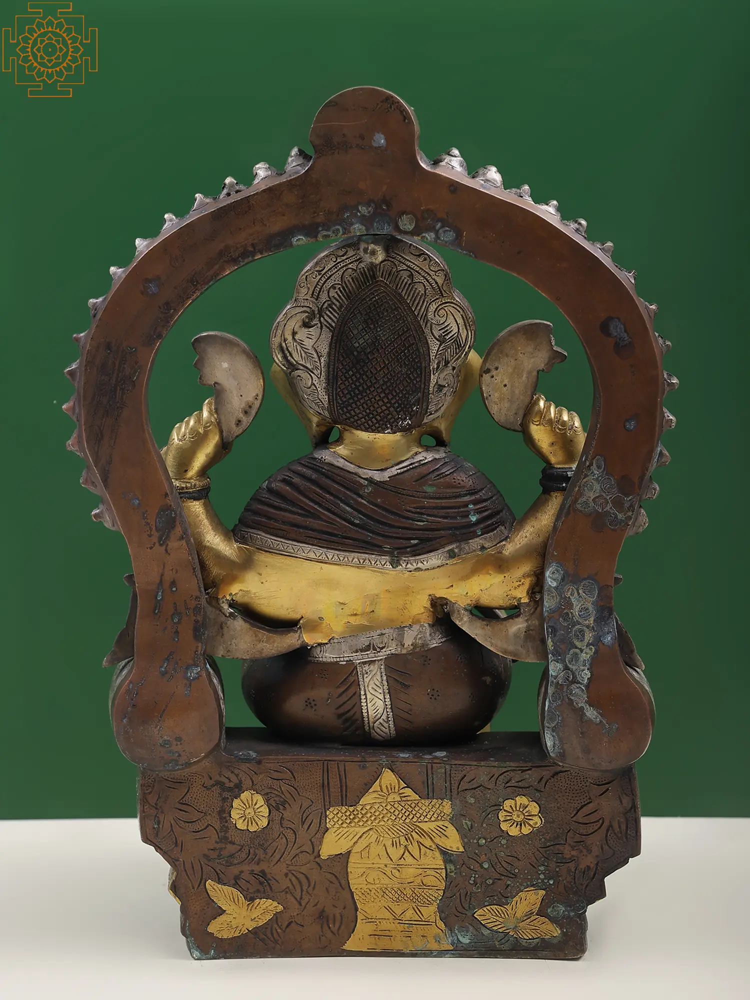 The throne upon which Ganesha is seated is a work of art in itself, designed to reflect his divine status. Its grandeur is emphasized by the detailed carvings and the interplay of brass tones, creating a sense of opulence and permanence. The arched backdrop, adorned with intricate patterns and small figures, frames Ganesha beautifully, drawing the eye to his serene countenance. The overall composition suggests a deity at the zenith of his power and wisdom, a benevolent king ruling over the realms of knowledge and fortune. This statue is more than an artistic expression; it is a symbol of devotion, a conduit for blessings, and a timeless reminder of the profound spiritual traditions of India. Each curve and detail has been meticulously shaped by hand, ensuring that this piece carries the energy and intention of its creators.