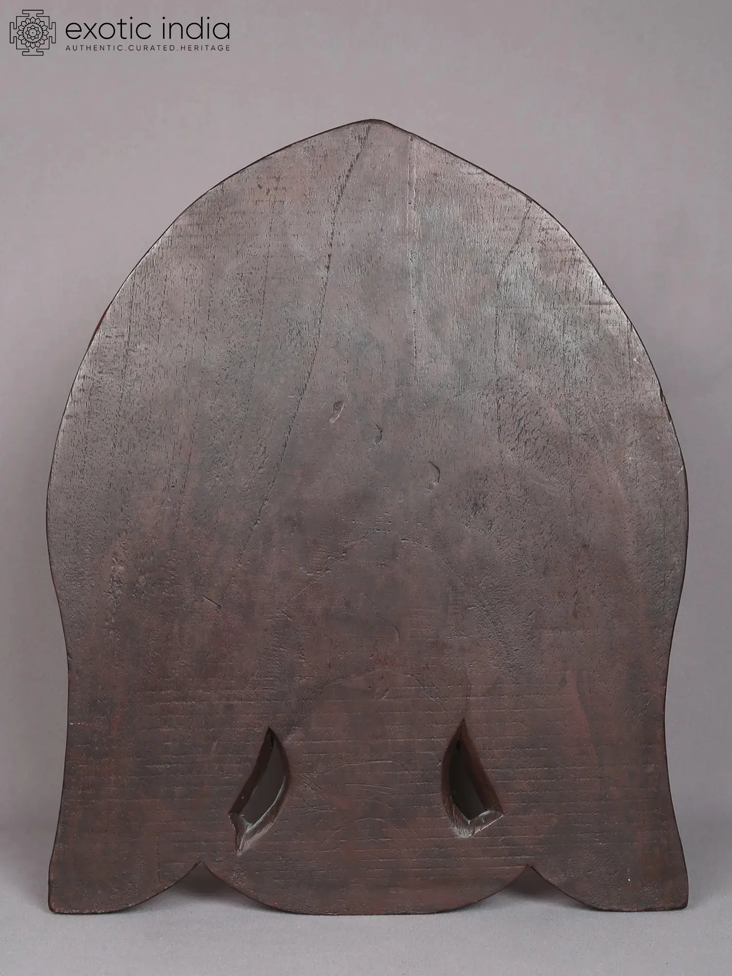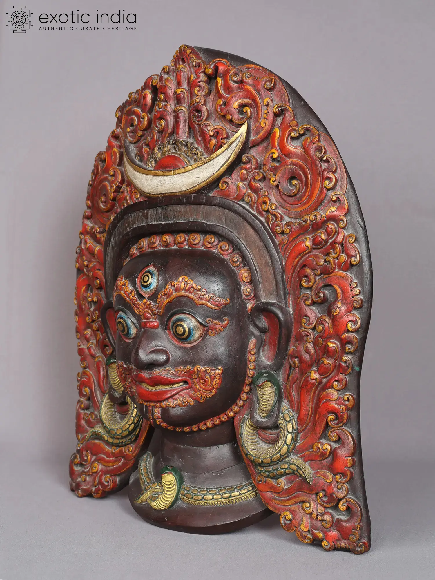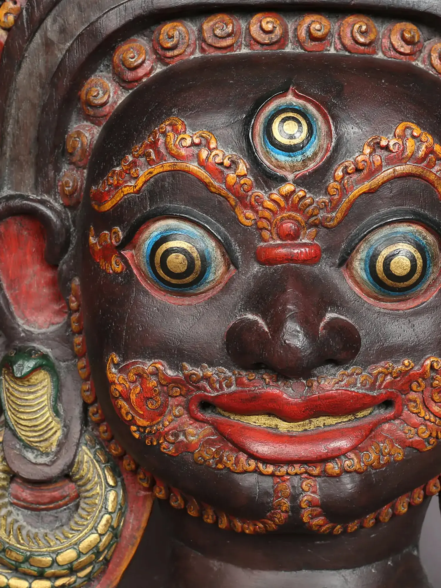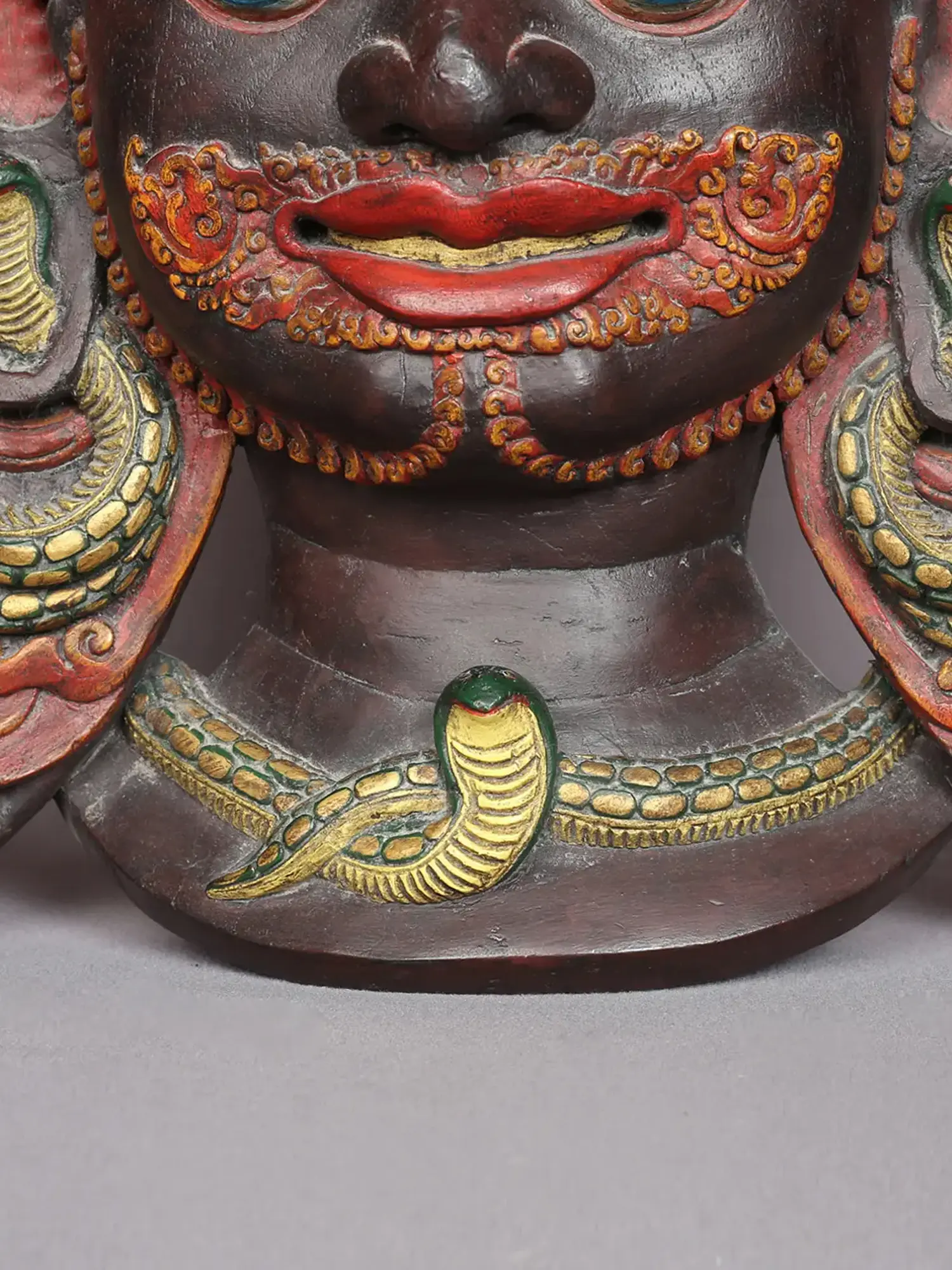 Bhairava embodies the quintessential attributes of wrathful Buddhist deities, characterized by his bulging eyes, facial hair, and agape mouth. His striking appearance includes two imposing circular earrings fashioned in the likeness of snakes. His flaming locks of hair, a substantial urna symbolizing illumination, a curly beard, a prominent mustache, well-defined eyebrows, and a serpent gracefully winding around his neck, embellishing an intricate necklace, further define Bhairava's visage. It is worth noting that the veneration of serpents or nagas has been a deeply rooted tradition in Nepal since ancient times.