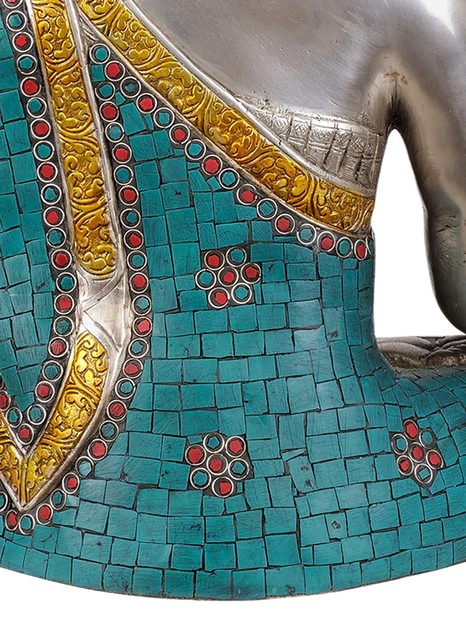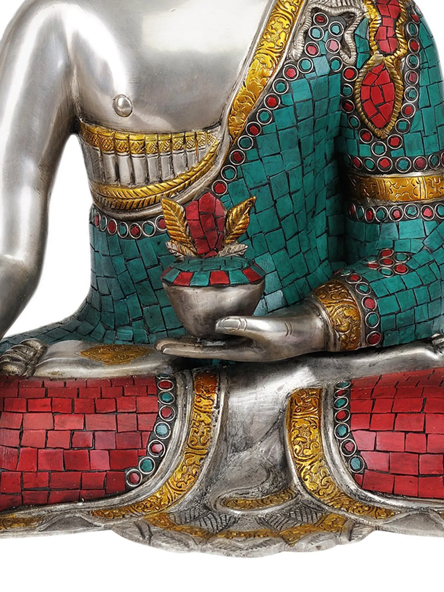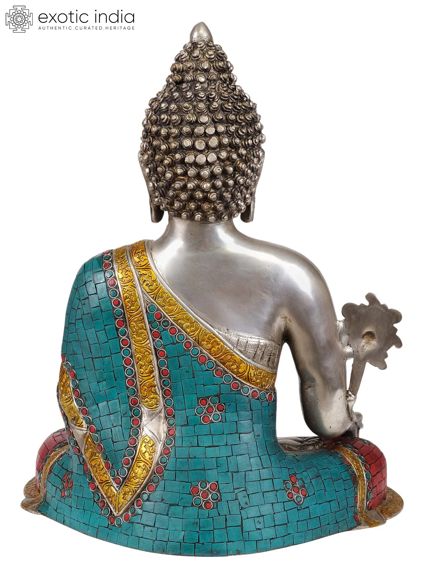 17" Tibetan Buddhist God Medicine Buddha -The Unfailing Healer of the Ills of Samsara (In Silver Hue with Fine Inlay Work) In Brass