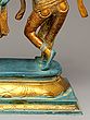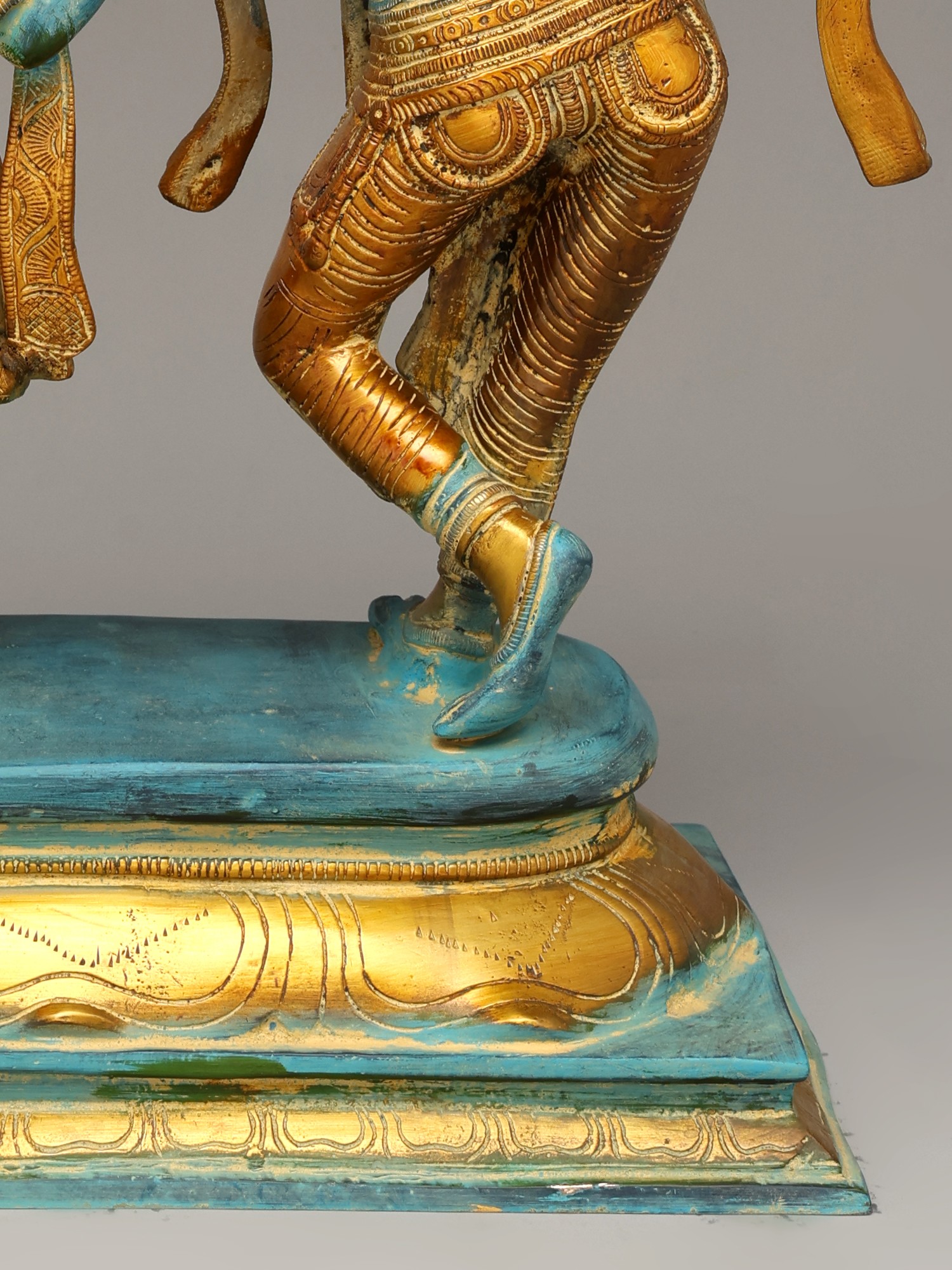 There is no mistaking the dynamic stance of the figurines. From Krishna's neck tilted graciously in the direction of His dancing lover and the smooth musculature of His contorted torso, to Radha's stance caught amidst graceful motion. The pedestal they are on is a wider version of the traditional inverted lotus pedestal, placed on a quadrilateral block engraved with lotus petals.